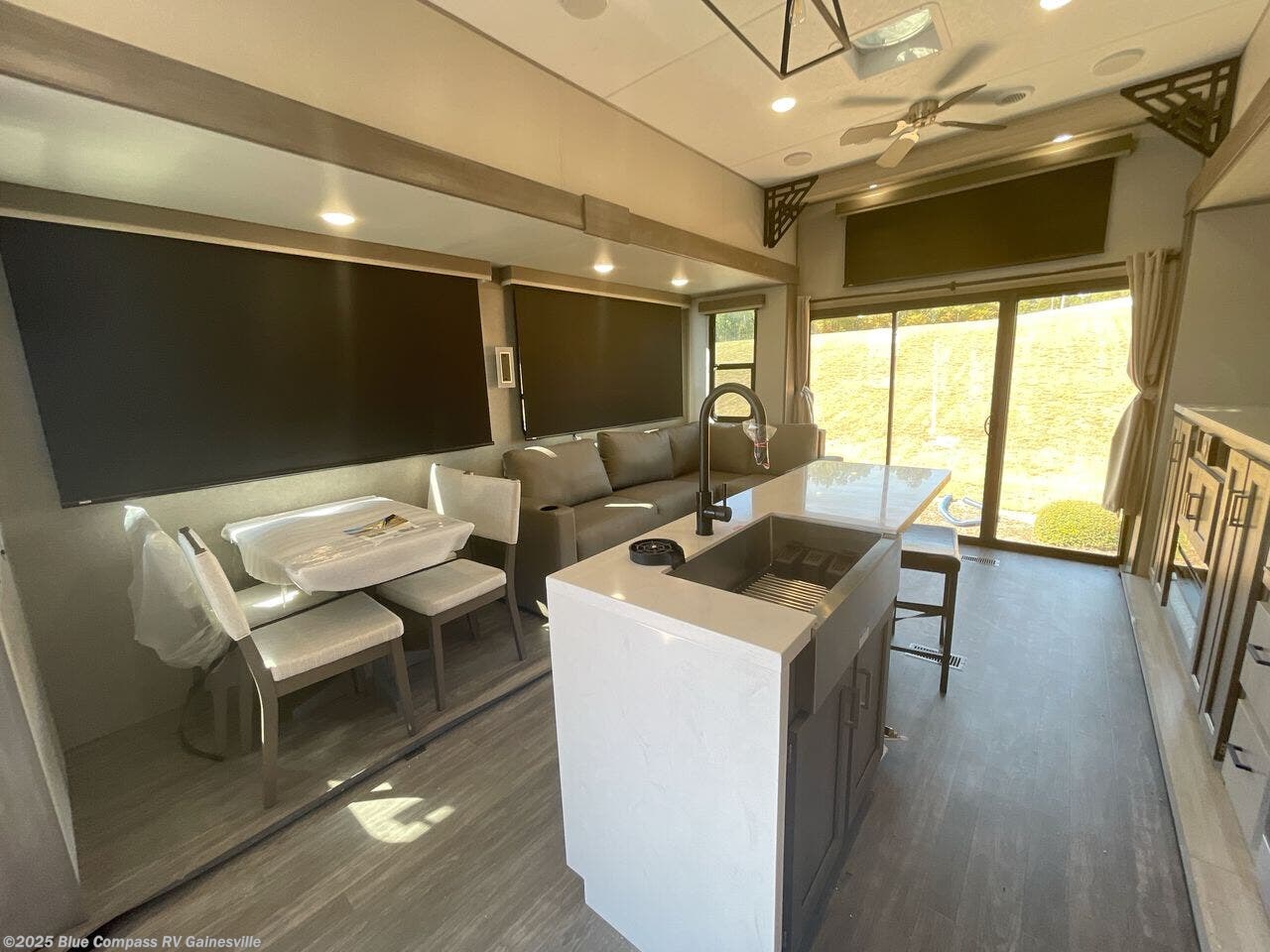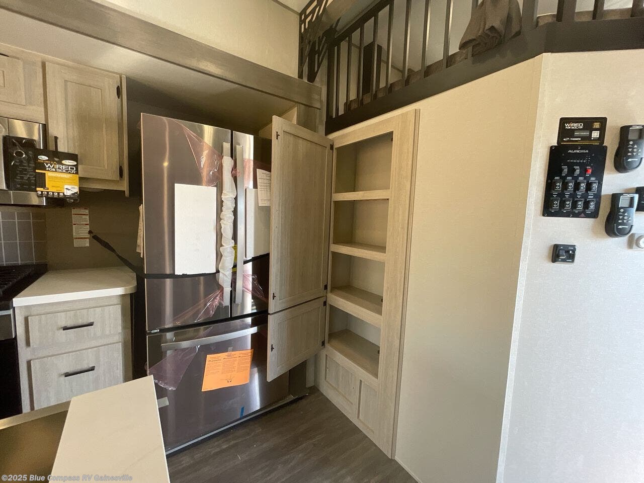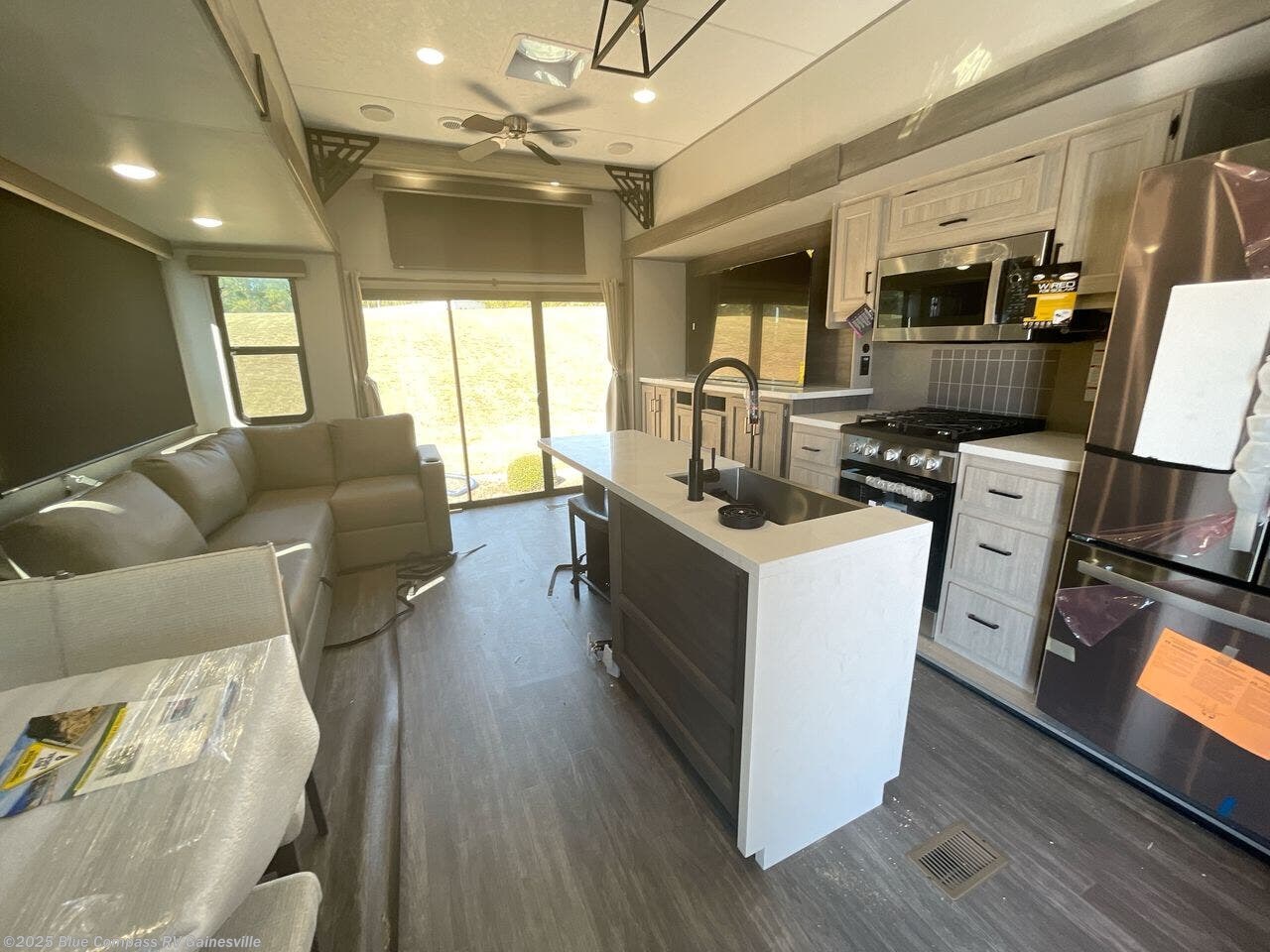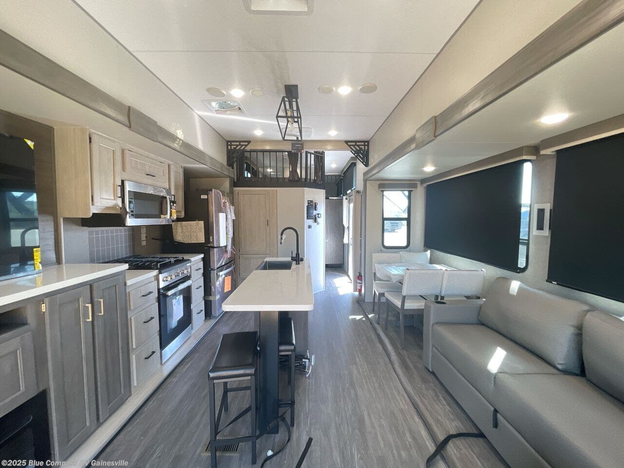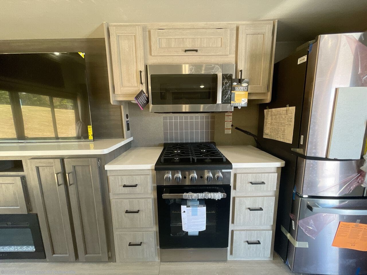 There is much to love about this destination trailer! Starting with the loft that has two queen beds, a wardrobe/storage, and a custom 58" x 71" bed. Downstairs there's a private bedroom with a king bed slide, a fireplace, and its very own private full bathroom complete with a dual sink vanity. The main living area has a huge bi-fold sleeper sectional sofa so you can fit even more guests, or just relax and watch the TV on the power lift in the entertainment center. The kitchen is well-equipped with a residential refrigerator, microwave, and pantry. The centerpiece here is a kitchen island with a deep basin farm-style sink and bar stool seating so your group can gather together and make new memories.