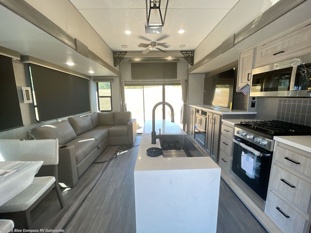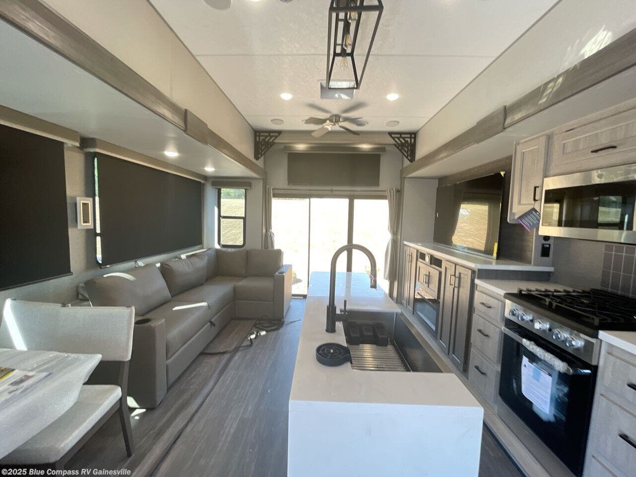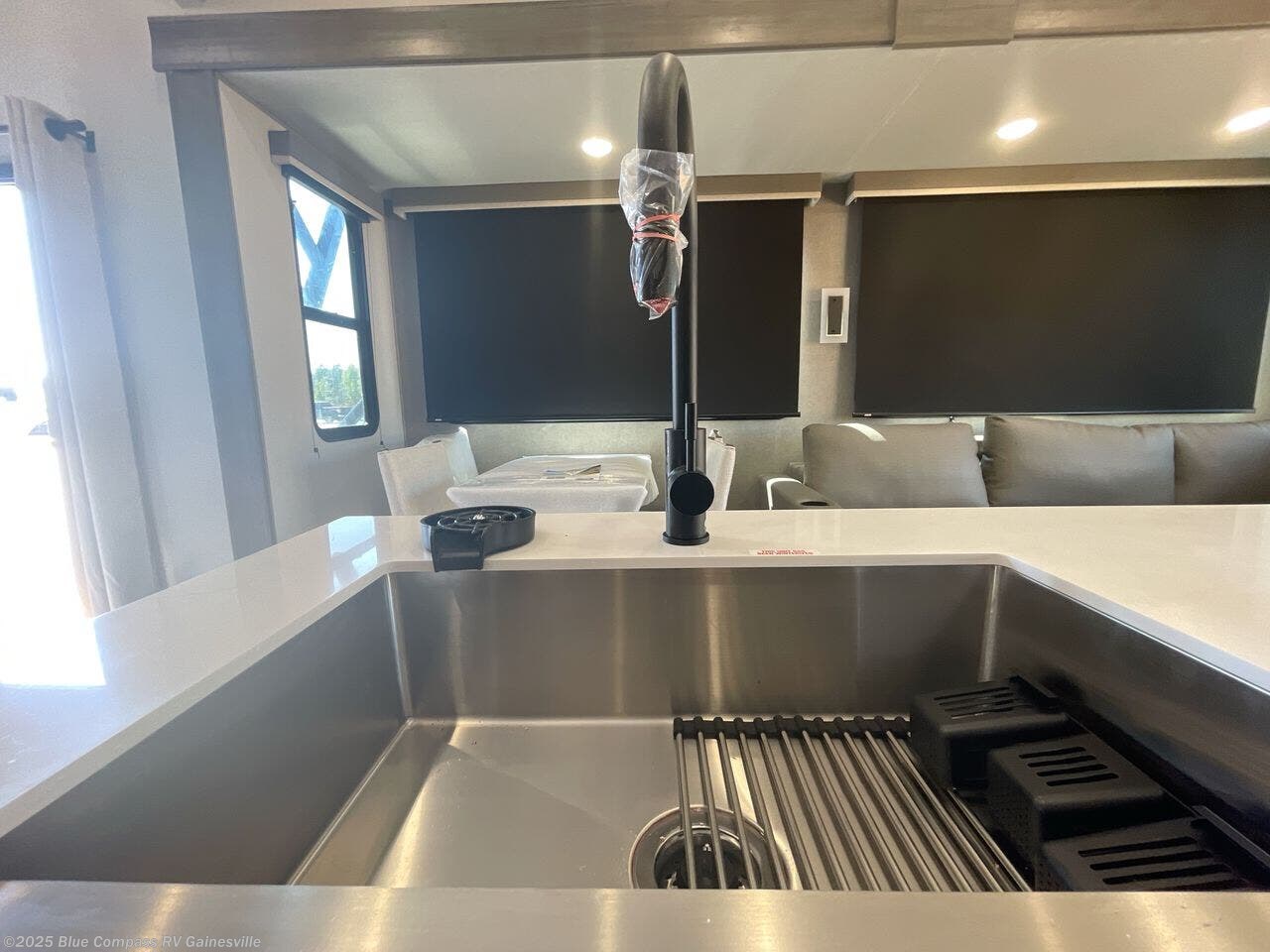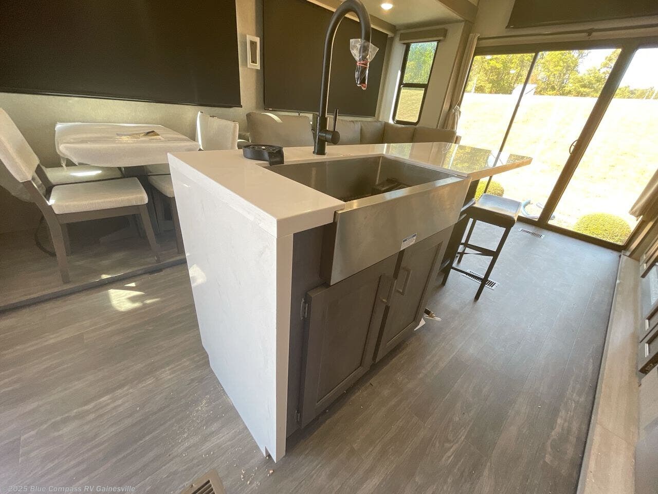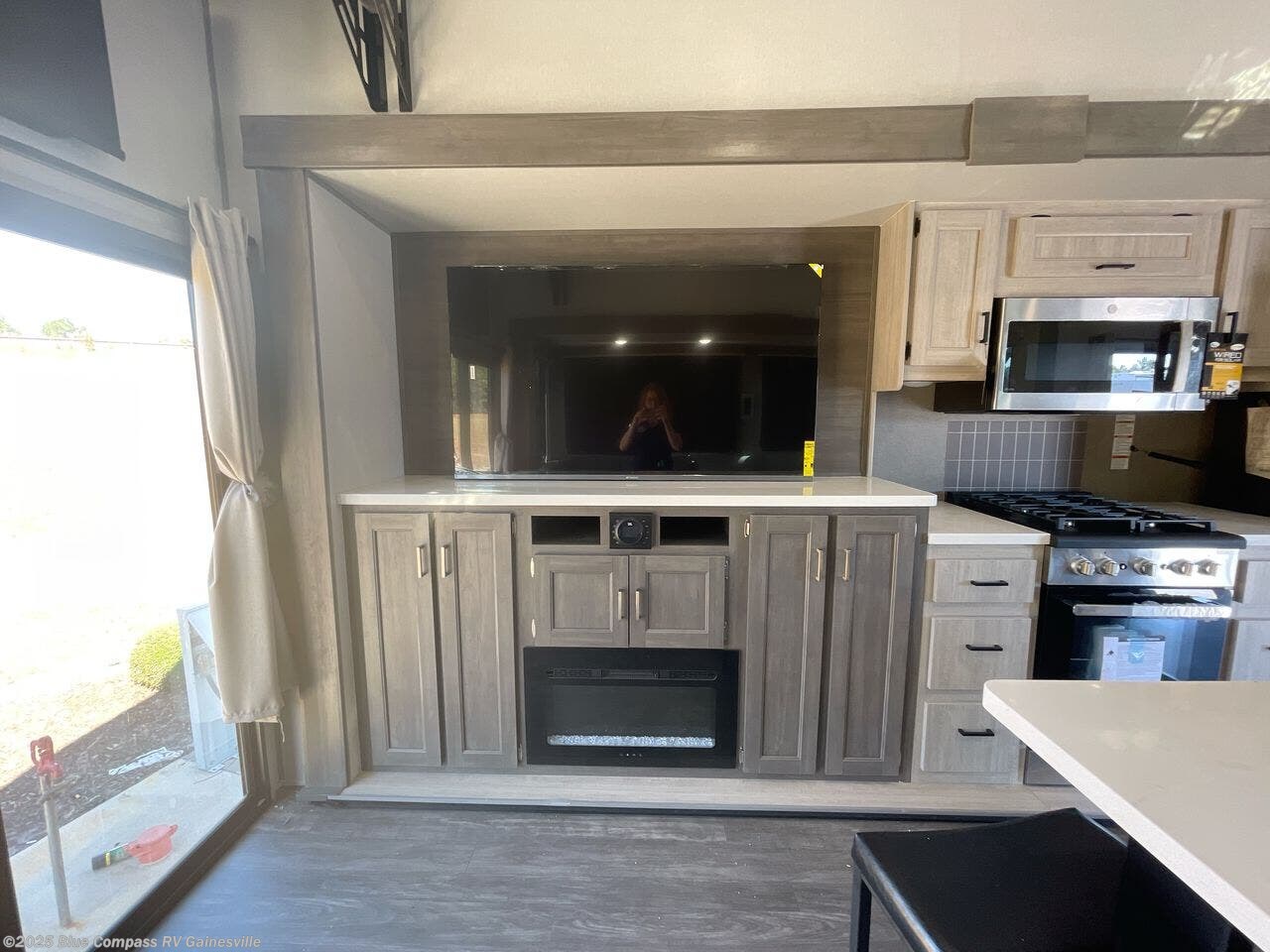 There is much to love about this destination trailer! Starting with the loft that has two queen beds, a wardrobe/storage, and a custom 58" x 71" bed. Downstairs there's a private bedroom with a king bed slide, a fireplace, and its very own private full bathroom complete with a dual sink vanity. The main living area has a huge bi-fold sleeper sectional sofa so you can fit even more guests, or just relax and watch the TV on the power lift in the entertainment center. The kitchen is well-equipped with a residential refrigerator, microwave, and pantry. The centerpiece here is a kitchen island with a deep basin farm-style sink and bar stool seating so your group can gather together and make new memories.