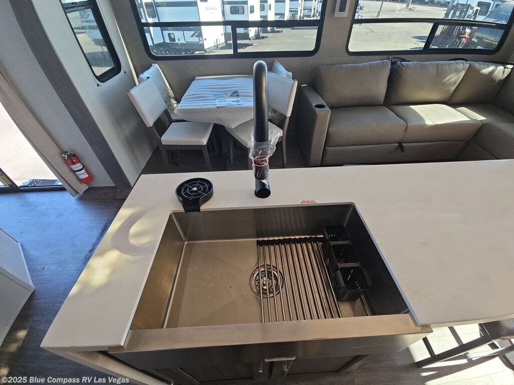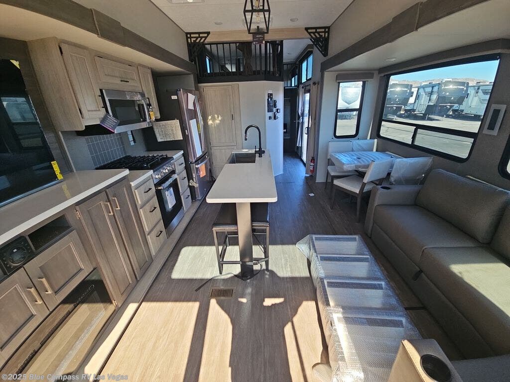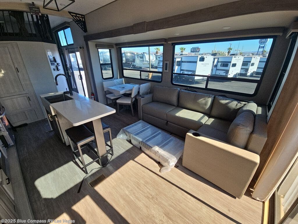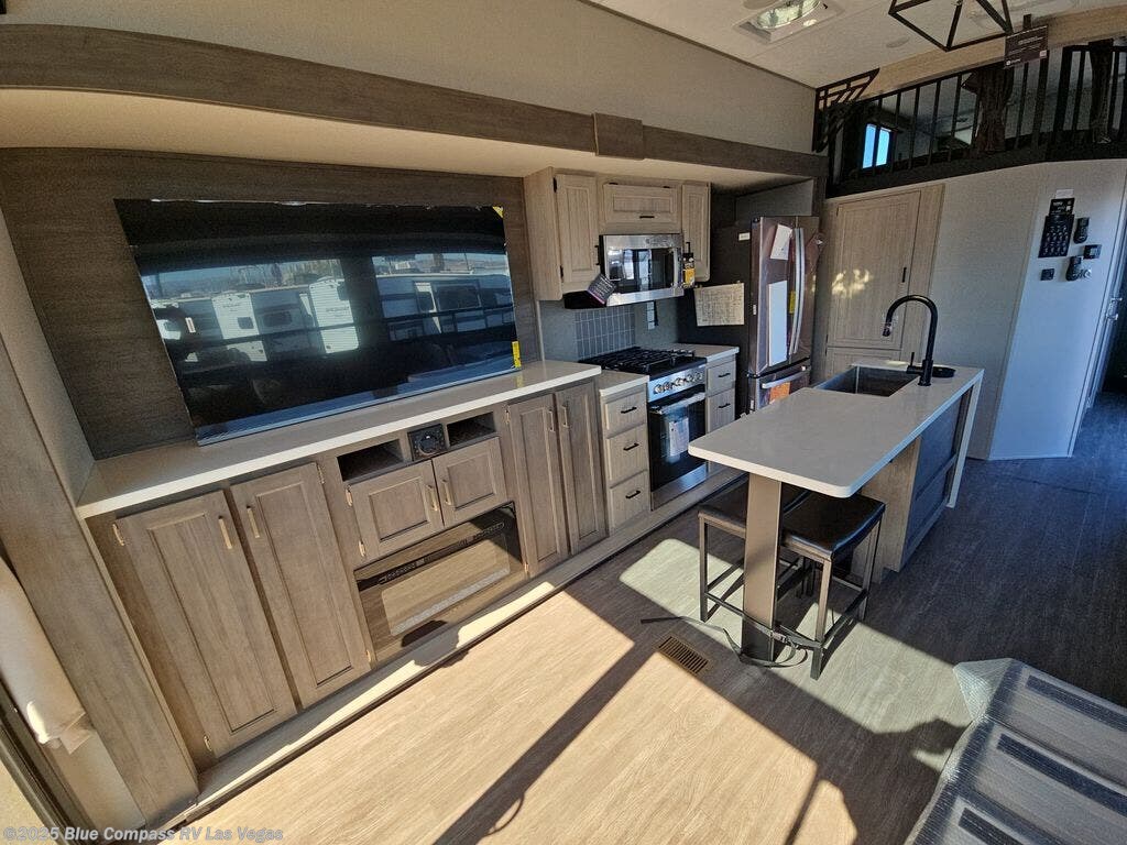 There is much to love about this destination trailer! Starting with the loft that has two queen beds, a wardrobe/storage, and a custom 58" x 71" bed. Downstairs there's a private bedroom with a king bed slide, a fireplace, and its very own private full bathroom complete with a dual sink vanity. The main living area has a huge bi-fold sleeper sectional sofa so you can fit even more guests, or just relax and watch the TV on the power lift in the entertainment center. The kitchen is well-equipped with a residential refrigerator, microwave, and pantry. The centerpiece here is a kitchen island with a deep basin farm-style sink and bar stool seating so your group can gather together and make new memories.