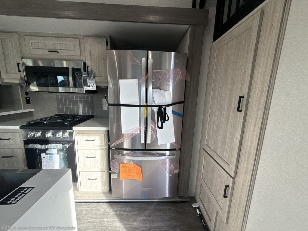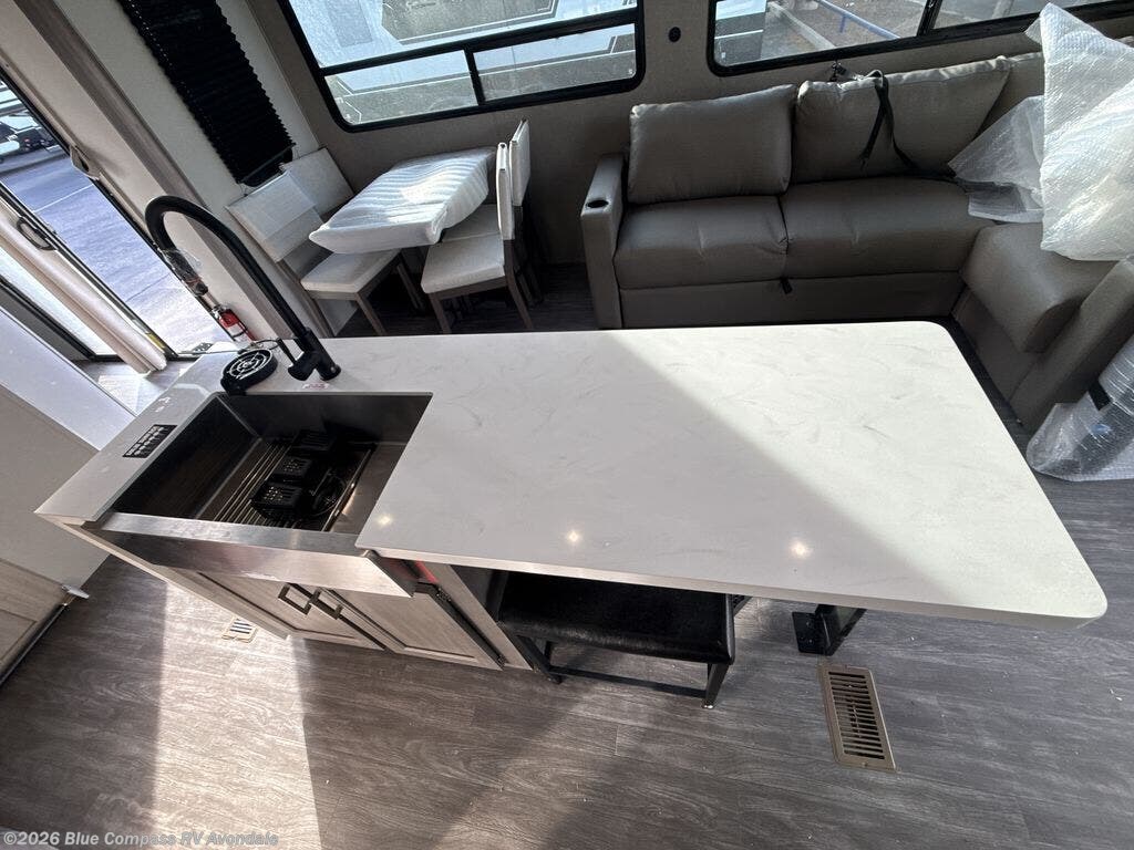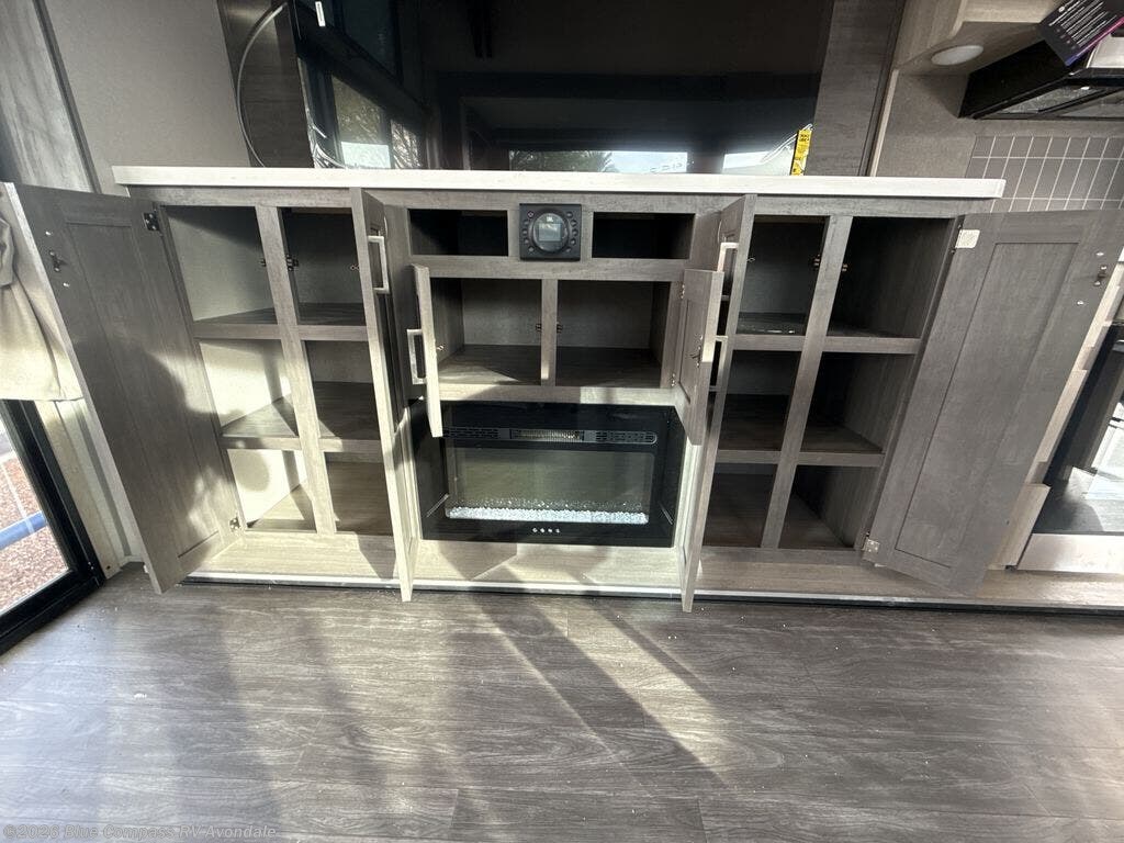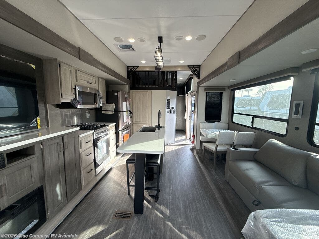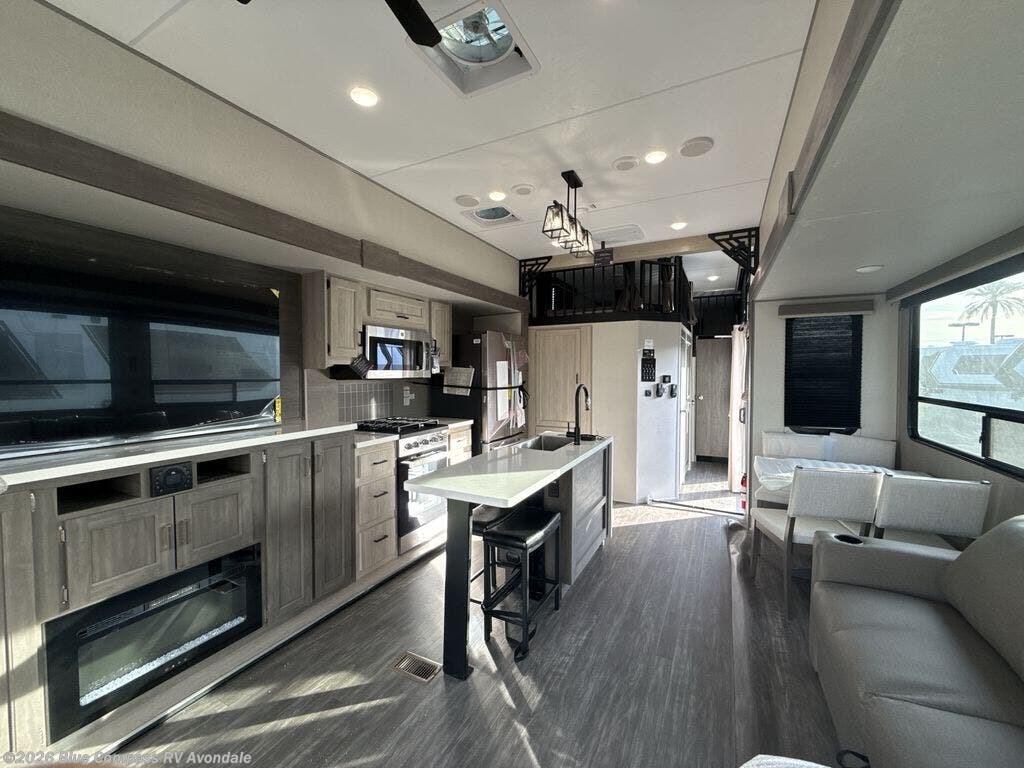 There is much to love about this destination trailer! Starting with the loft that has two queen beds, a wardrobe/storage, and a custom 58" x 71" bed. Downstairs there's a private bedroom with a king bed slide, a fireplace, and its very own private full bathroom complete with a dual sink vanity. The main living area has a huge bi-fold sleeper sectional sofa so you can fit even more guests, or just relax and watch the TV on the power lift in the entertainment center. The kitchen is well-equipped with a residential refrigerator, microwave, and pantry. The centerpiece here is a kitchen island with a deep basin farm-style sink and bar stool seating so your group can gather together and make new memories.