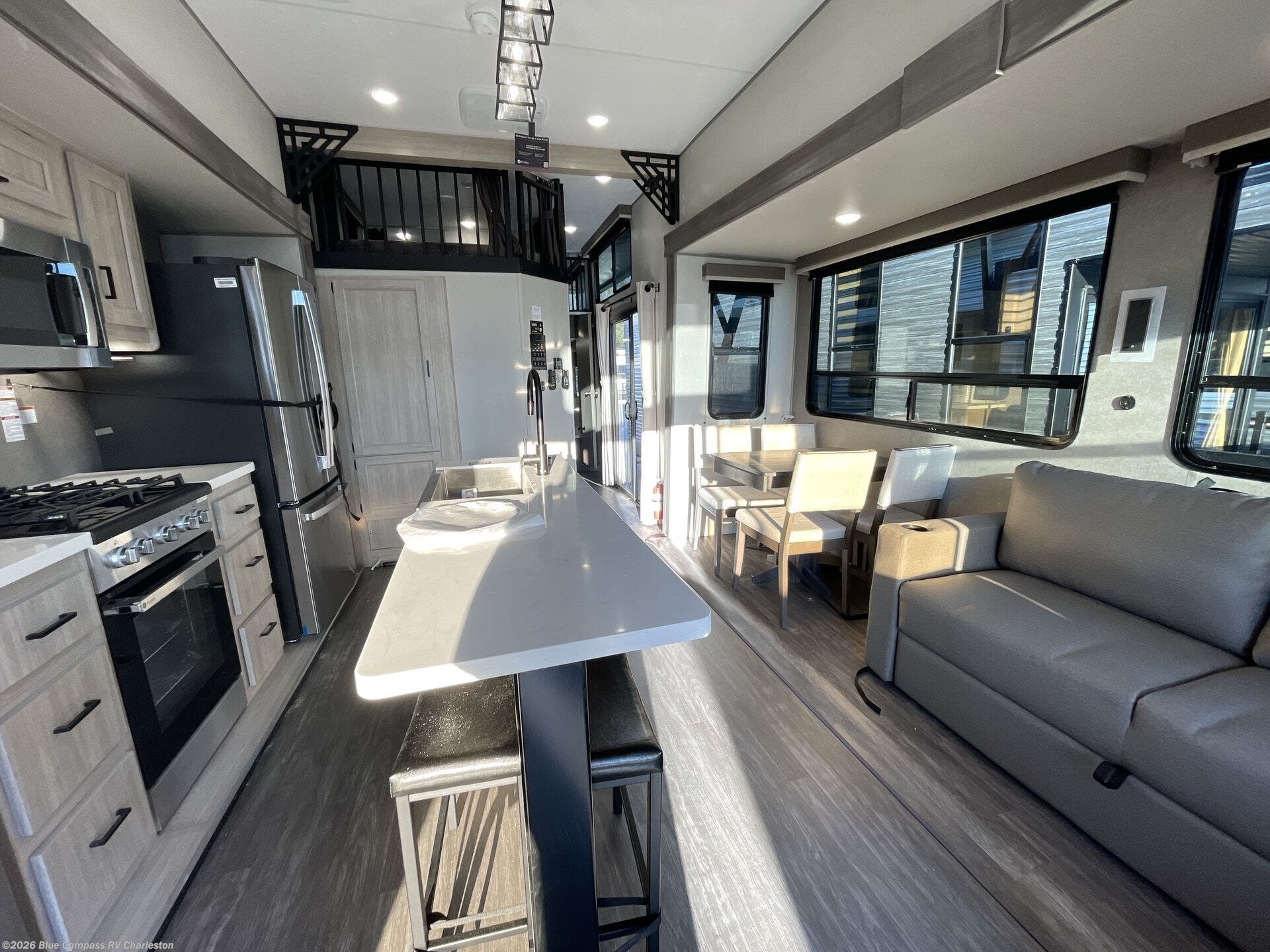 There is much to love about this destination trailer! Starting with the loft that has two queen beds, a wardrobe/storage, and a custom 58" x 71" bed. Downstairs there's a private bedroom with a king bed slide, a fireplace, and its very own private full bathroom complete with a dual sink vanity. The main living area has a huge bi-fold sleeper sectional sofa so you can fit even more guests, or just relax and watch the TV on the power lift in the entertainment center. The kitchen is well-equipped with a residential refrigerator, microwave, and pantry. The centerpiece here is a kitchen island with a deep basin farm-style sink and bar stool seating so your group can gather together and make new memories.
