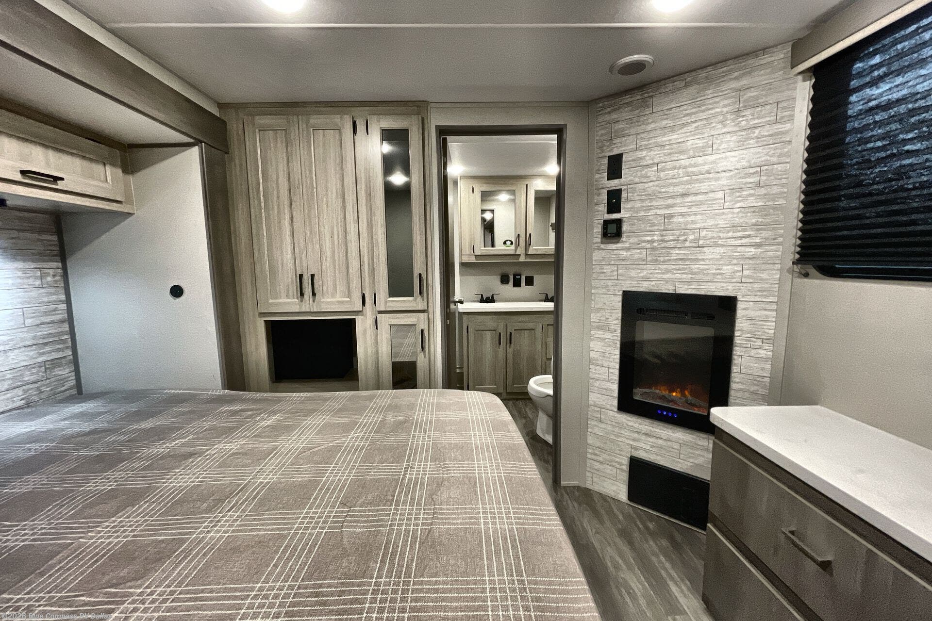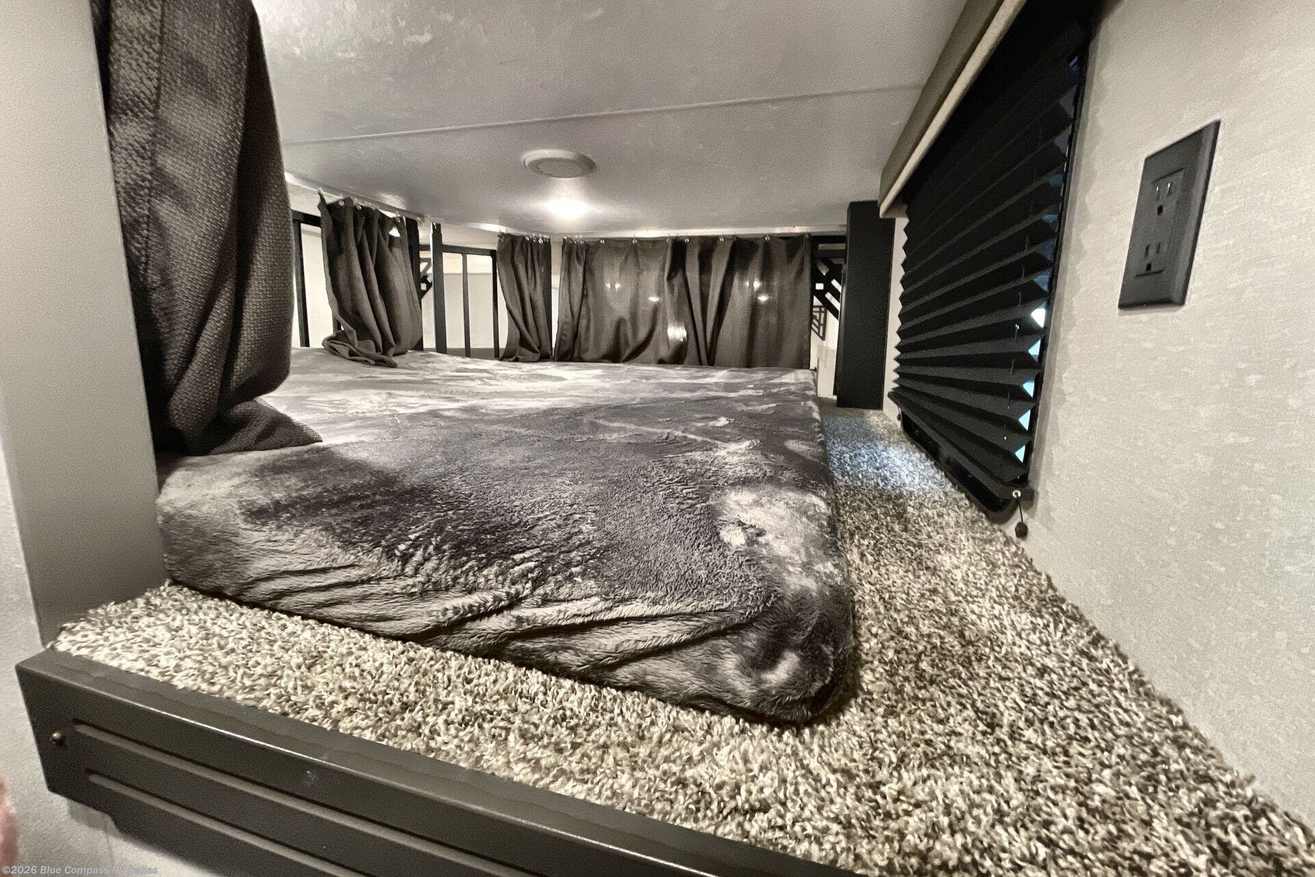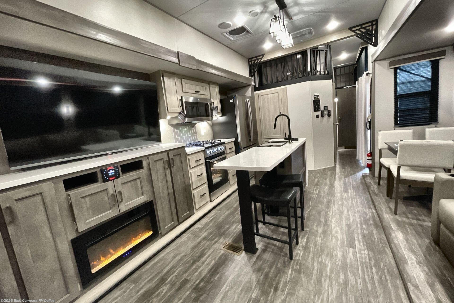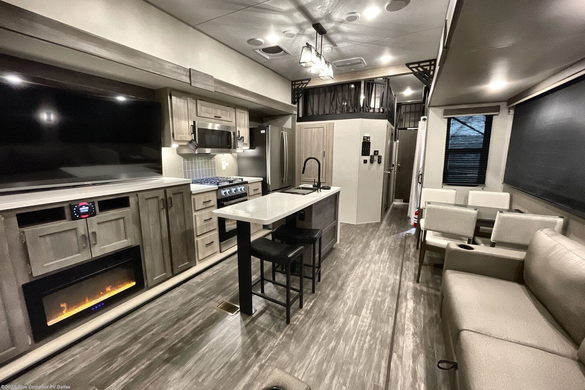 There is much to love about this destination trailer! Starting with the loft that has two queen beds, a wardrobe/storage, and a custom 58" x 71" bed. Downstairs there's a private bedroom with a king bed slide, a fireplace, and its very own private full bathroom complete with a dual sink vanity. The main living area has a huge bi-fold sleeper sectional sofa so you can fit even more guests or just relax and enjoy the entertainment center. The kitchen is well-equipped with a residential refrigerator, microwave, and pantry. The centerpiece here is a kitchen island with a deep basin farm-style sink and bar stool seating so your group can gather together and make new memories.