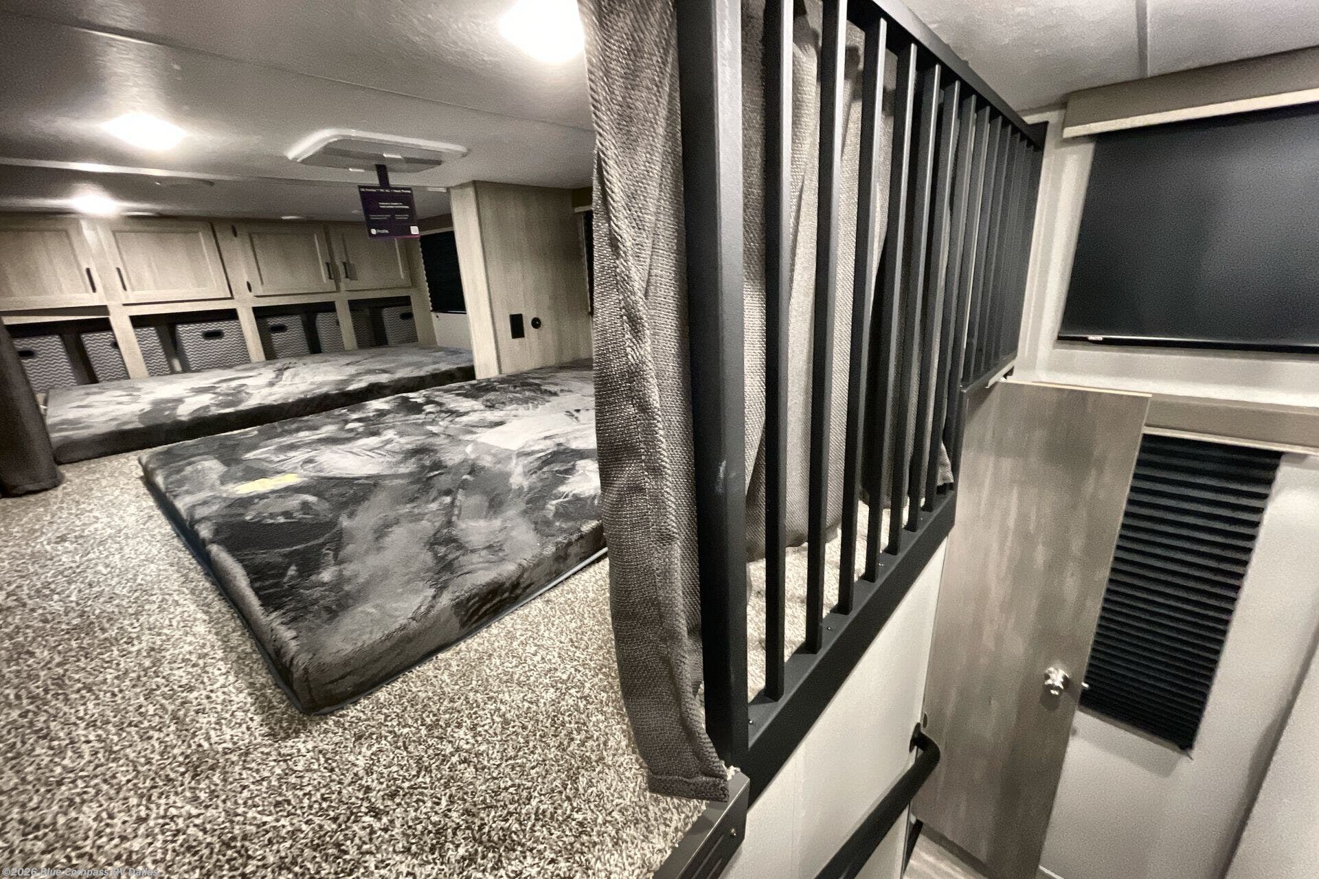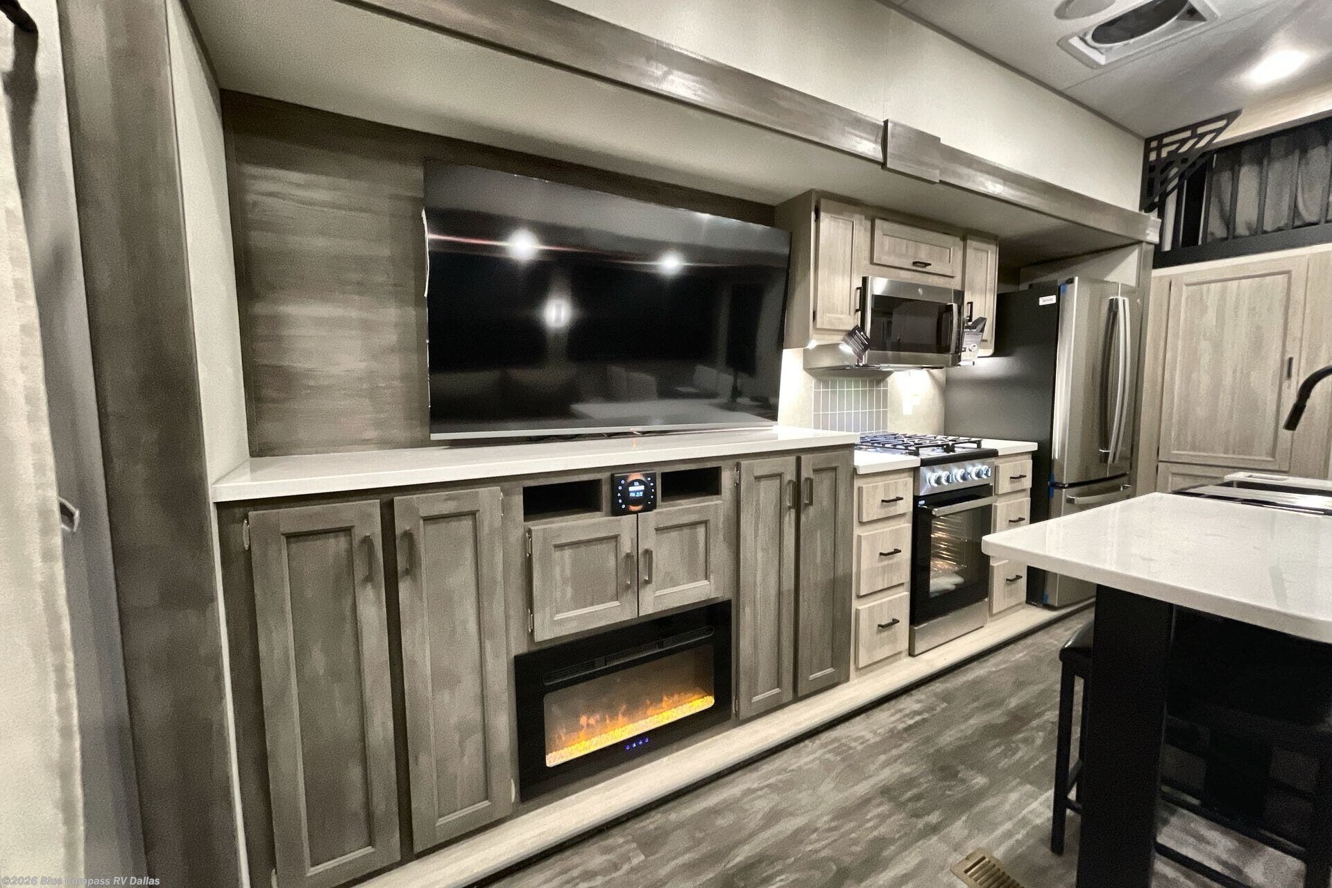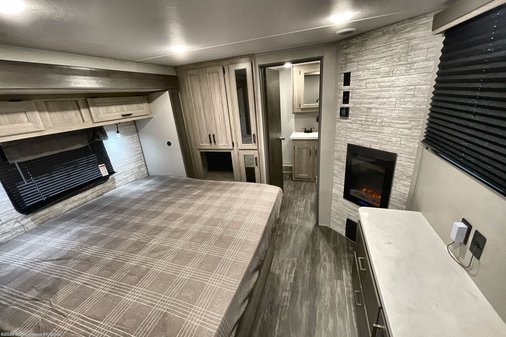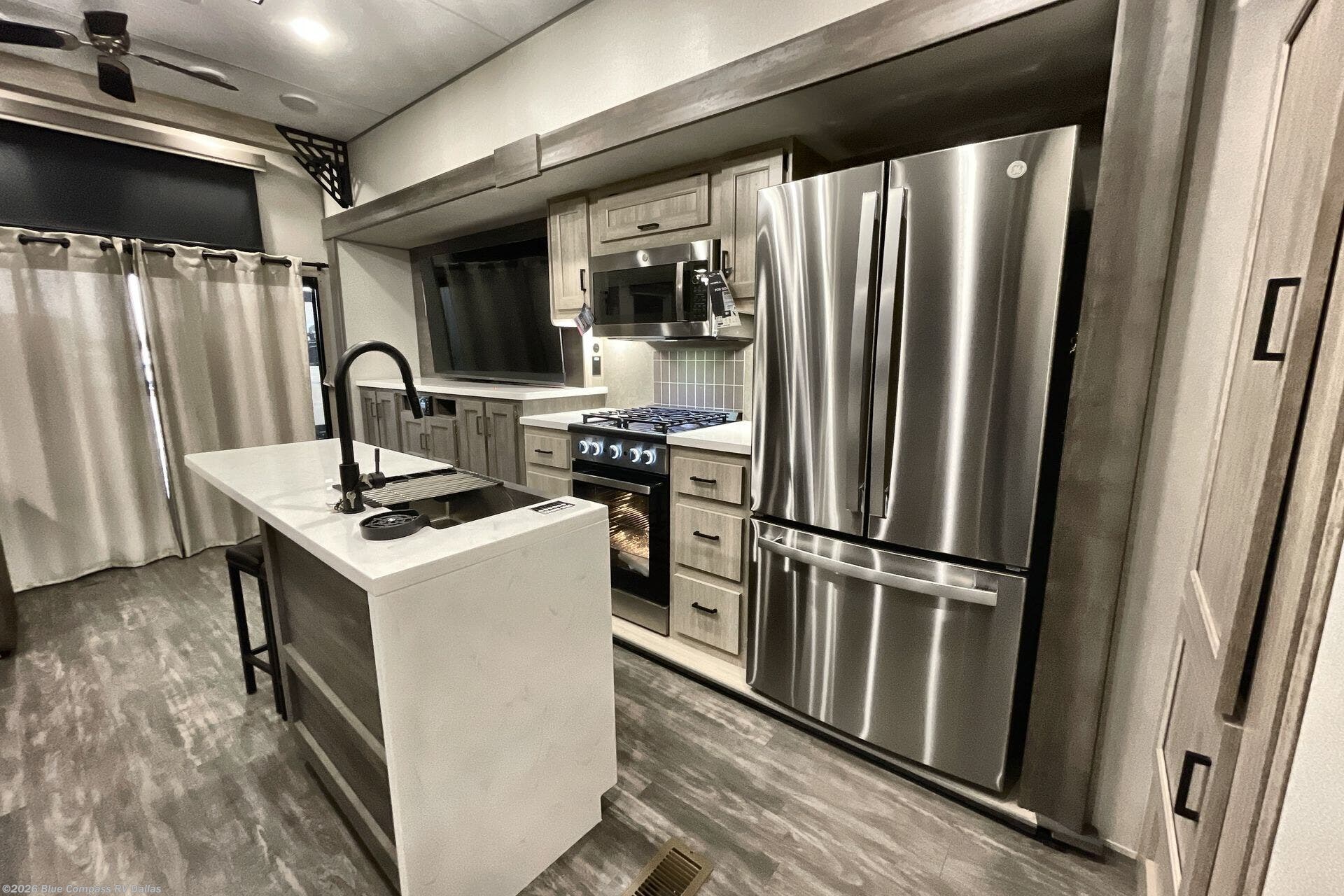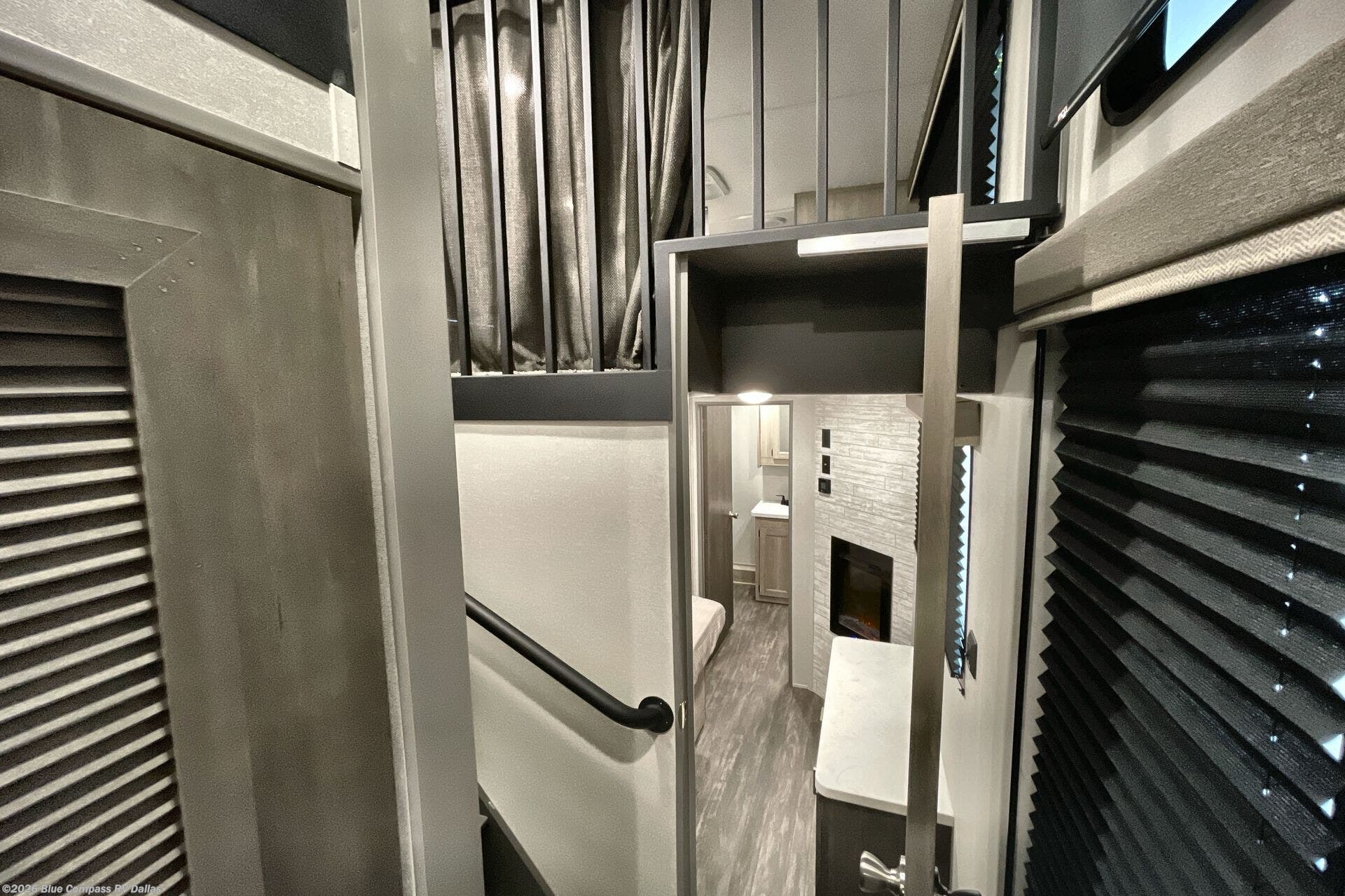 There is much to love about this destination trailer! Starting with the loft that has two queen beds, a wardrobe/storage, and a custom 58" x 71" bed. Downstairs there's a private bedroom with a king bed slide, a fireplace, and its very own private full bathroom complete with a dual sink vanity. The main living area has a huge bi-fold sleeper sectional sofa so you can fit even more guests or just relax and enjoy the entertainment center. The kitchen is well-equipped with a residential refrigerator, microwave, and pantry. The centerpiece here is a kitchen island with a deep basin farm-style sink and bar stool seating so your group can gather together and make new memories.