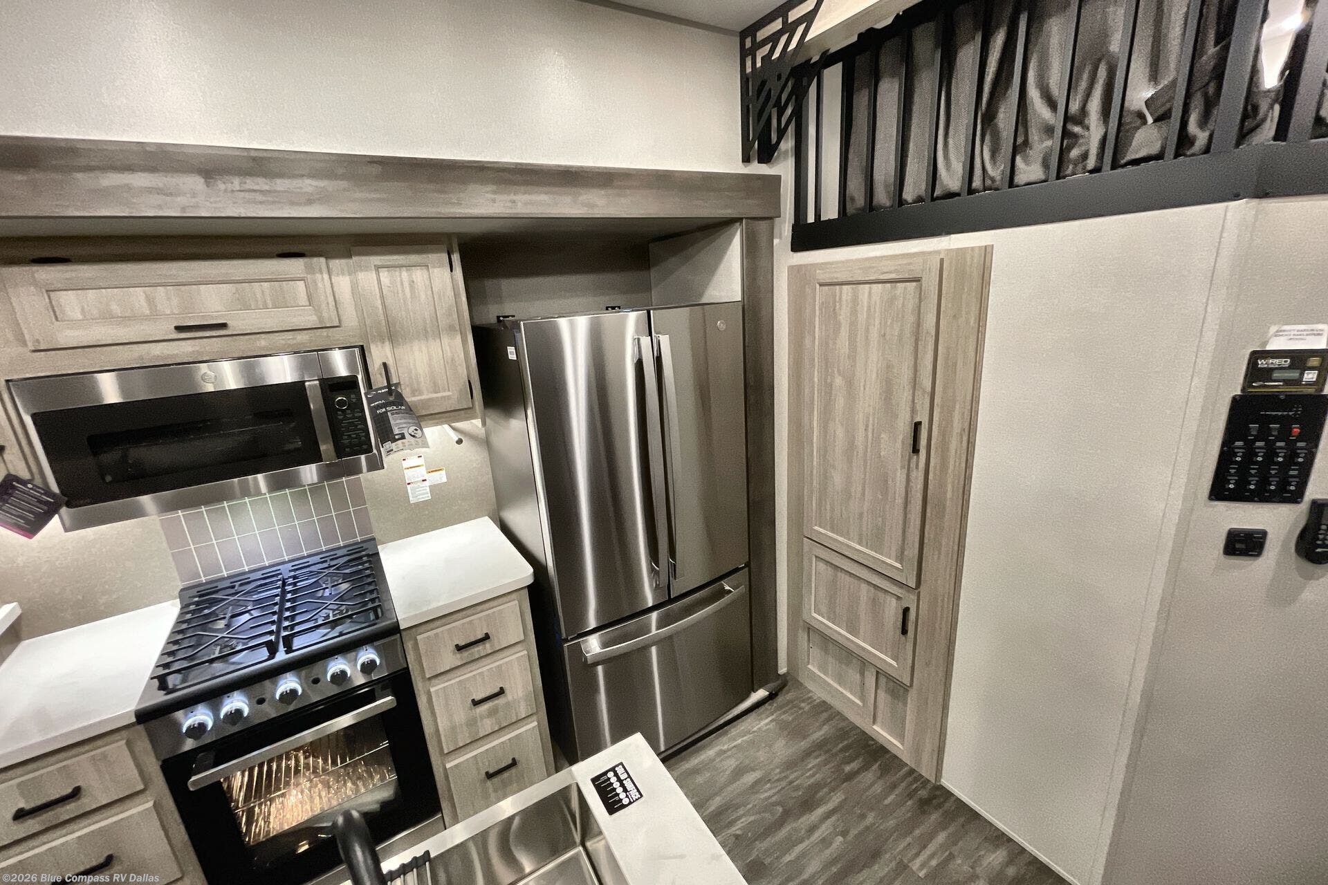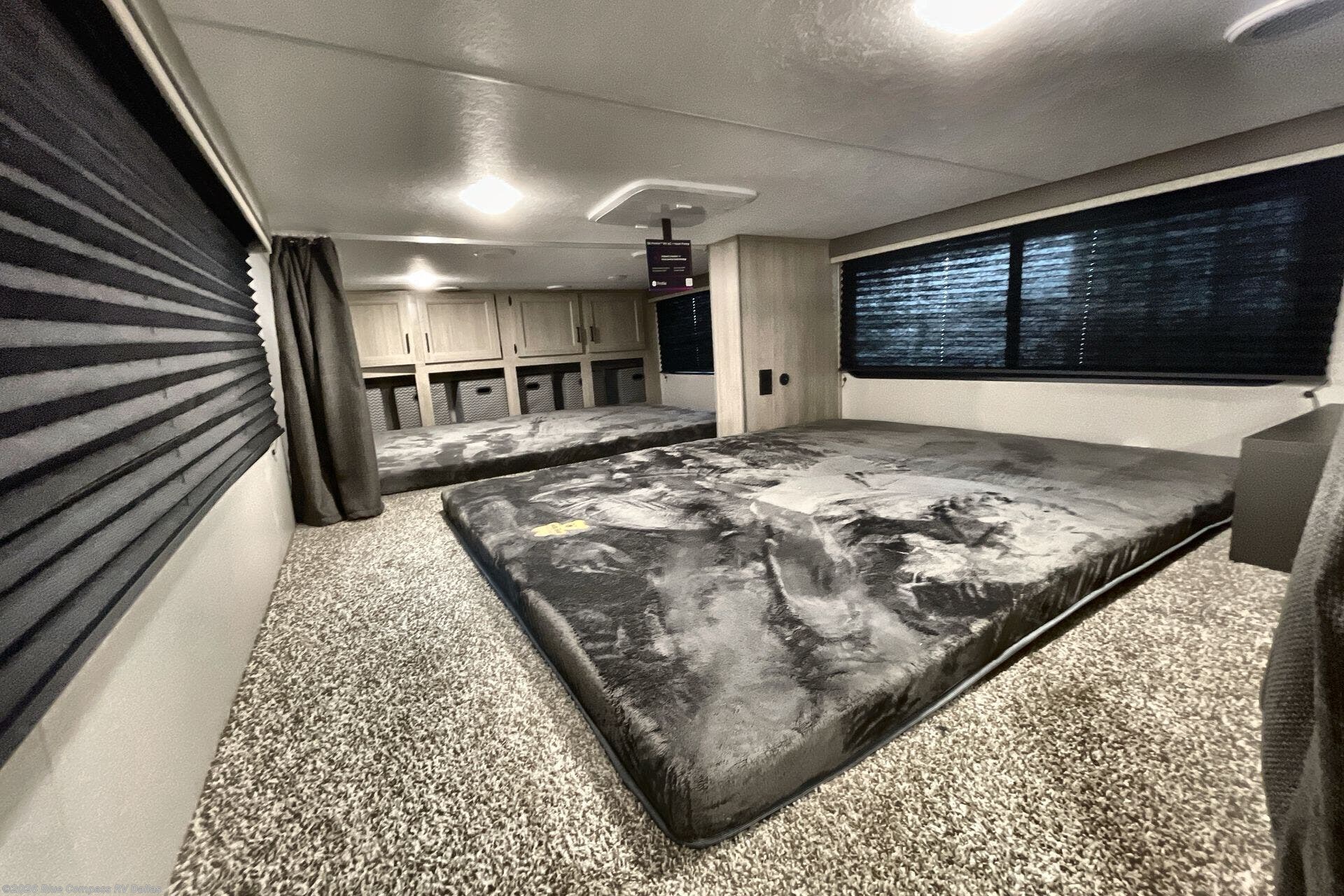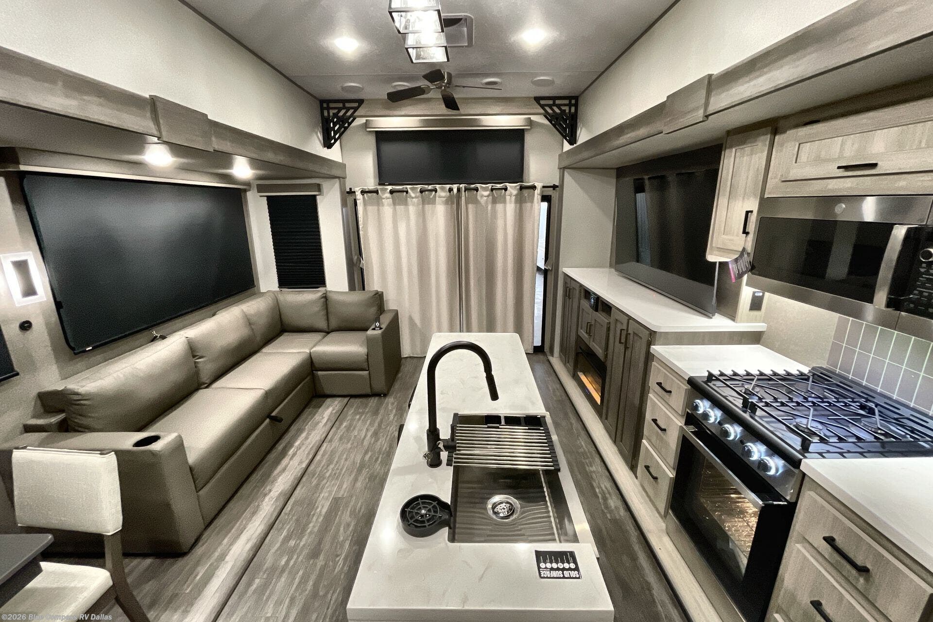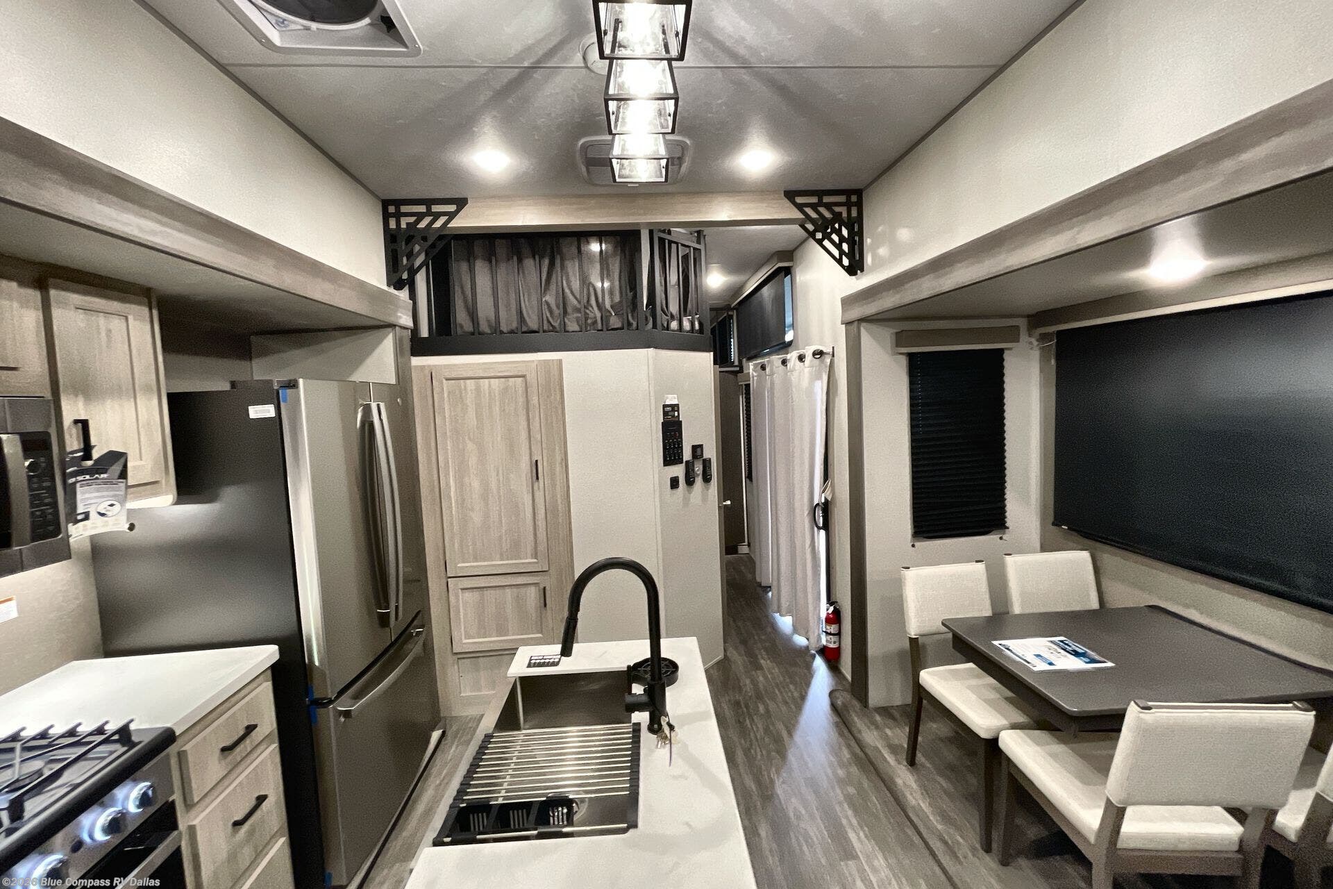 There is much to love about this destination trailer! Starting with the loft that has two queen beds, a wardrobe/storage, and a custom 58" x 71" bed. Downstairs there's a private bedroom with a king bed slide, a fireplace, and its very own private full bathroom complete with a dual sink vanity. The main living area has a huge bi-fold sleeper sectional sofa so you can fit even more guests or just relax and enjoy the entertainment center. The kitchen is well-equipped with a residential refrigerator, microwave, and pantry. The centerpiece here is a kitchen island with a deep basin farm-style sink and bar stool seating so your group can gather together and make new memories.