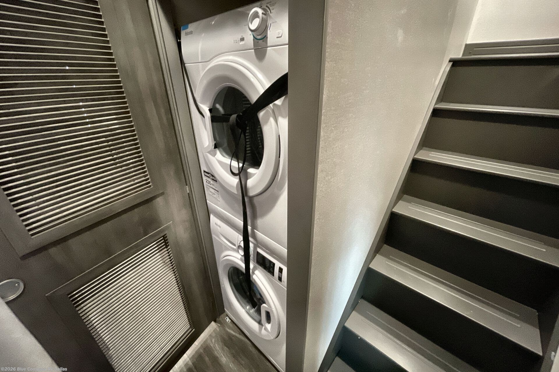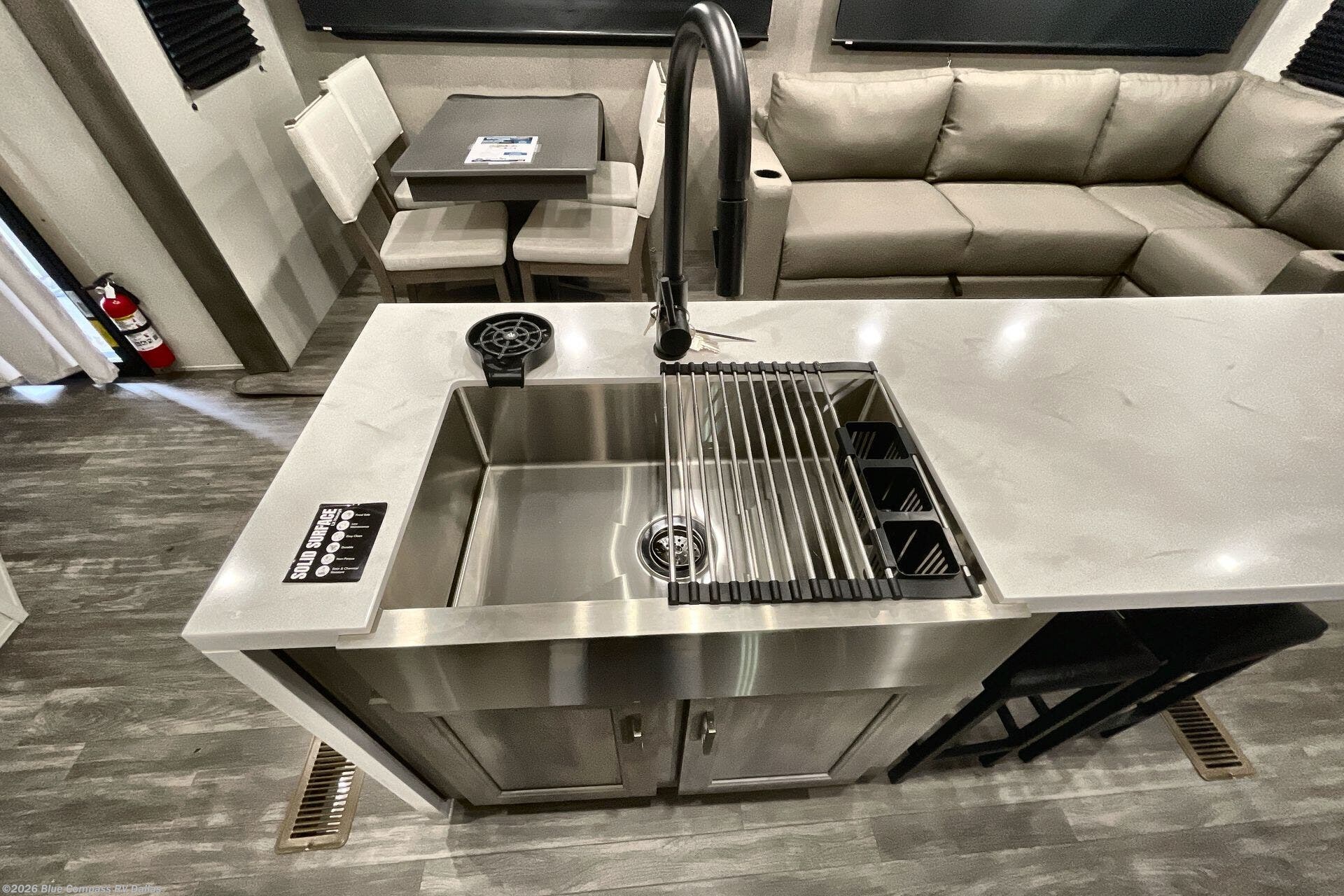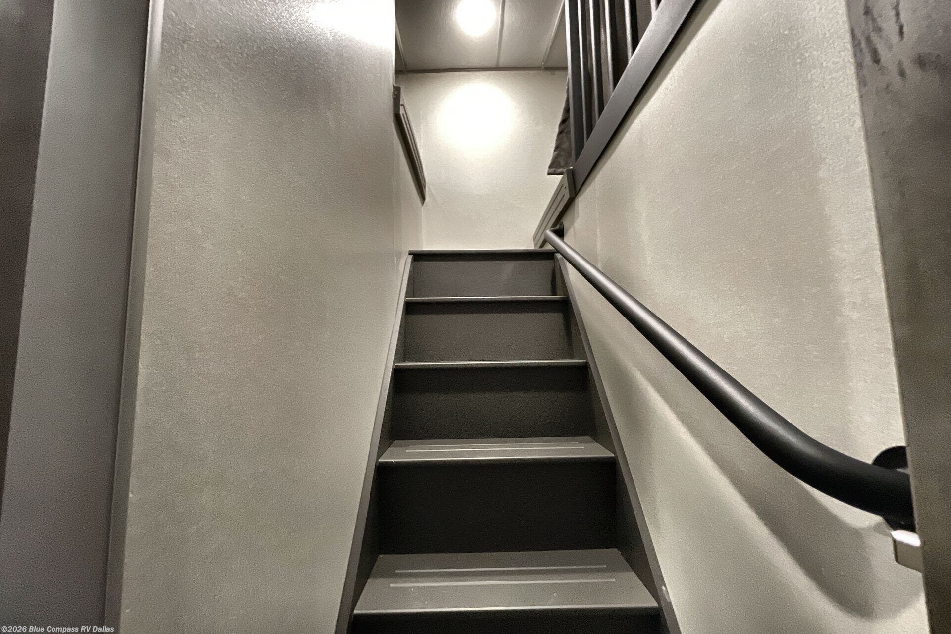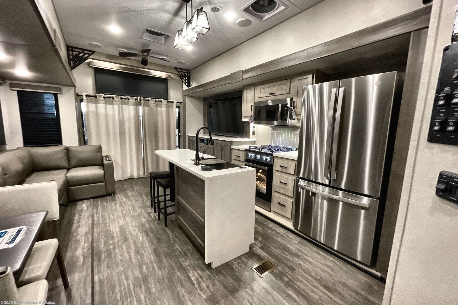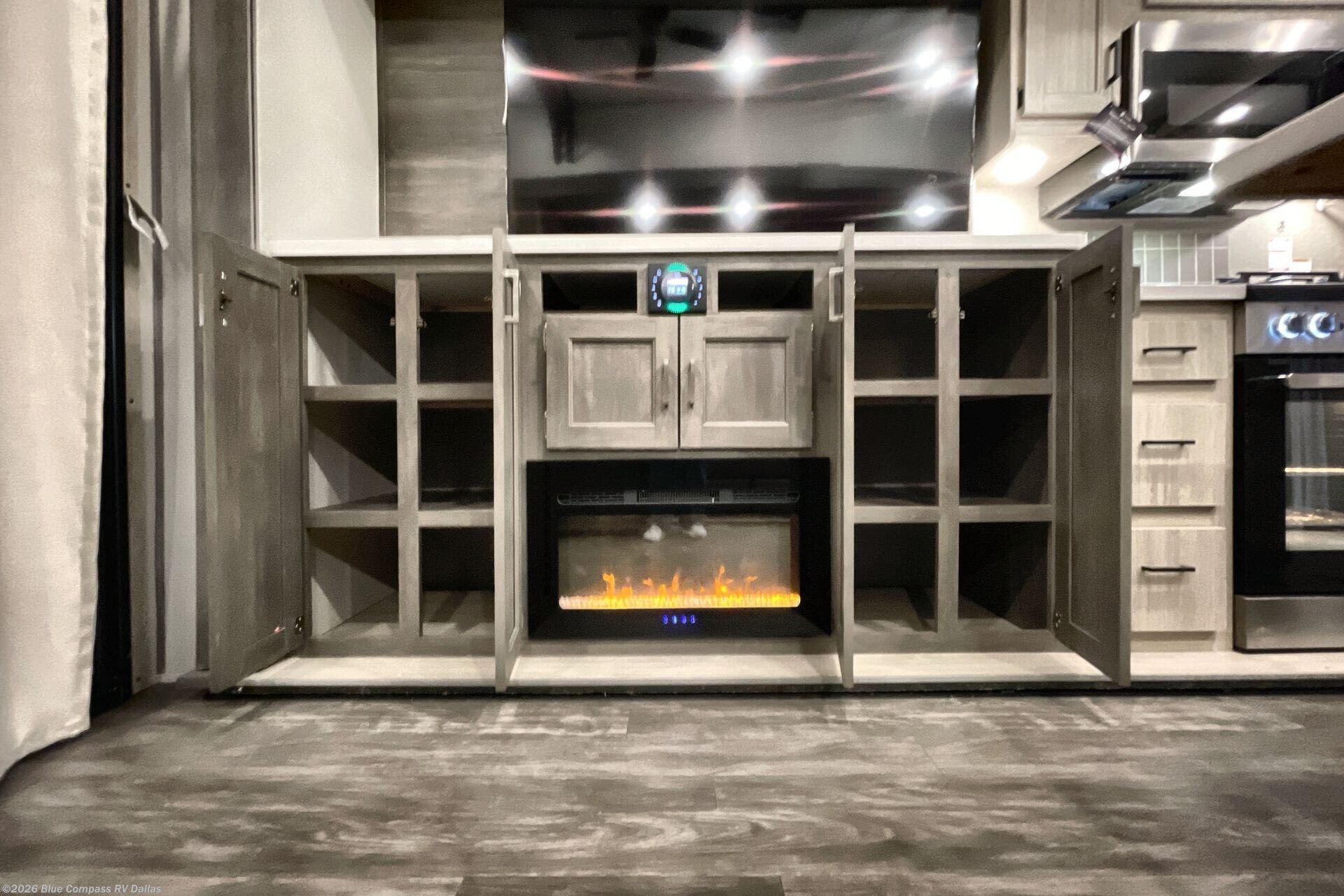 There is much to love about this destination trailer! Starting with the loft that has two queen beds, a wardrobe/storage, and a custom 58" x 71" bed. Downstairs there's a private bedroom with a king bed slide, a fireplace, and its very own private full bathroom complete with a dual sink vanity. The main living area has a huge bi-fold sleeper sectional sofa so you can fit even more guests or just relax and enjoy the entertainment center. The kitchen is well-equipped with a residential refrigerator, microwave, and pantry. The centerpiece here is a kitchen island with a deep basin farm-style sink and bar stool seating so your group can gather together and make new memories.