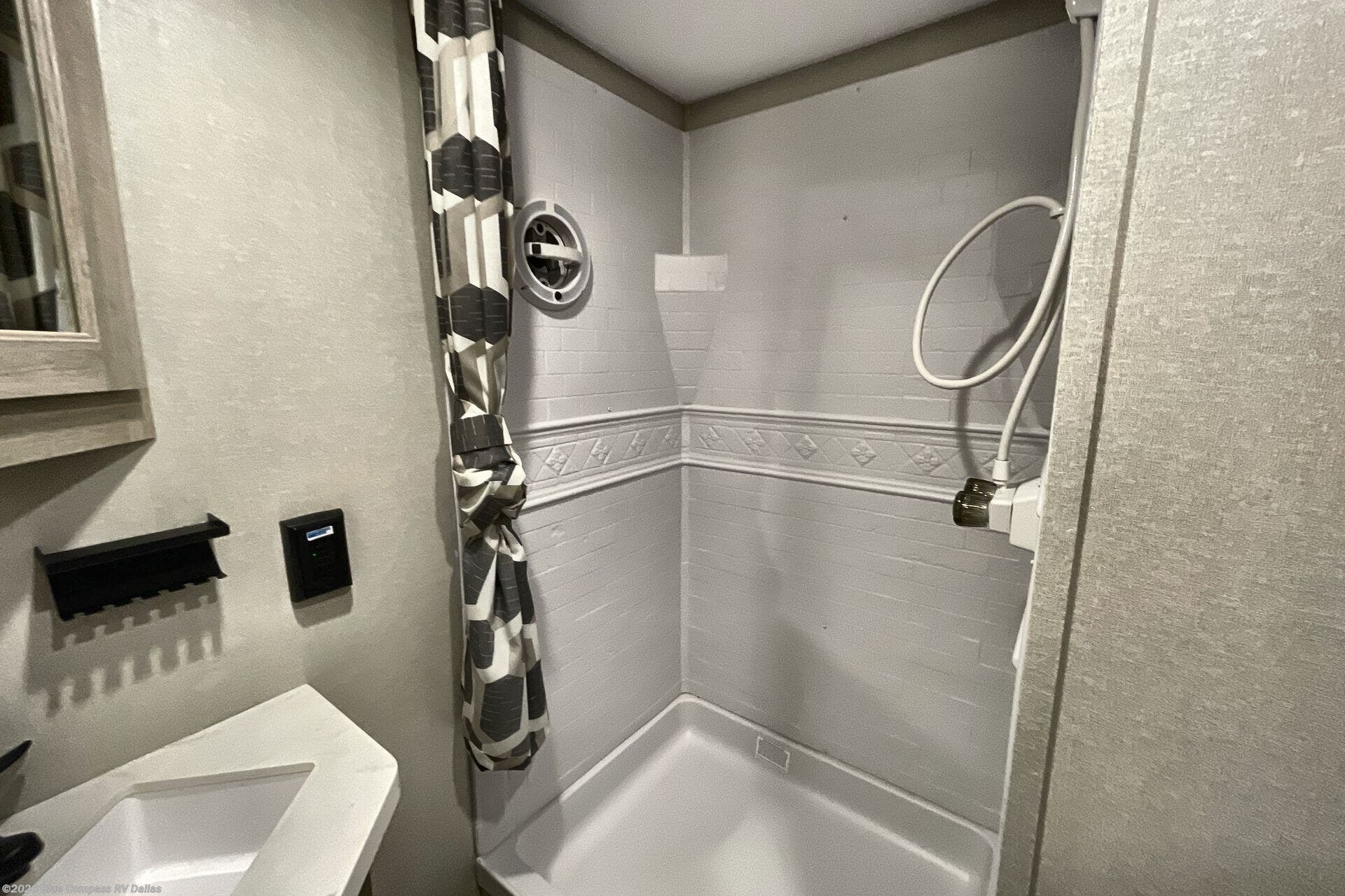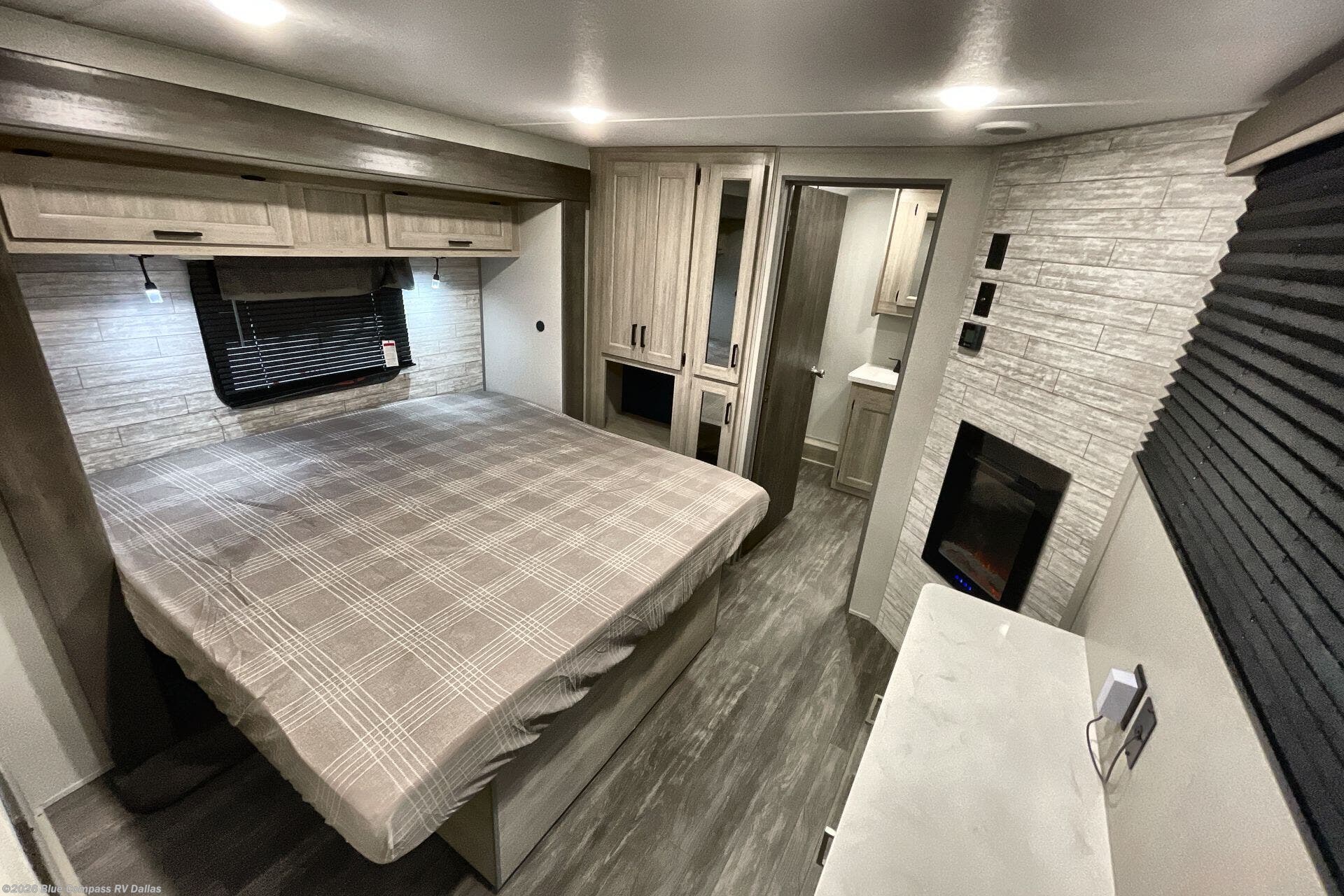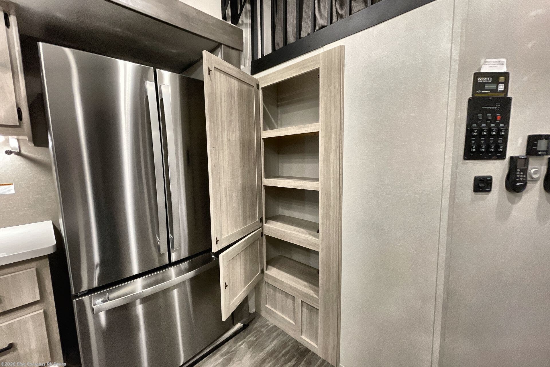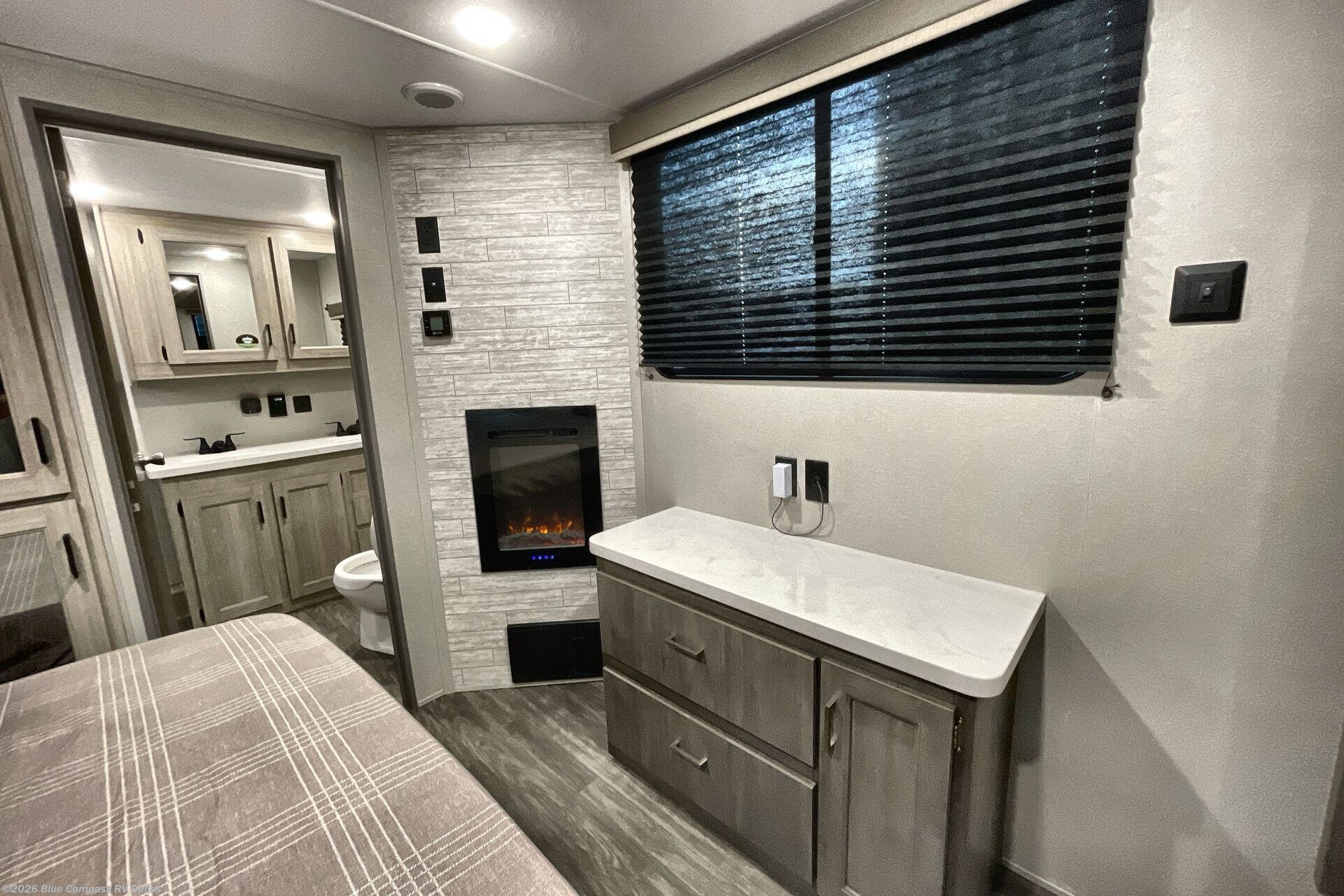 There is much to love about this destination trailer! Starting with the loft that has two queen beds, a wardrobe/storage, and a custom 58" x 71" bed. Downstairs there's a private bedroom with a king bed slide, a fireplace, and its very own private full bathroom complete with a dual sink vanity. The main living area has a huge bi-fold sleeper sectional sofa so you can fit even more guests or just relax and enjoy the entertainment center. The kitchen is well-equipped with a residential refrigerator, microwave, and pantry. The centerpiece here is a kitchen island with a deep basin farm-style sink and bar stool seating so your group can gather together and make new memories.