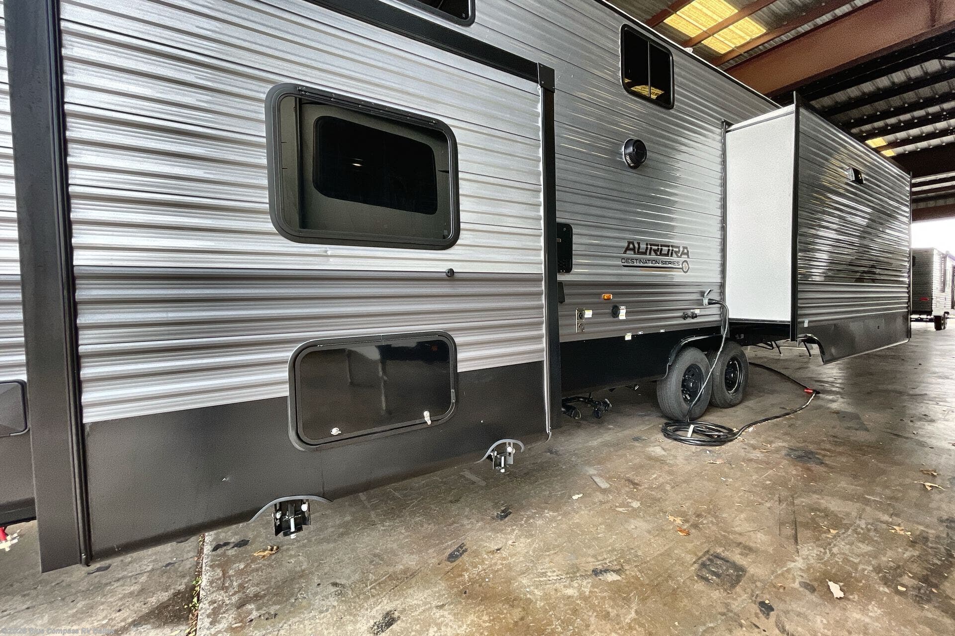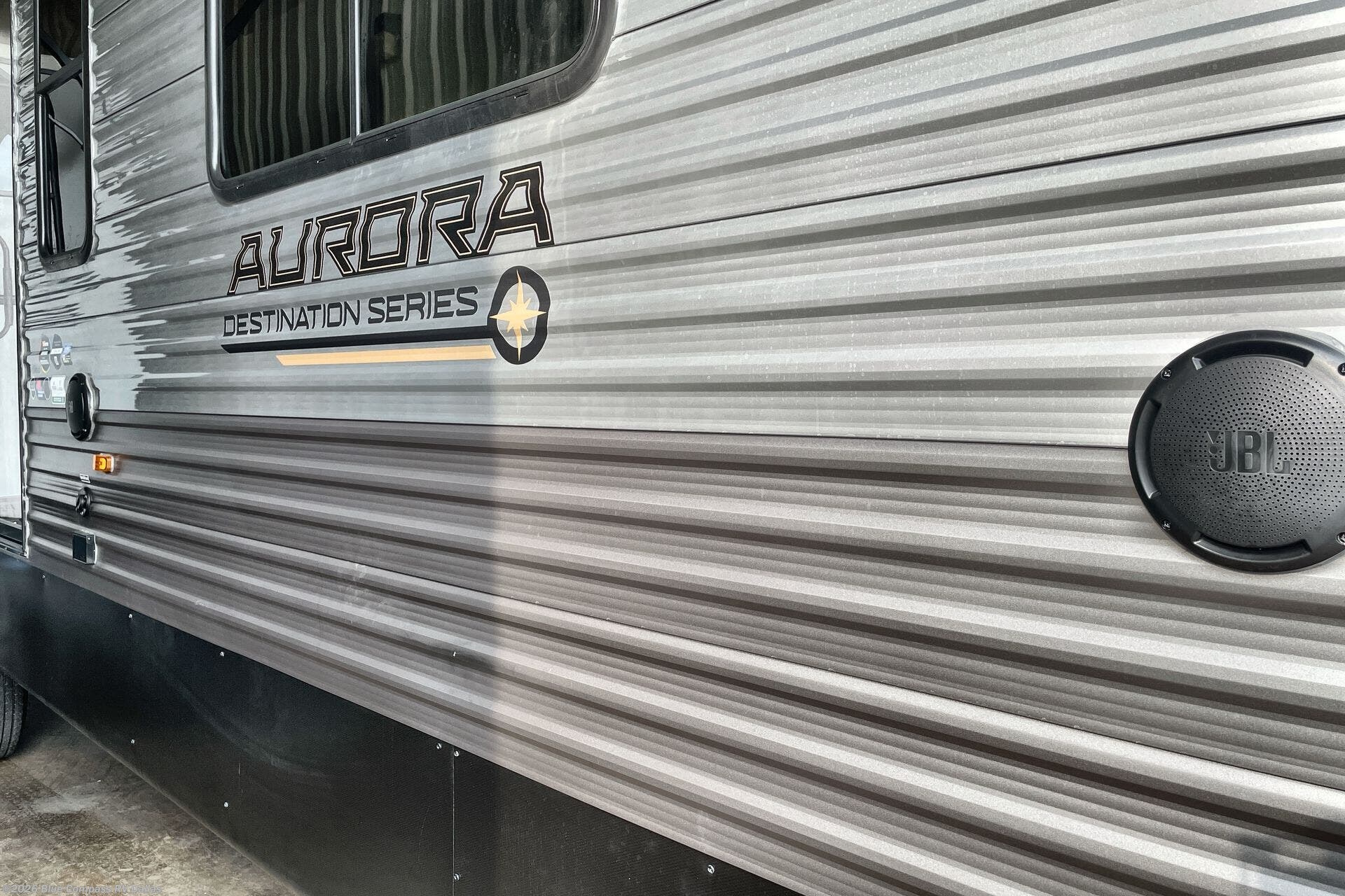 Comfortability, usability, and quality is what you will find in each one of these Forest River Aurora travel trailers, toy haulers or destination trailers! They are designed with a superior build and packed full with industry leading, functional, and distinctive standard features. SolidStep entrance steps and a Safe-T rail door assist on main entry door to help you safely enter and exit the unit. The diamond plate rock guard will protect your unit from road debris and the nitrogen filled radial tires, which keep their pressure longer, offer better fuel economy. You will also find upgraded JBL Elite exterior speakers outside, an electric awning with multicolor lights and remote, plus flush mount baggage doors for easy packing. The interiors are beautifully designed with a deep undermount farm style sink, stainless steel appliances, and linoleum flooring in the slide outs which will be easy to clean. Come find your favorite model today!
