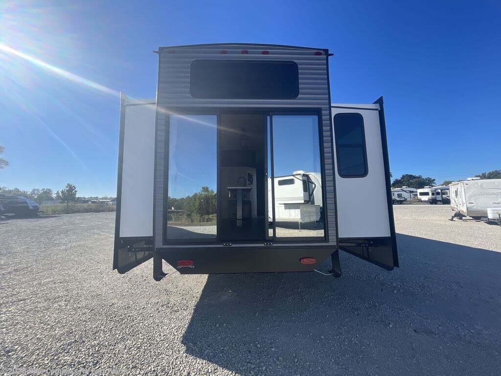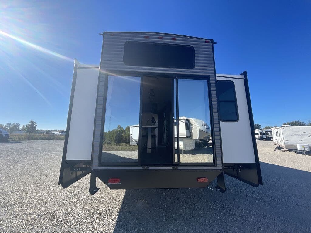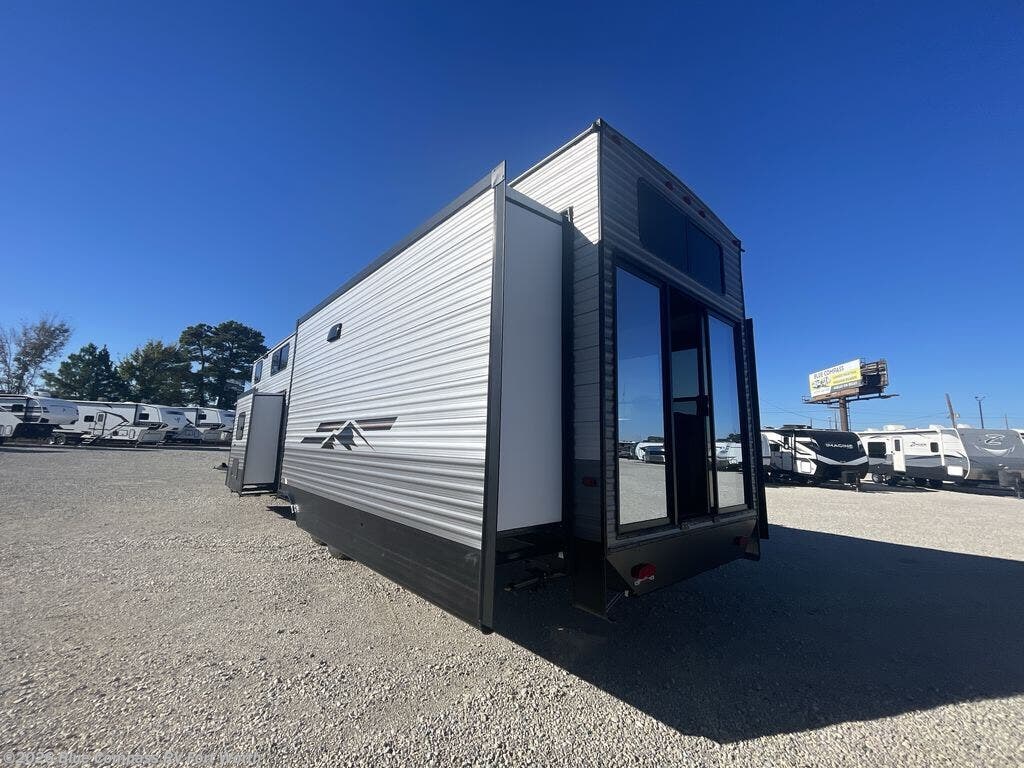 There is much to love about this destination trailer! Starting with the loft that has two queen beds, a wardrobe/storage, and a custom 58" x 71" bed. Downstairs there's a private bedroom with a king bed slide, a fireplace, and its very own private full bathroom complete with a dual sink vanity. The main living area has a huge bi-fold sleeper sectional sofa so you can fit even more guests, or just relax and watch the TV on the power lift in the entertainment center. The kitchen is well-equipped with a residential refrigerator, microwave, and pantry. The centerpiece here is a kitchen island with a deep basin farm-style sink and bar stool seating so your group can gather together and make new memories.