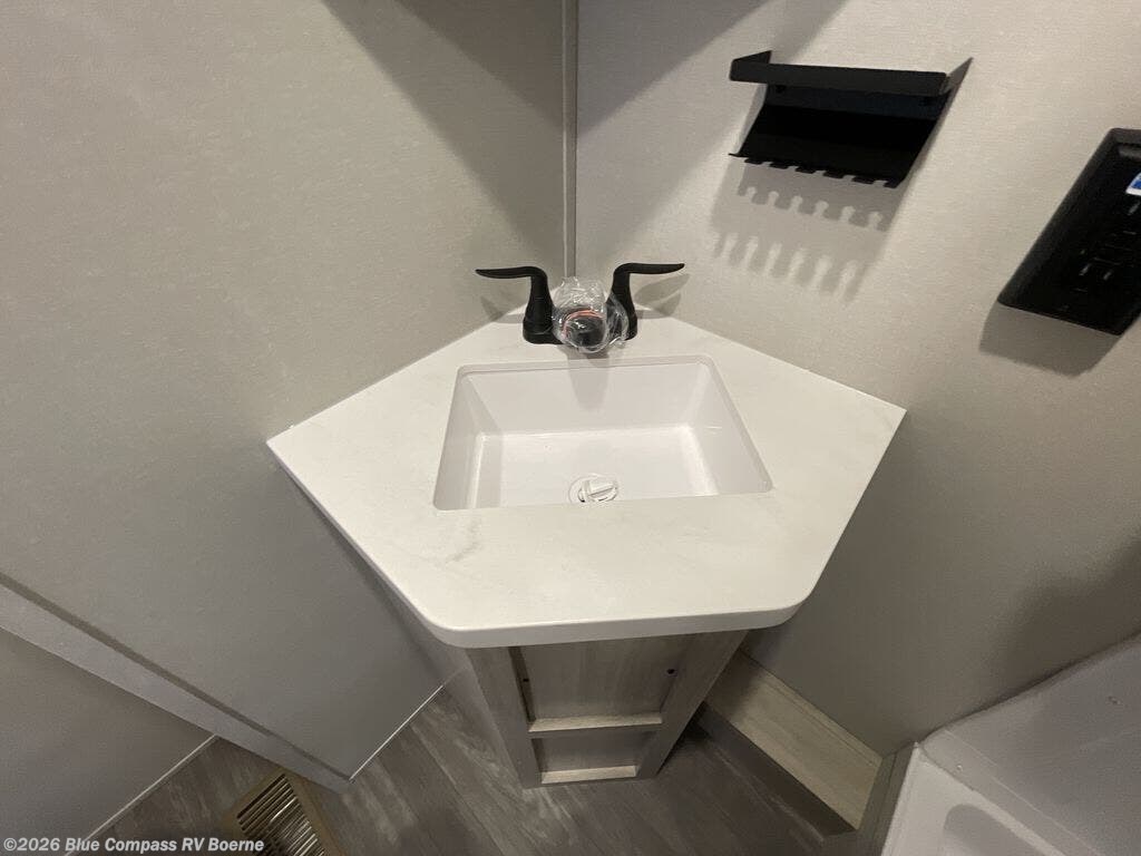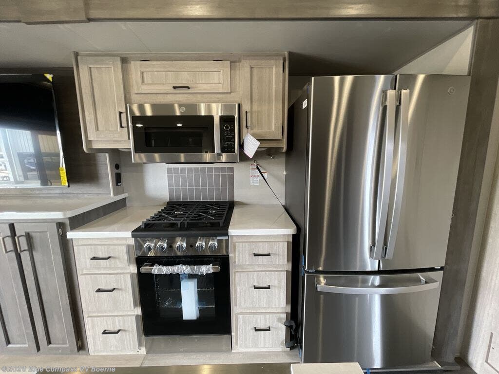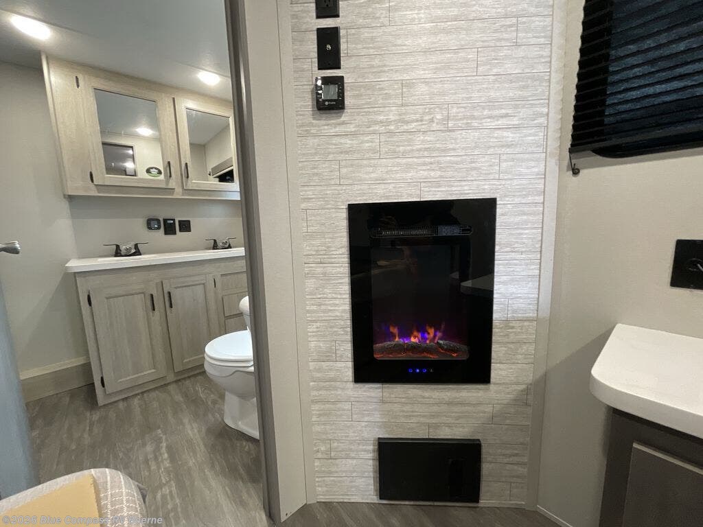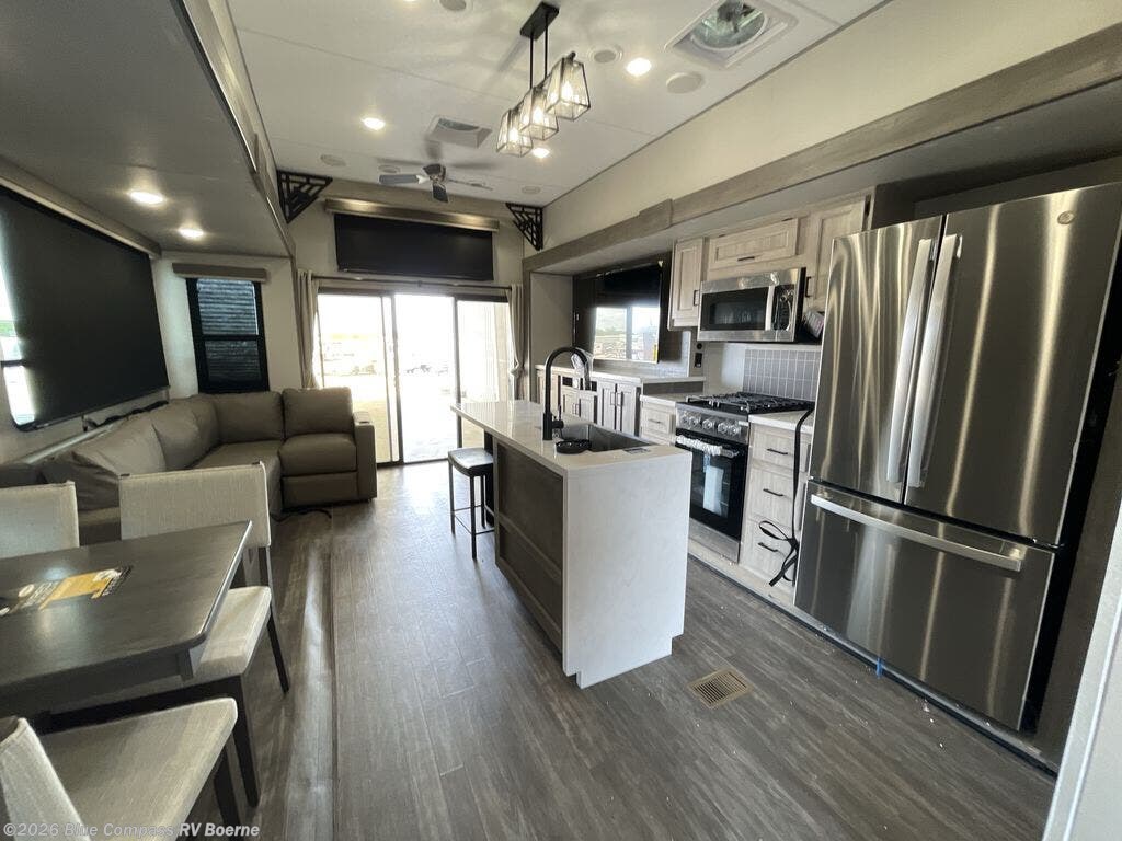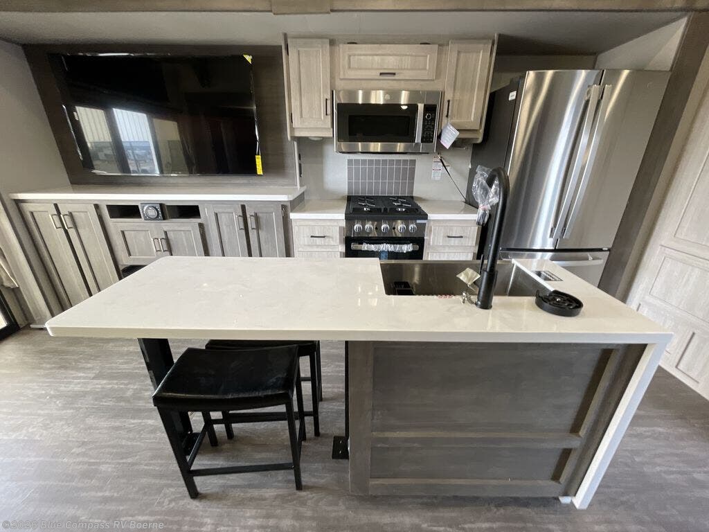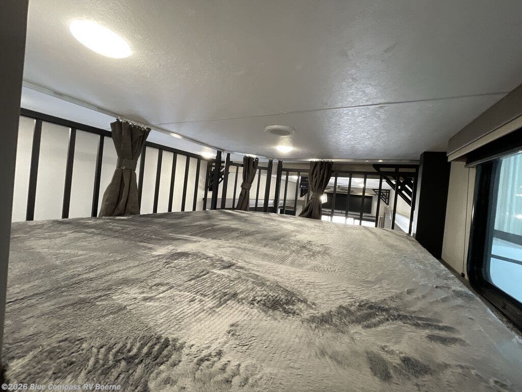 There is much to love about this destination trailer! Starting with the loft that has two queen beds, a wardrobe/storage, and a custom 58" x 71" bed. Downstairs there's a private bedroom with a king bed slide, a fireplace, and its very own private full bathroom complete with a dual sink vanity. The main living area has a huge bi-fold sleeper sectional sofa so you can fit even more guests or just relax and enjoy the entertainment center. The kitchen is well-equipped with a residential refrigerator, microwave, and pantry. The centerpiece here is a kitchen island with a deep basin farm-style sink and bar stool seating so your group can gather together and make new memories.