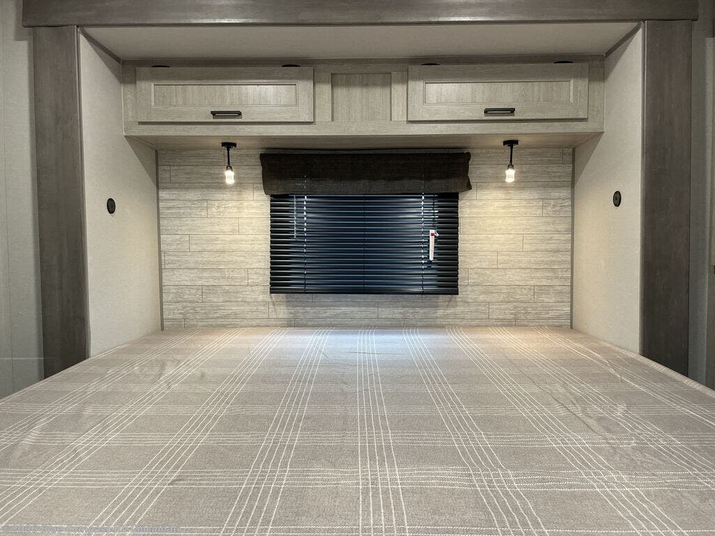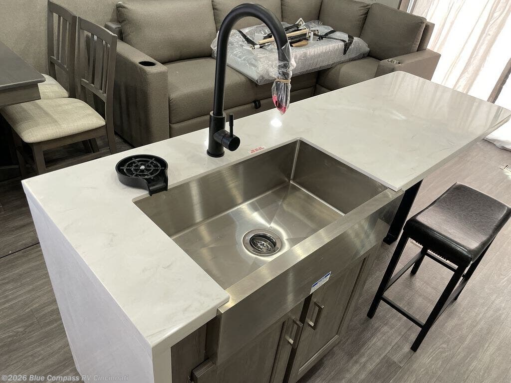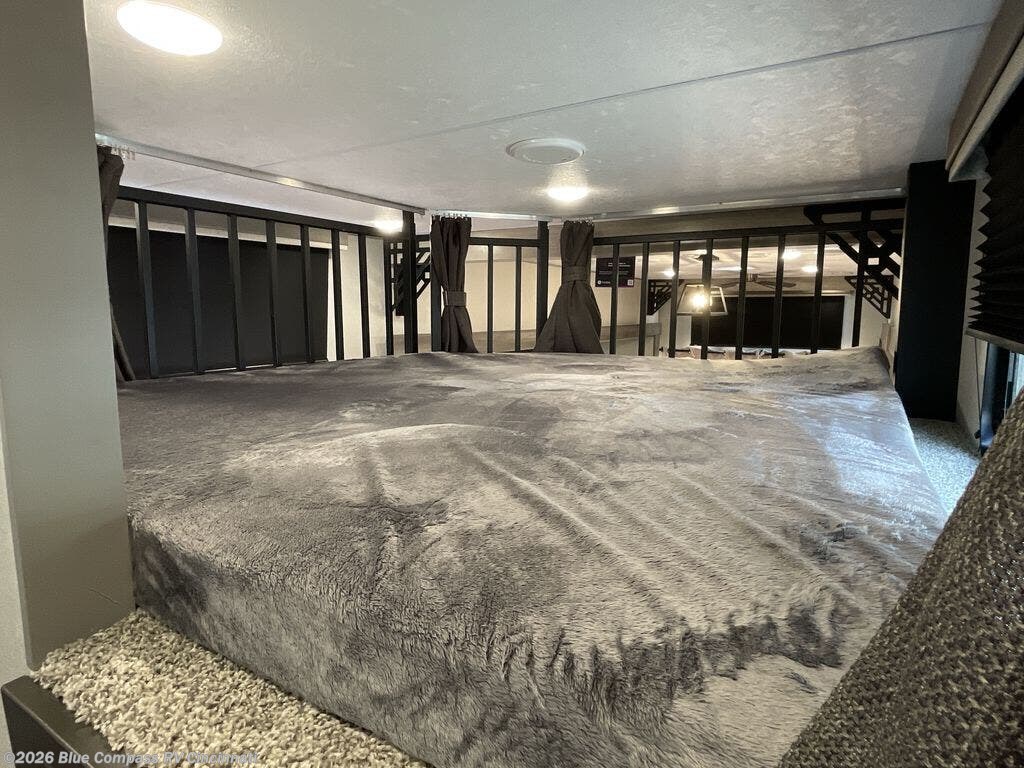 There is much to love about this destination trailer! Starting with the loft that has two queen beds, a wardrobe/storage, and a custom 58" x 71" bed. Downstairs there's a private bedroom with a king bed slide, a fireplace, and its very own private full bathroom complete with a dual sink vanity. The main living area has a huge bi-fold sleeper sectional sofa so you can fit even more guests, or just relax and watch the TV on the power lift in the entertainment center. The kitchen is well-equipped with a residential refrigerator, microwave, and pantry. The centerpiece here is a kitchen island with a deep basin farm-style sink and bar stool seating so your group can gather together and make new memories.