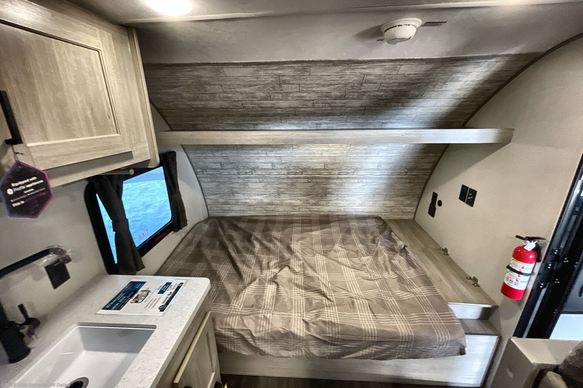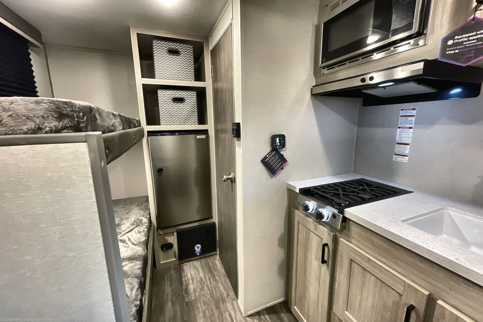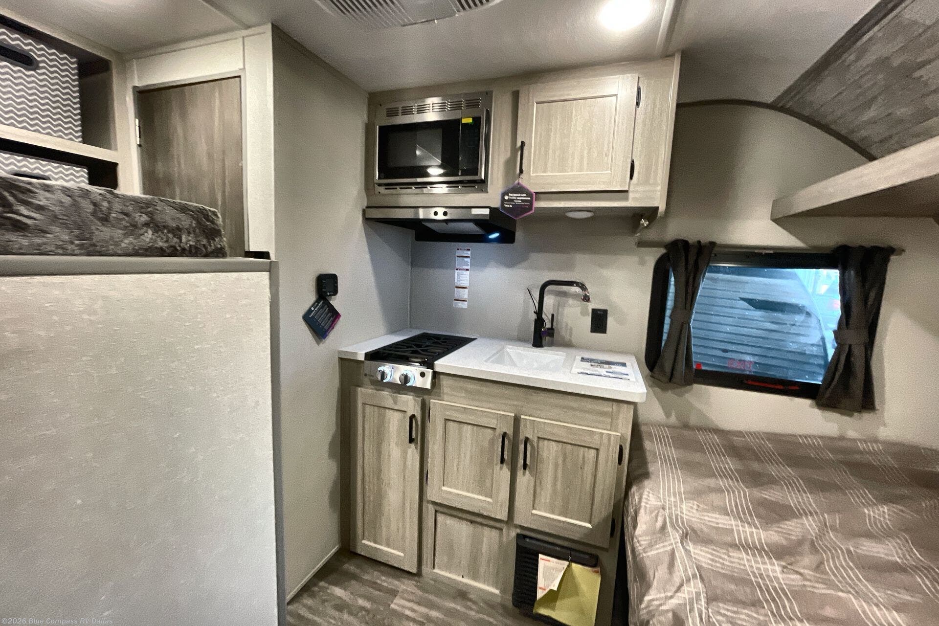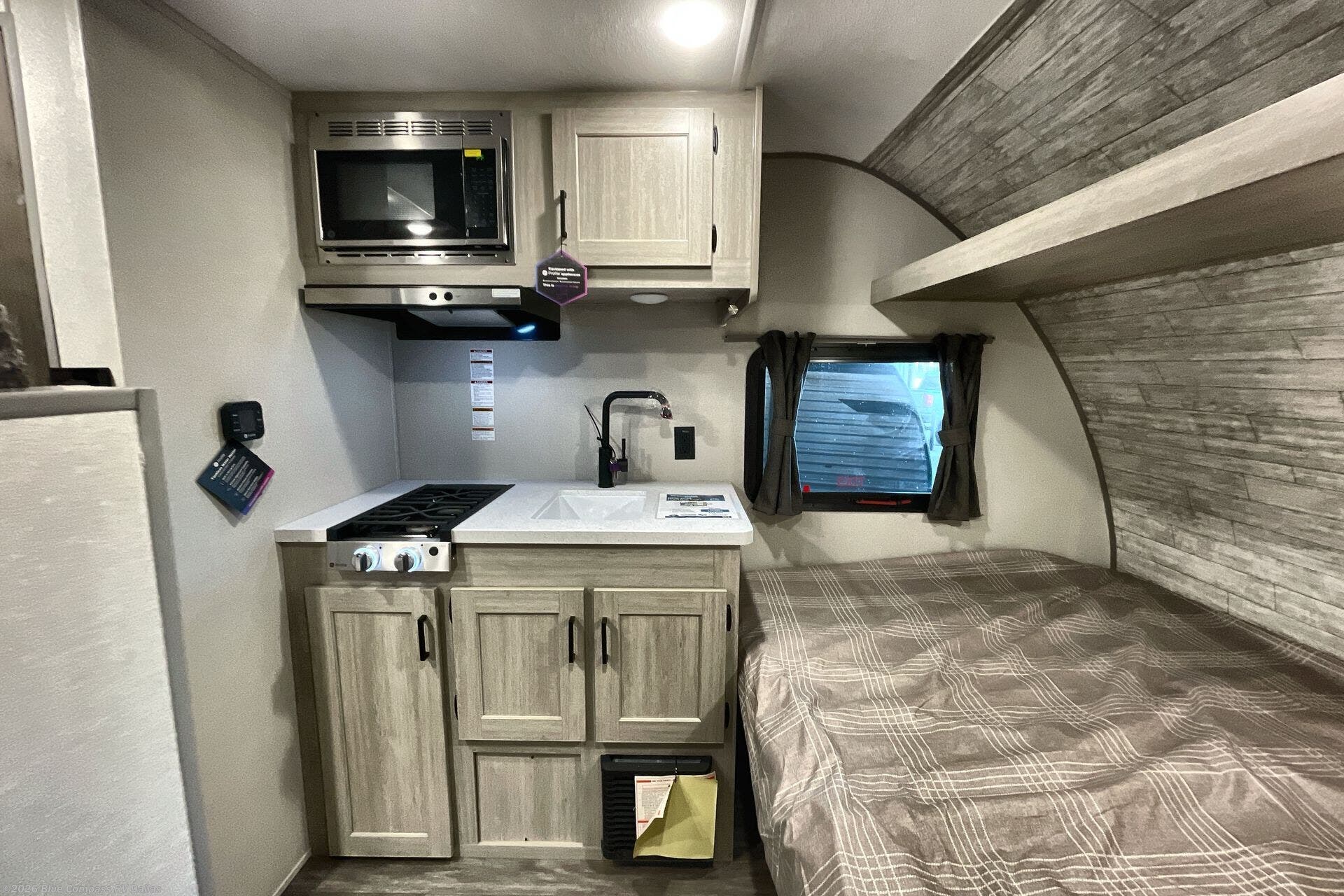 This lightweight travel trailer includes everything you need for comfortable camping trips at the lake. You can make your meals on the two burner cooktop or in the stainless steel microwave, and a 3.3 cu. ft. 12V refrigerator will keep leftovers fresh. A front queen bed provides a great night's rest, and there are 29" x 70" bunk beds for your guests or little ones. And a private bath with a 24" x 32" shower and toilet will let you easily freshen up without having to use the camp's facilities!