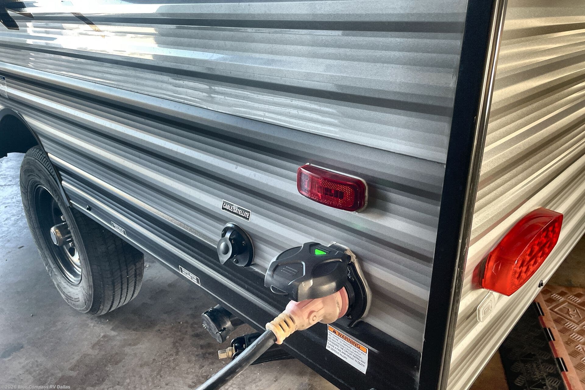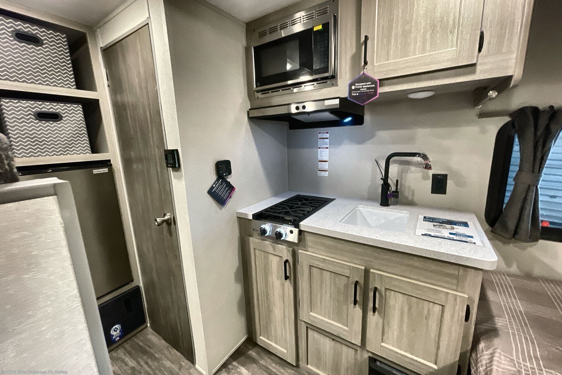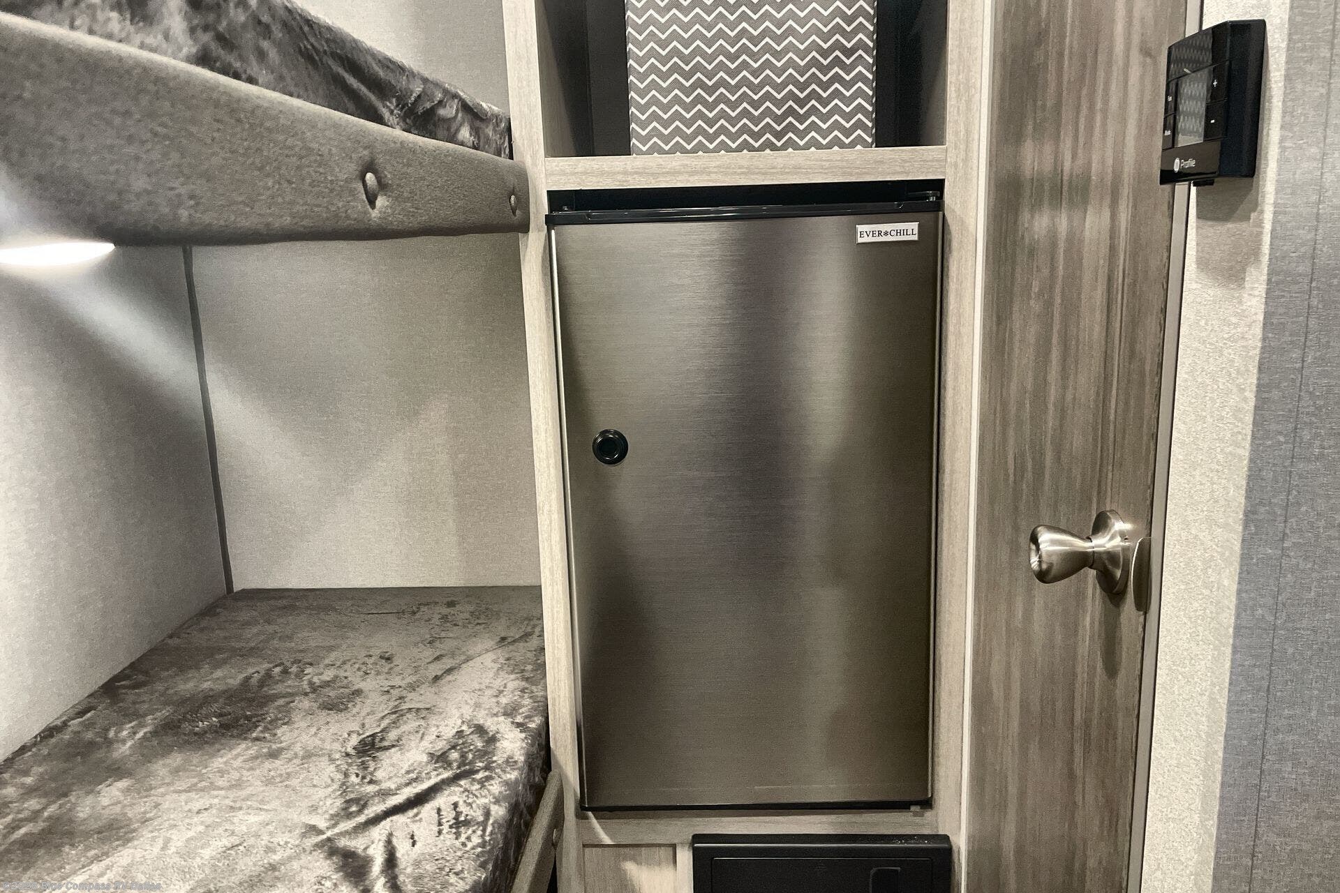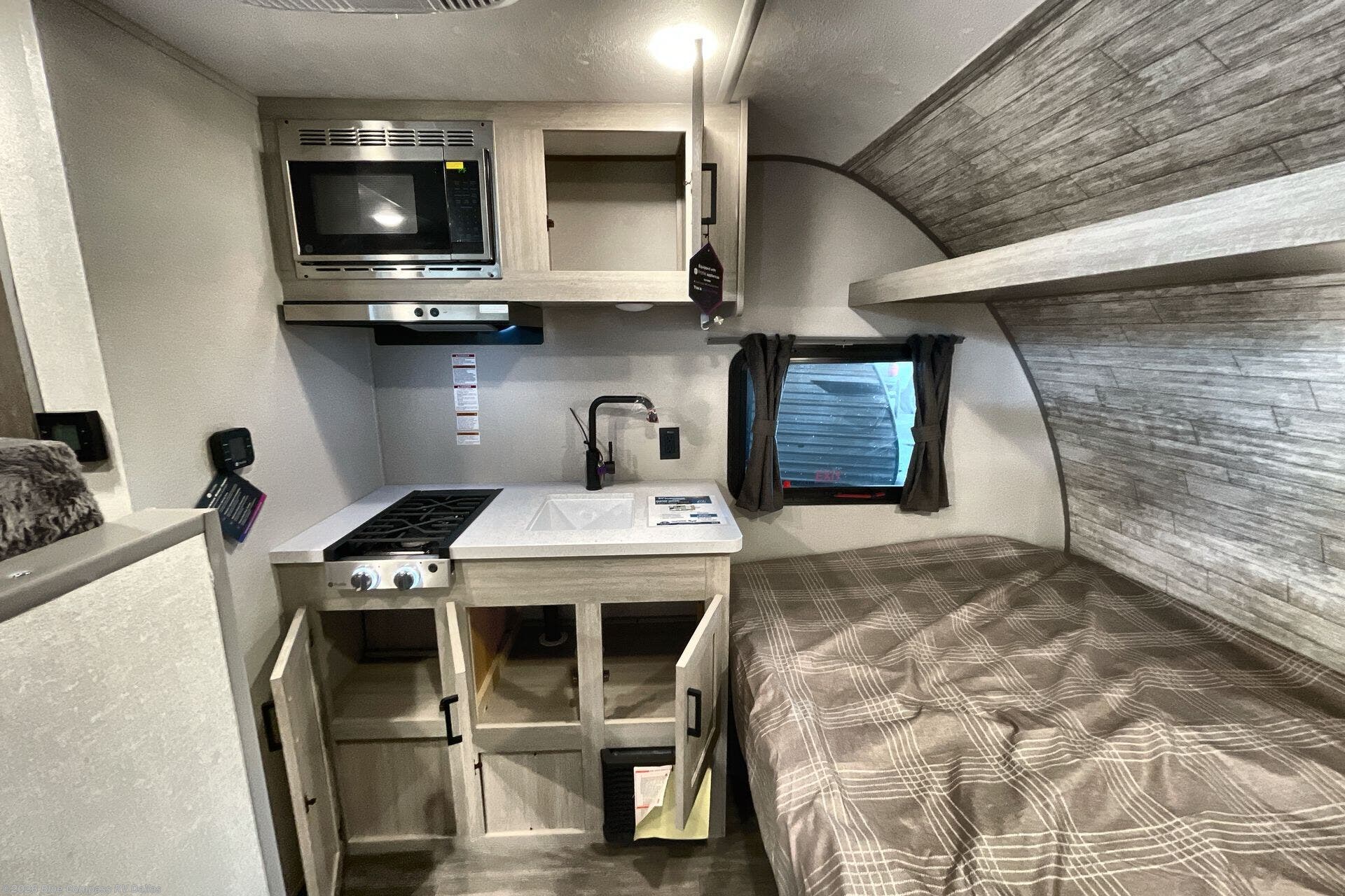 This lightweight travel trailer includes everything you need for comfortable camping trips at the lake. You can make your meals on the two burner cooktop or in the stainless steel microwave, and a 3.3 cu. ft. 12V refrigerator will keep leftovers fresh. A front queen bed provides a great night's rest, and there are 29" x 70" bunk beds for your guests or little ones. And a private bath with a 24" x 32" shower and toilet will let you easily freshen up without having to use the camp's facilities!