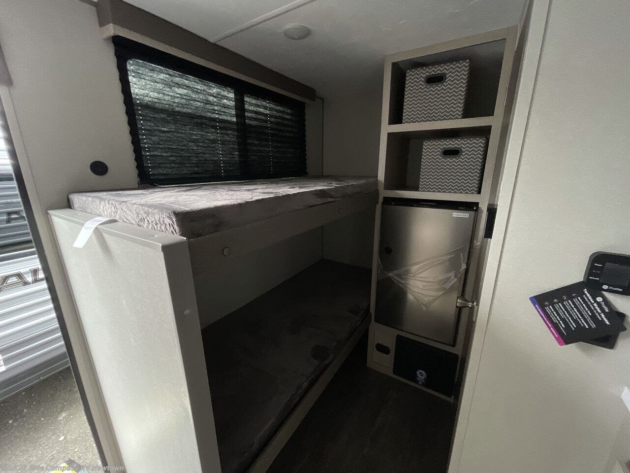 Comfortability, usability, and quality is what you will find in each one of these Forest River Aurora Light travel trailers! They are designed with a superior build and packed full with industry leading, functional, and distinctive standard features. The diamond plate rock guard will protect your unit from road debris and the nitrogen filled radial tires, which keep their pressure longer, offer better fuel economy. You will also find upgraded JBL Elite exterior speaker outside, an electric awning with multicolor lights and remote, plus flush mount baggage doors for easy packing. The interiors are beautifully designed with matte black kitchen and bath faucets, black nightshades in the living room, and GE kitchen appliances!