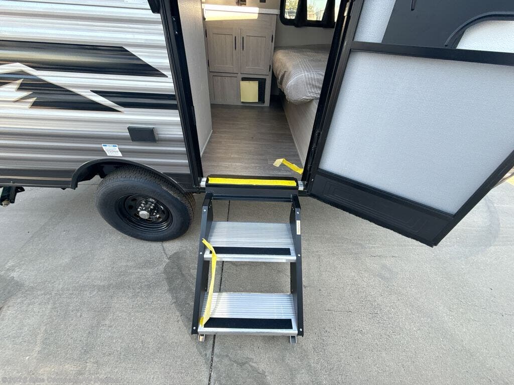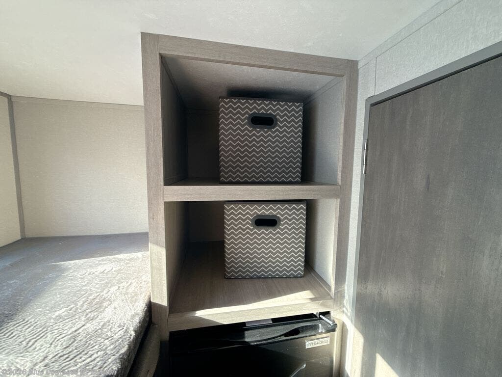 This lightweight travel trailer includes everything you need for comfortable camping trips at the lake. You can make your meals on the two burner cooktop or in the stainless steel microwave, and a 3.3 cu. ft. 12V refrigerator will keep leftovers fresh. A front queen bed provides a great night's rest, and there are 29" x 70" bunk beds for your guests or little ones. And a private bath with a 24" x 32" shower and toilet will let you easily freshen up without having to use the camp's facilities!