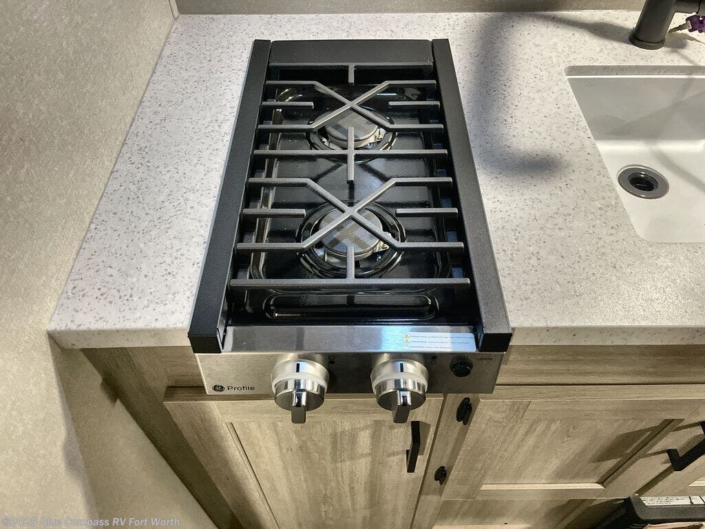 This lightweight travel trailer includes everything you need for comfortable camping trips at the lake. You can make your meals on the two burner cooktop or in the stainless steel microwave, and a 3.3 cu. ft. 12V refrigerator will keep leftovers fresh. A front queen bed provides a great night's rest, and there are 29" x 70" bunk beds for your guests or little ones. And a private bath with a 24" x 32" shower and toilet will let you easily freshen up without having to use the camp's facilities!