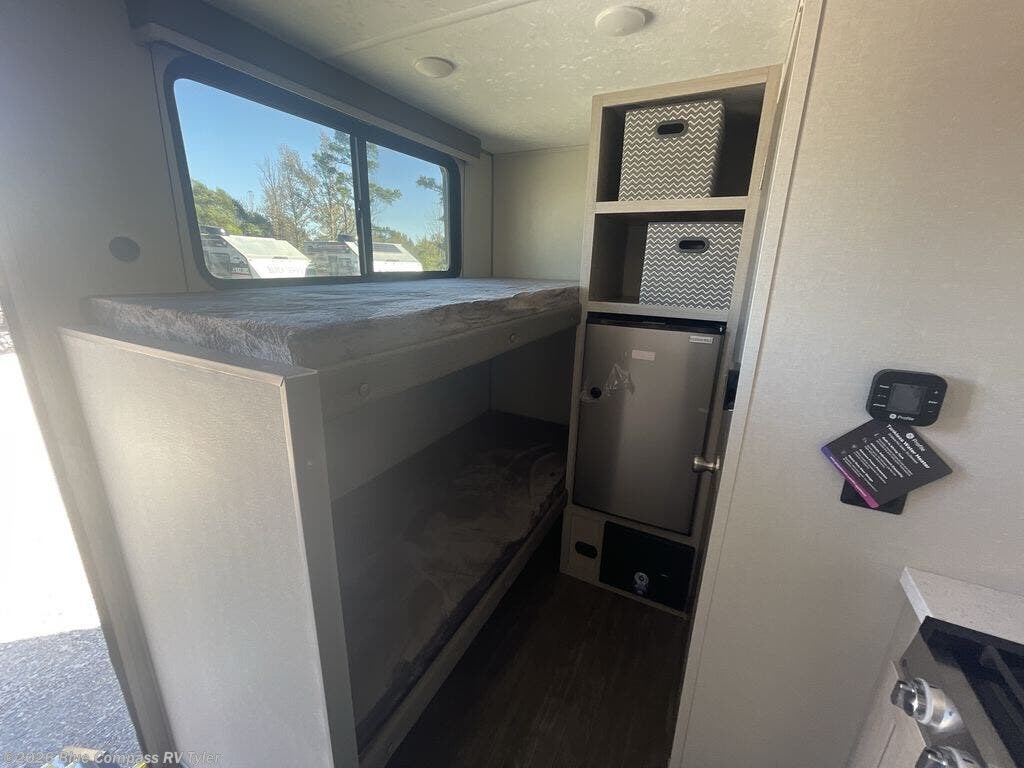 This lightweight travel trailer includes everything you need for comfortable camping trips at the lake. You can make your meals on the two burner cooktop or in the stainless steel microwave, and a 3.3 cu. ft. 12V refrigerator will keep leftovers fresh. A front queen bed provides a great night's rest, and there are 29" x 70" bunk beds for your guests or little ones. And a private bath with a 24" x 32" shower and toilet will let you easily freshen up without having to use the camp's facilities!