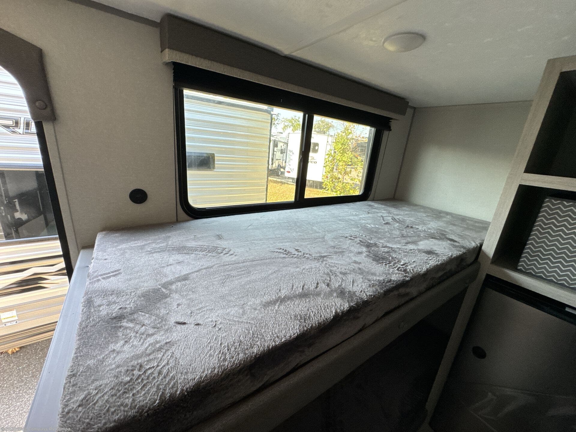 This lightweight travel trailer includes everything you need for comfortable camping trips at the lake. You can make your meals on the two burner cooktop or in the stainless steel microwave, and a 3.3 cu. ft. 12V refrigerator will keep leftovers fresh. A front queen bed provides a great night's rest, and there are 29" x 70" bunk beds for your guests or little ones. And a private bath with a 24" x 32" shower and toilet will let you easily freshen up without having to use the camp's facilities!