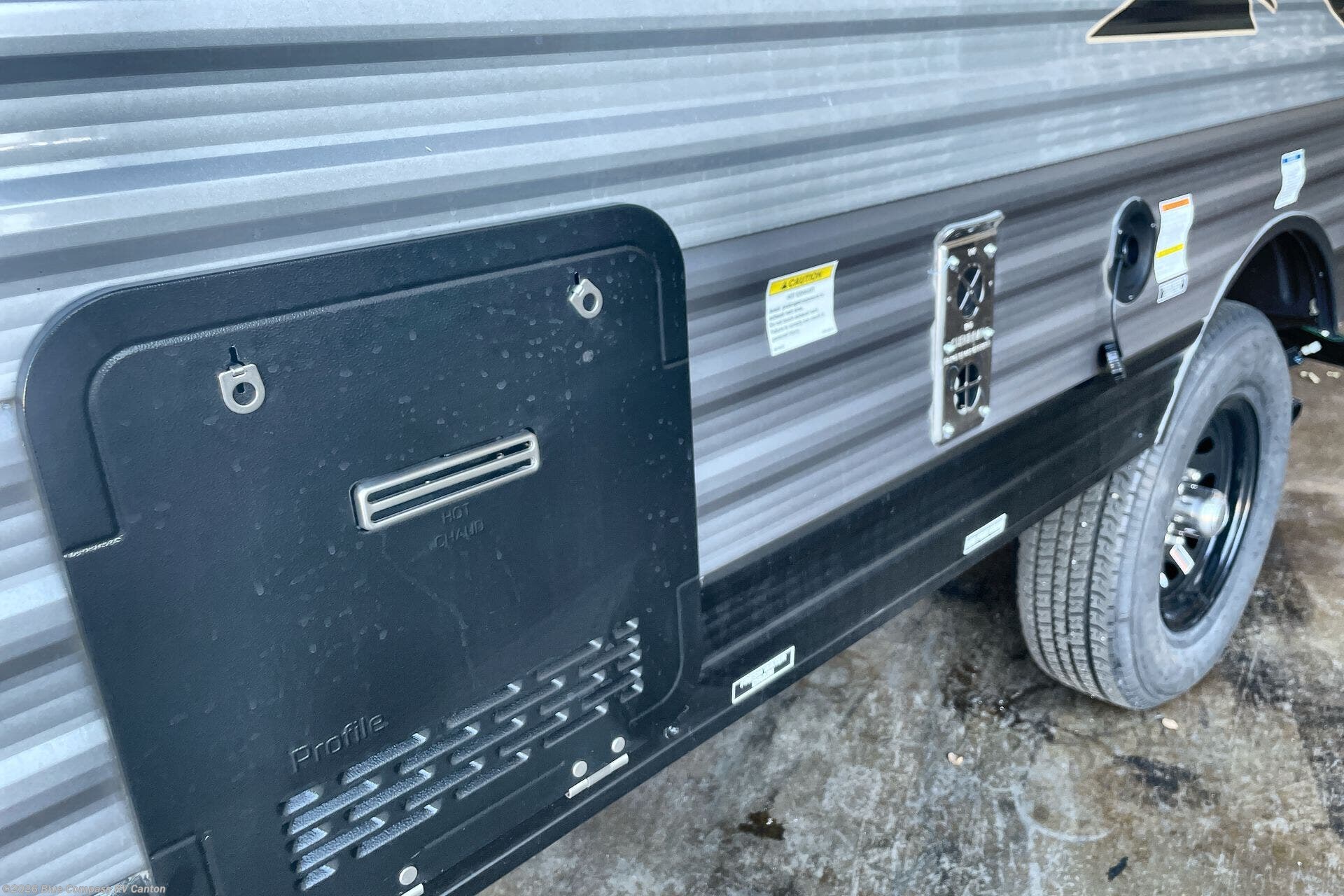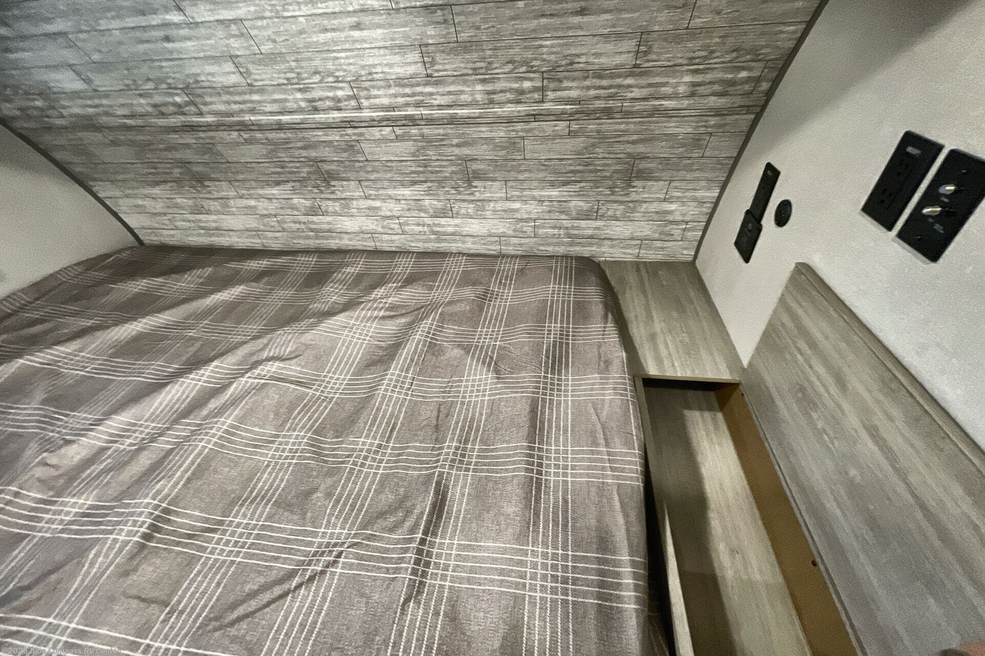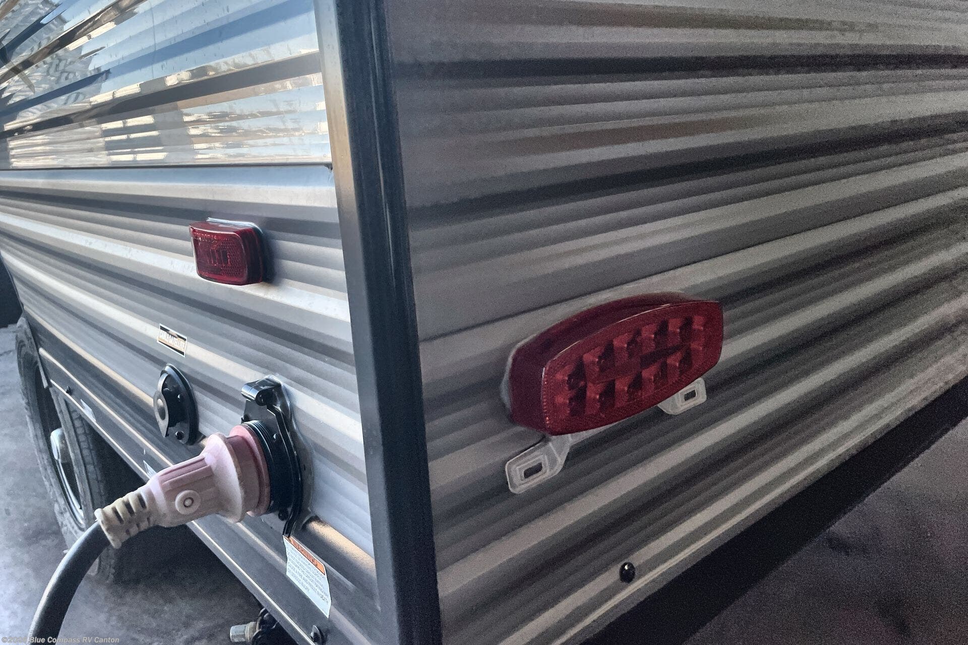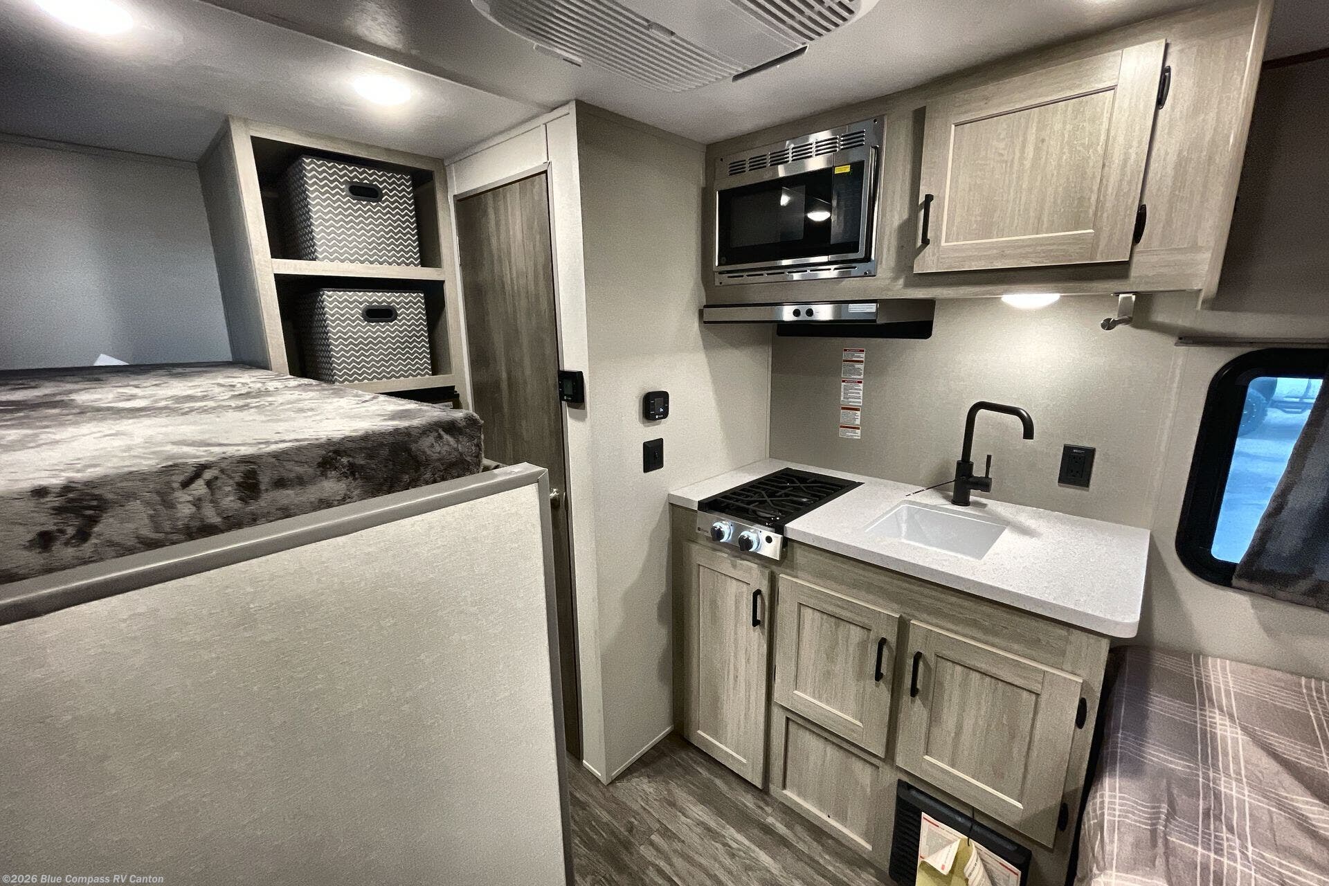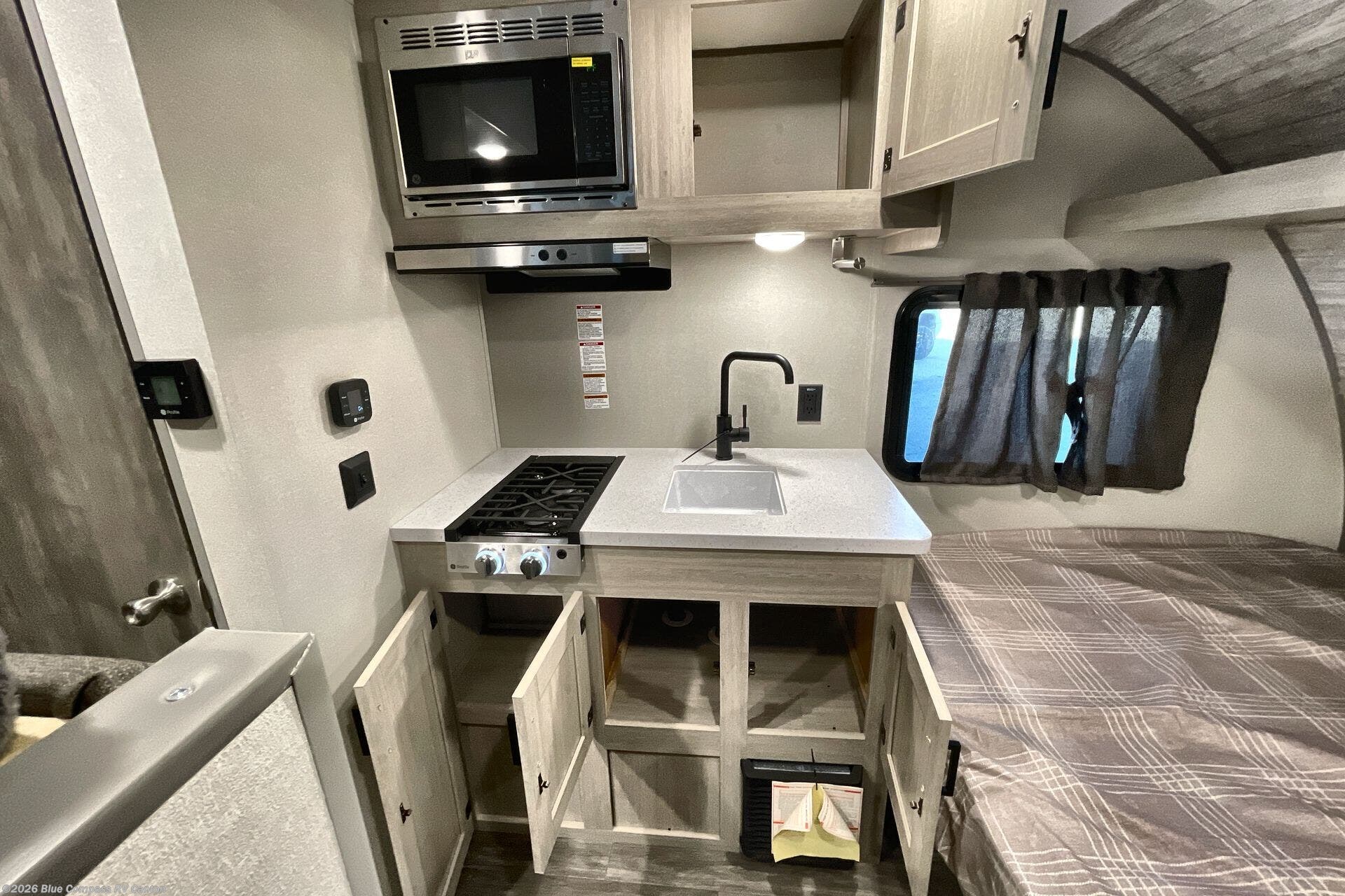 This lightweight travel trailer includes everything you need for comfortable camping trips at the lake. You can make your meals on the two burner cooktop or in the stainless steel microwave, and a 3.3 cu. ft. 12V refrigerator will keep leftovers fresh. A front queen bed provides a great night's rest, and there are 29" x 70" bunk beds for your guests or little ones. And a private bath with a 24" x 32" shower and toilet will let you easily freshen up without having to use the camp's facilities!