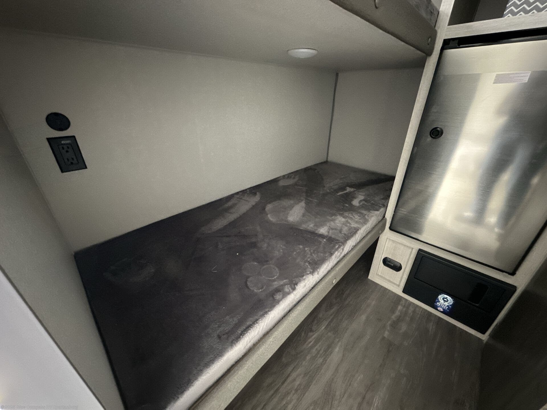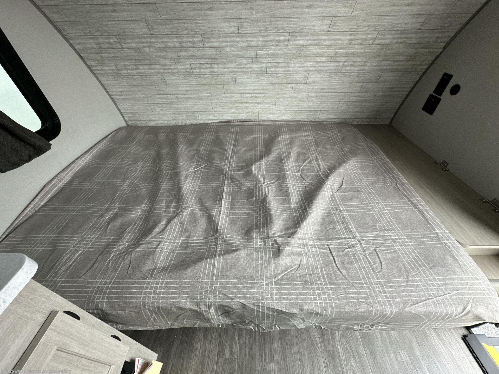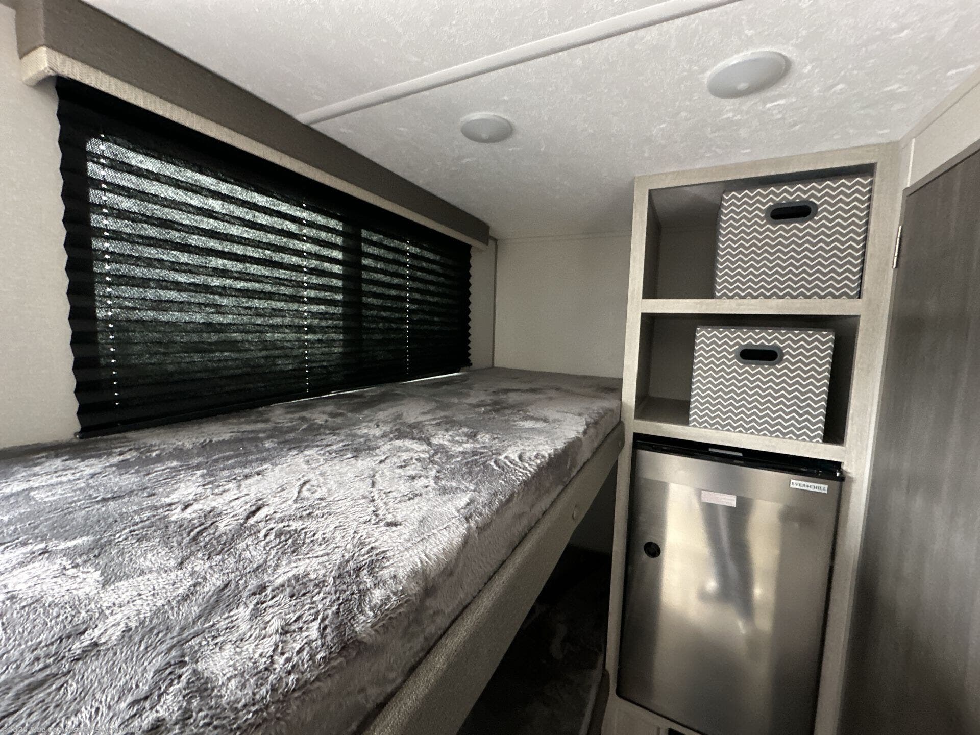This lightweight travel trailer includes everything you need for comfortable camping trips at the lake. You can make your meals on the two burner cooktop or in the stainless steel microwave, and a 3.3 cu. ft. 12V refrigerator will keep leftovers fresh. A front queen bed provides a great night's rest, and there are 29" x 70" bunk beds for your guests or little ones. And a private bath with a 24" x 32" shower and toilet will let you easily freshen up without having to use the camp's facilities!