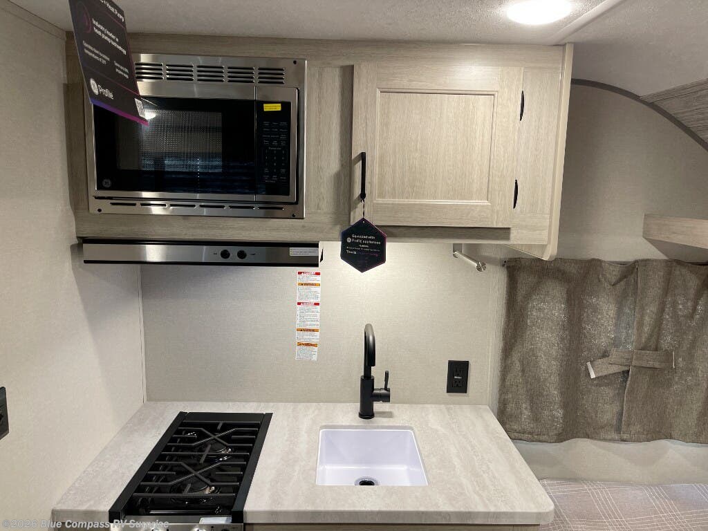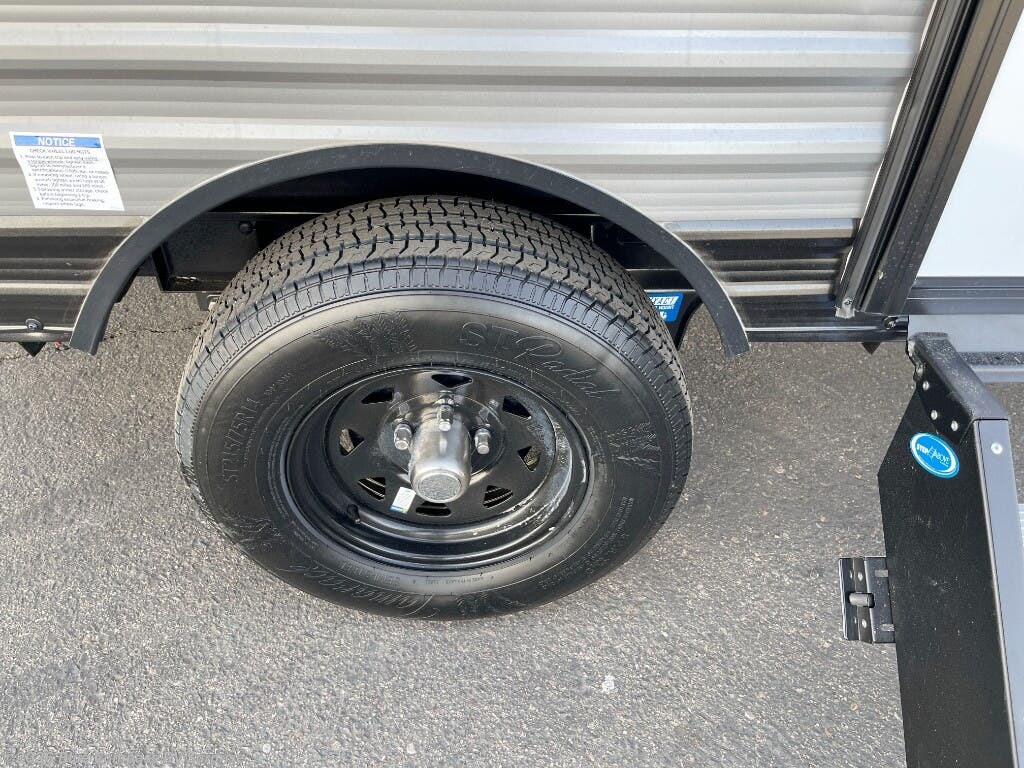 This lightweight travel trailer includes everything you need for comfortable camping trips at the lake. You can make your meals on the two burner cooktop or in the stainless steel microwave, and a 3.3 cu. ft. 12V refrigerator will keep leftovers fresh. A front queen bed provides a great night's rest, and there are 29" x 70" bunk beds for your guests or little ones. And a private bath with a 24" x 32" shower and toilet will let you easily freshen up without having to use the camp's facilities!