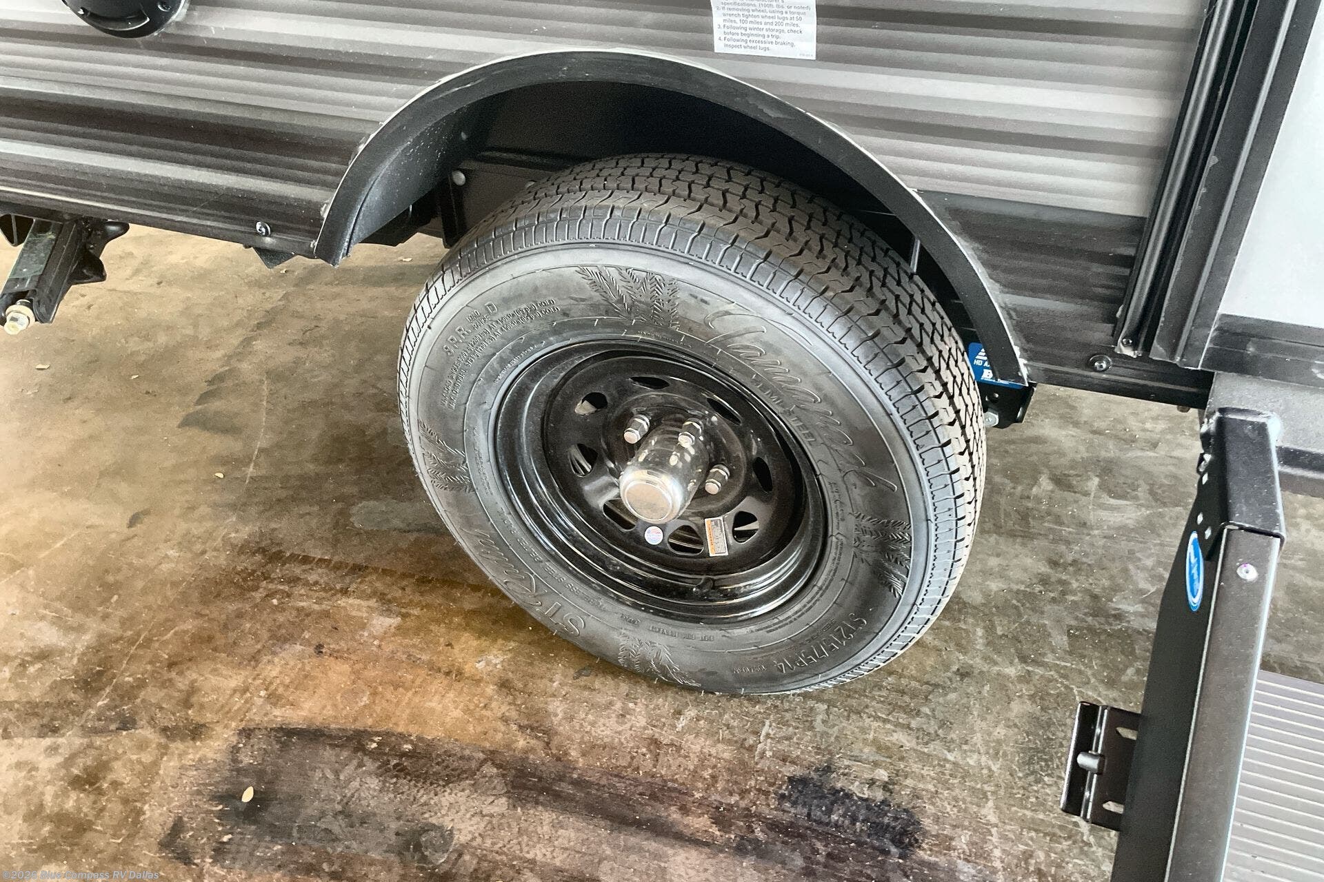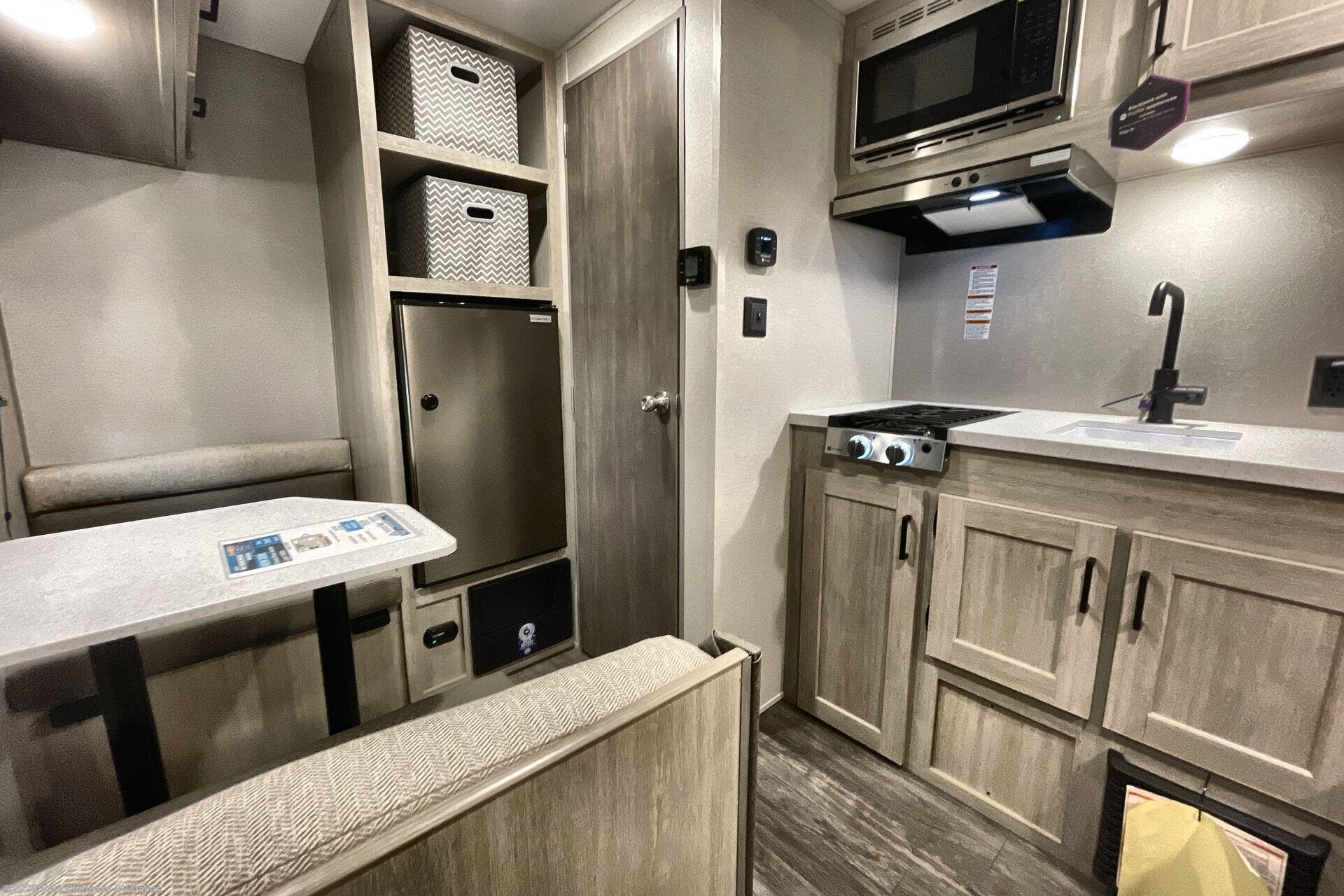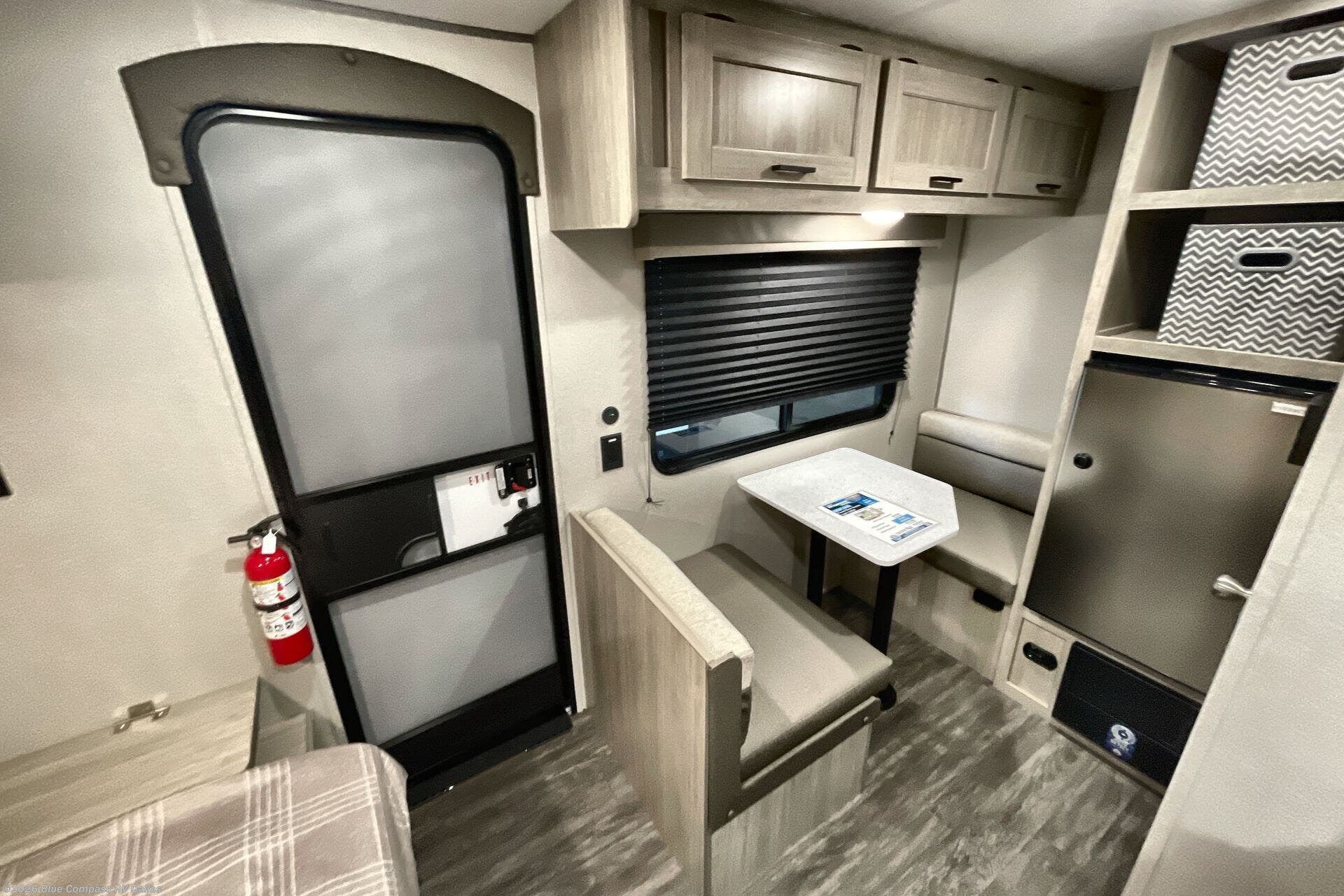 This lightweight travel trailer includes everything you need for comfortable camping trips at the lake. You can make your meals on the two burner cooktop or in the stainless steel microwave, and a 3.3 cu. ft. 12V refrigerator will keep leftovers fresh. A front queen bed provides a great night's rest, and there is a 29" booth dinette that will double as both dining and additional sleeping space. And a private bath with a 24" x 32" shower and toilet will let you easily freshen up without having to use the camp's facilities!