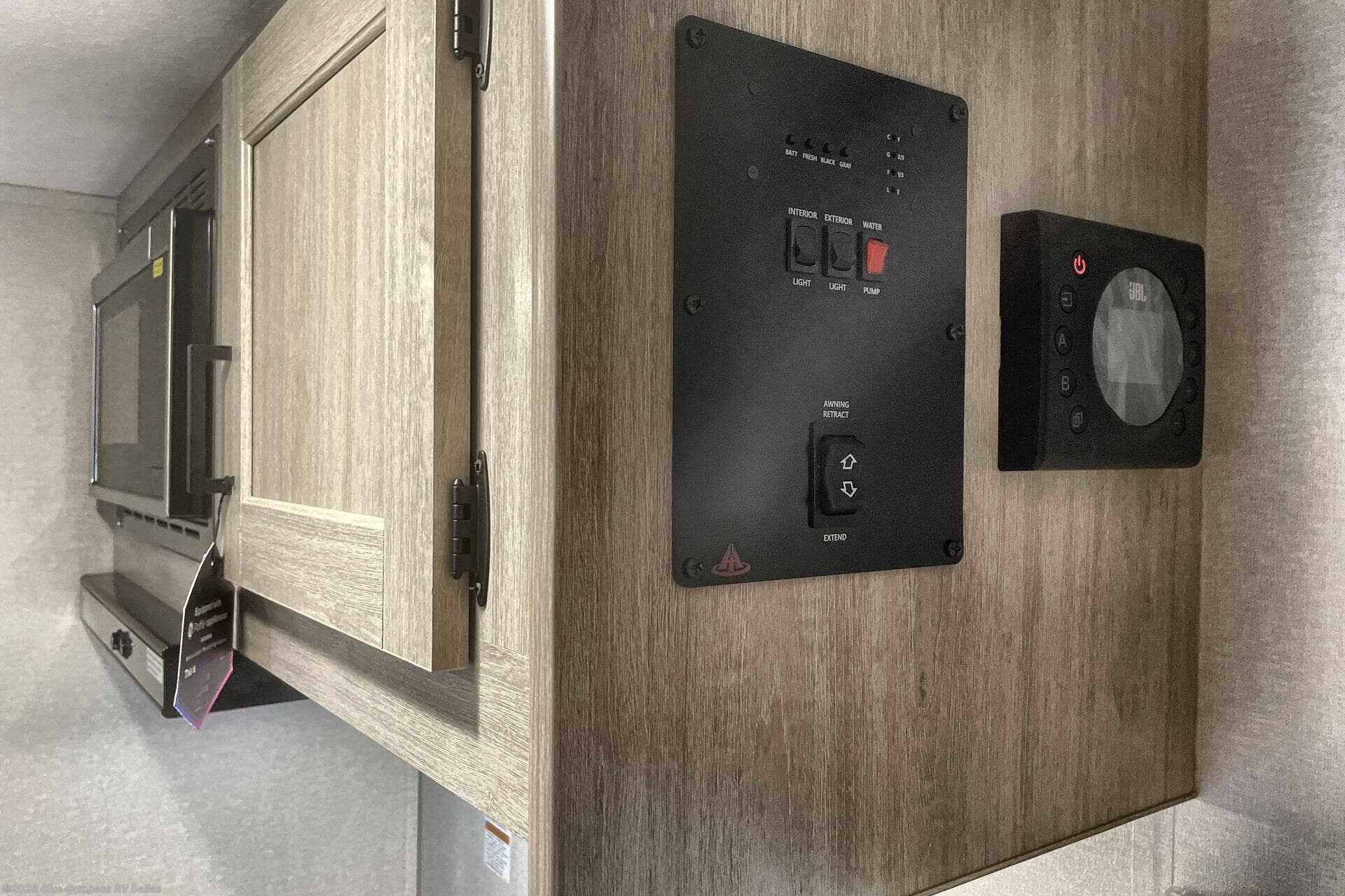 Comfortability, usability, and quality is what you will find in each one of these Forest River Aurora Light travel trailers! They are designed with a superior build and packed full with industry leading, functional, and distinctive standard features. The diamond plate rock guard will protect your unit from road debris and the nitrogen filled radial tires, which keep their pressure longer, offer better fuel economy. You will also find upgraded JBL Elite exterior speaker outside, an electric awning with multicolor lights and remote, plus flush mount baggage doors for easy packing. The interiors are beautifully designed with matte black kitchen and bath faucets, black nightshades in the living room, and GE kitchen appliances!