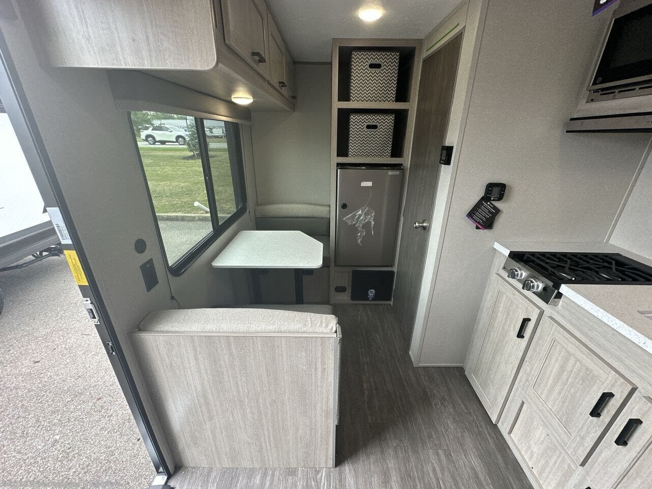 This lightweight travel trailer includes everything you need for comfortable camping trips at the lake. You can make your meals on the two burner cooktop or in the stainless steel microwave, and a 3.3 cu. ft. 12V refrigerator will keep leftovers fresh. A front queen bed provides a great night's rest, and there is a 29" booth dinette that will double as both dining and additional sleeping space. And a private bath with a 24" x 32" shower and toilet will let you easily freshen up without having to use the camp's facilities!