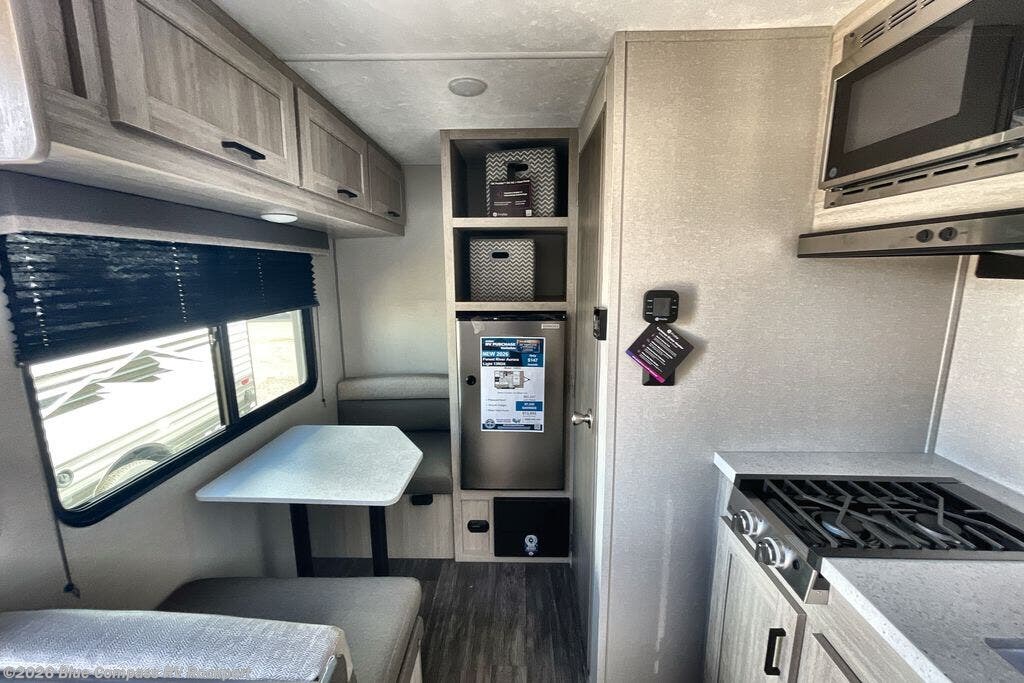 This lightweight travel trailer includes everything you need for comfortable camping trips at the lake. You can make your meals on the two burner cooktop or in the stainless steel microwave, and a 3.3 cu. ft. 12V refrigerator will keep leftovers fresh. A front queen bed provides a great night's rest, and there is a 29" booth dinette that will double as both dining and additional sleeping space. And a private bath with a 24" x 32" shower and toilet will let you easily freshen up without having to use the camp's facilities!