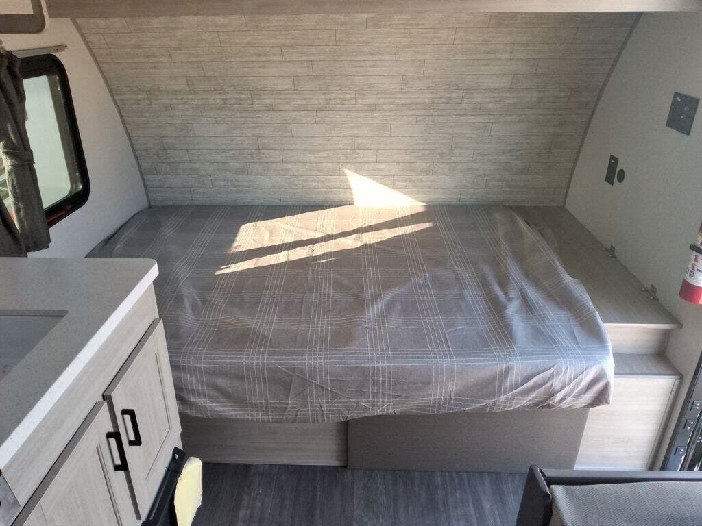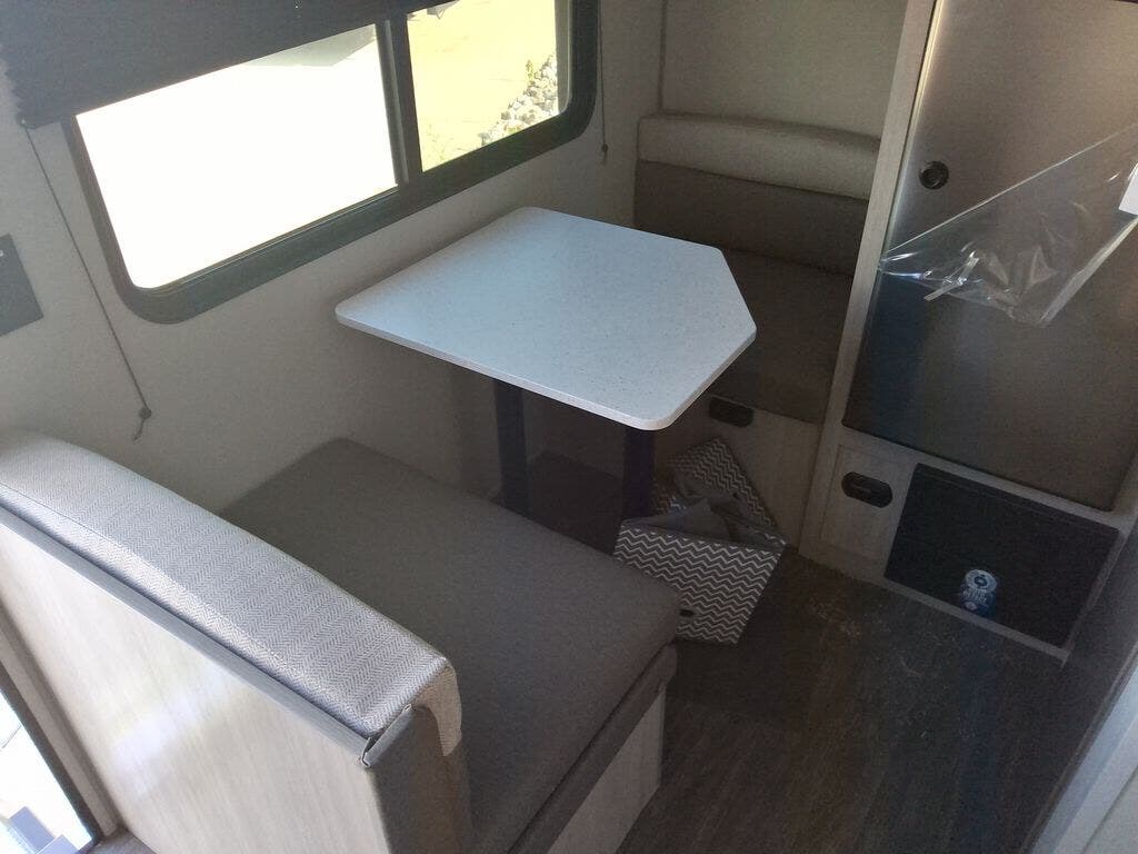 This lightweight travel trailer includes everything you need for comfortable camping trips at the lake. You can make your meals on the two burner cooktop or in the stainless steel microwave, and a 3.3 cu. ft. 12V refrigerator will keep leftovers fresh. A front queen bed provides a great night's rest, and there is a 29" booth dinette that will double as both dining and additional sleeping space. And a private bath with a 24" x 32" shower and toilet will let you easily freshen up without having to use the camp's facilities!