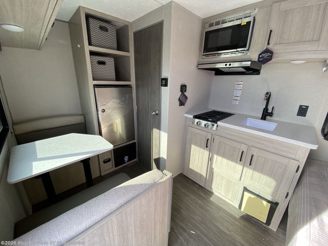 This lightweight travel trailer includes everything you need for comfortable camping trips at the lake. You can make your meals on the two burner cooktop or in the stainless steel microwave, and a 3.3 cu. ft. 12V refrigerator will keep leftovers fresh. A front queen bed provides a great night's rest, and there is a 29" booth dinette that will double as both dining and additional sleeping space. And a private bath with a 24" x 32" shower and toilet will let you easily freshen up without having to use the camp's facilities!