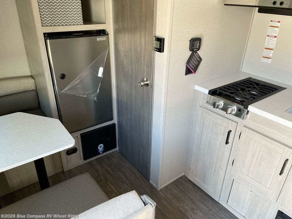 This lightweight travel trailer includes everything you need for comfortable camping trips at the lake. You can make your meals on the two burner cooktop or in the stainless steel microwave, and a 3.3 cu. ft. 12V refrigerator will keep leftovers fresh. A front queen bed provides a great night's rest, and there is a 29" booth dinette that will double as both dining and additional sleeping space. And a private bath with a 24" x 32" shower and toilet will let you easily freshen up without having to use the camp's facilities!
