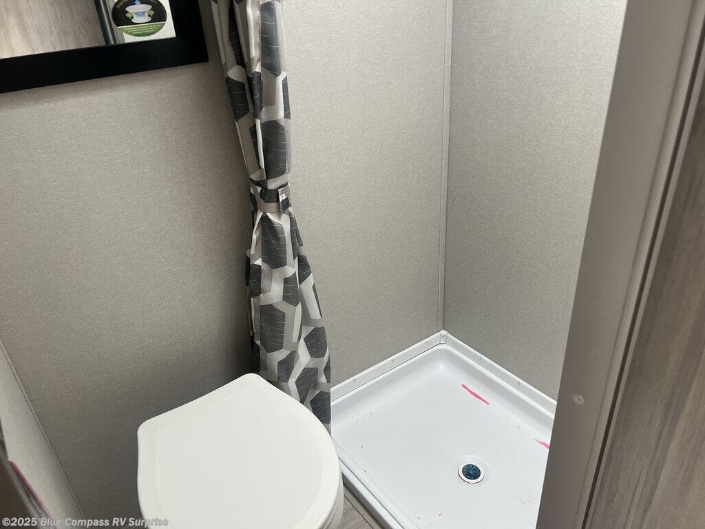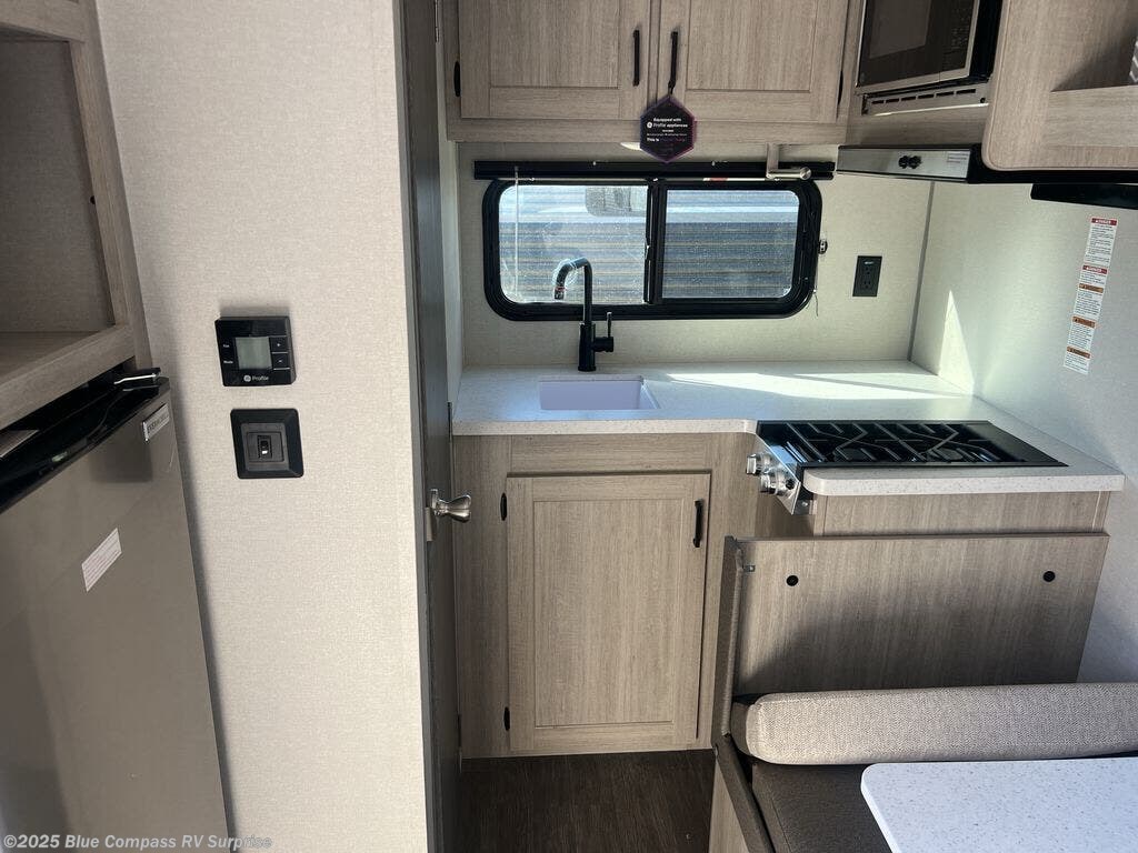This lightweight travel trailer includes everything you need for comfortable camping trips at the lake. A front queen bed provides a great night's rest, and there is a 60" jack knife sofa for an overnight guest. You'll appreciate the bedroom storage and overhead shelf, along with an overhead shelf with bins over the sofa to keep your space tidy. The rear corner kitchen includes a two burner gas range and microwave oven, and the private bath is conveniently located in the other rear corner!