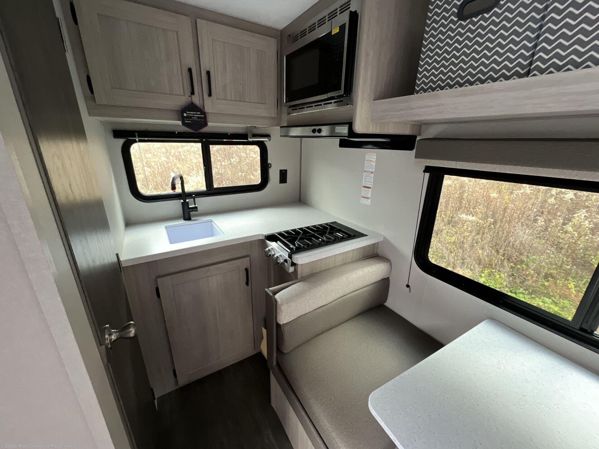 This lightweight travel trailer includes everything you need for comfortable camping trips at the lake. A front queen bed provides a great night's rest, and there is a 60" jack knife sofa for an overnight guest. You'll appreciate the bedroom storage and overhead shelf, along with an overhead shelf with bins over the sofa to keep your space tidy. The rear corner kitchen includes a two burner gas range and microwave oven, and the private bath is conveniently located in the other rear corner!