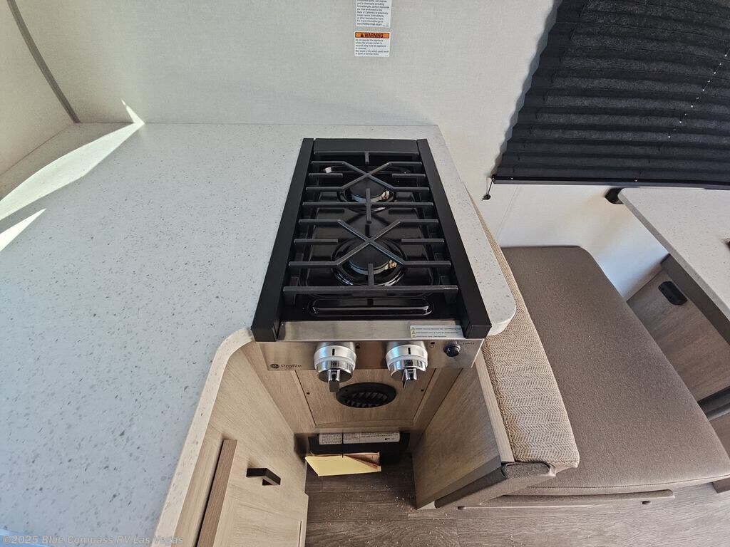 This lightweight travel trailer includes everything you need for comfortable camping trips at the lake. A front queen bed provides a great night's rest, and there is a 60" jack knife sofa for an overnight guest. You'll appreciate the bedroom storage and overhead shelf, along with an overhead shelf with bins over the sofa to keep your space tidy. The rear corner kitchen includes a two burner gas range and microwave oven, and the private bath is conveniently located in the other rear corner!