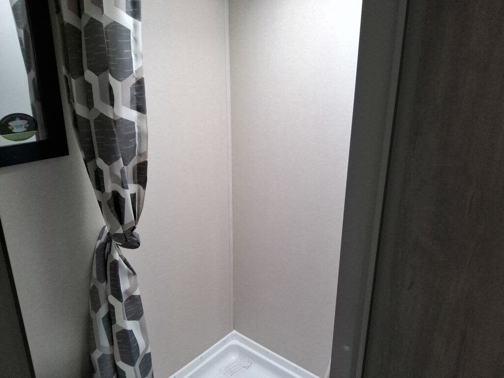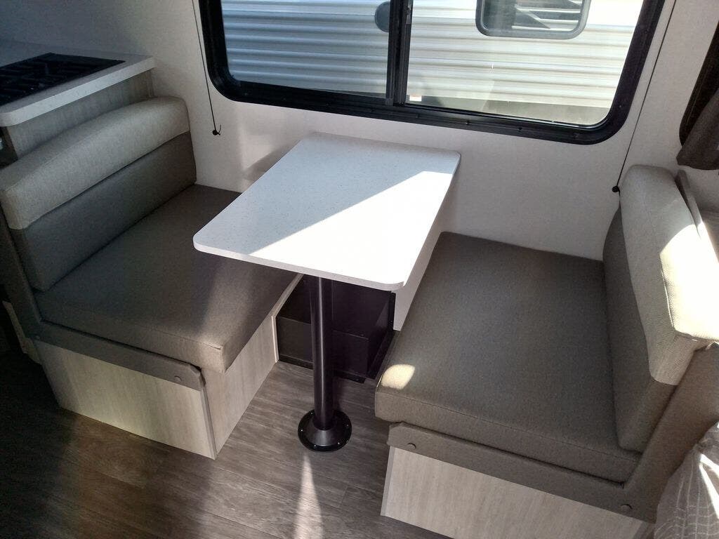 This lightweight travel trailer includes everything you need for comfortable camping trips at the lake. A front queen bed provides a great night's rest, and there is a 60" jack knife sofa for an overnight guest. You'll appreciate the bedroom storage and overhead shelf, along with an overhead shelf with bins over the sofa to keep your space tidy. The rear corner kitchen includes a two burner gas range and microwave oven, and the private bath is conveniently located in the other rear corner!