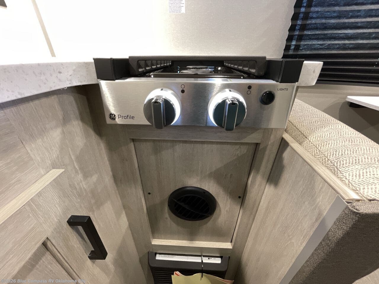 This lightweight travel trailer includes everything you need for comfortable camping trips at the lake. A front queen bed provides a great night's rest, and there is a 60" jack knife sofa for an overnight guest. You'll appreciate the bedroom storage and overhead shelf, along with an overhead shelf with bins over the sofa to keep your space tidy. The rear corner kitchen includes a two burner gas range and microwave oven, and the private bath is conveniently located in the other rear corner!