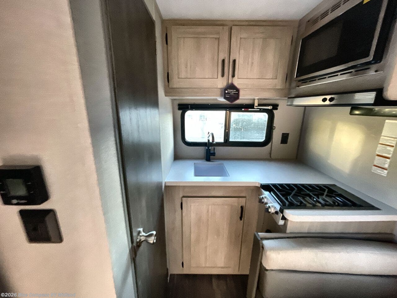 This lightweight travel trailer includes everything you need for comfortable camping trips at the lake. A front queen bed provides a great night's rest, and there is a 60" jack knife sofa for an overnight guest. You'll appreciate the bedroom storage and overhead shelf, along with an overhead shelf with bins over the sofa to keep your space tidy. The rear corner kitchen includes a two burner gas range and microwave oven, and the private bath is conveniently located in the other rear corner!