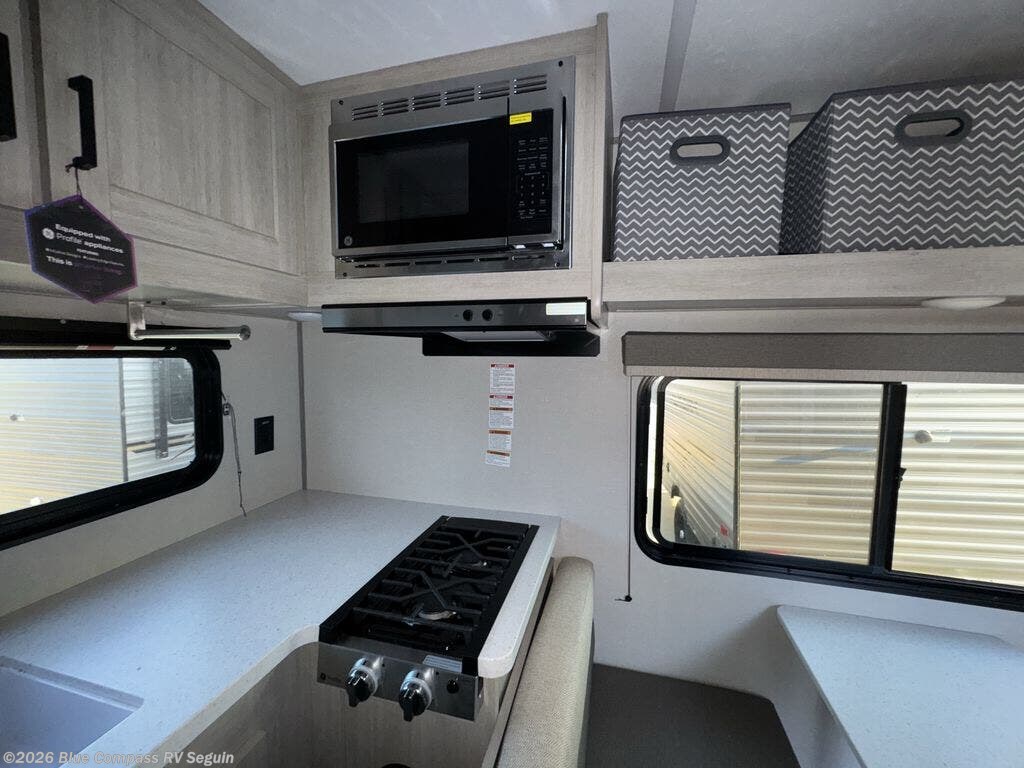 This lightweight travel trailer includes everything you need for comfortable camping trips at the lake. A front queen bed provides a great night's rest, and there is a 60" jack knife sofa for an overnight guest. You'll appreciate the bedroom storage and overhead shelf, along with an overhead shelf with bins over the sofa to keep your space tidy. The rear corner kitchen includes a two burner gas range and microwave oven, and the private bath is conveniently located in the other rear corner!