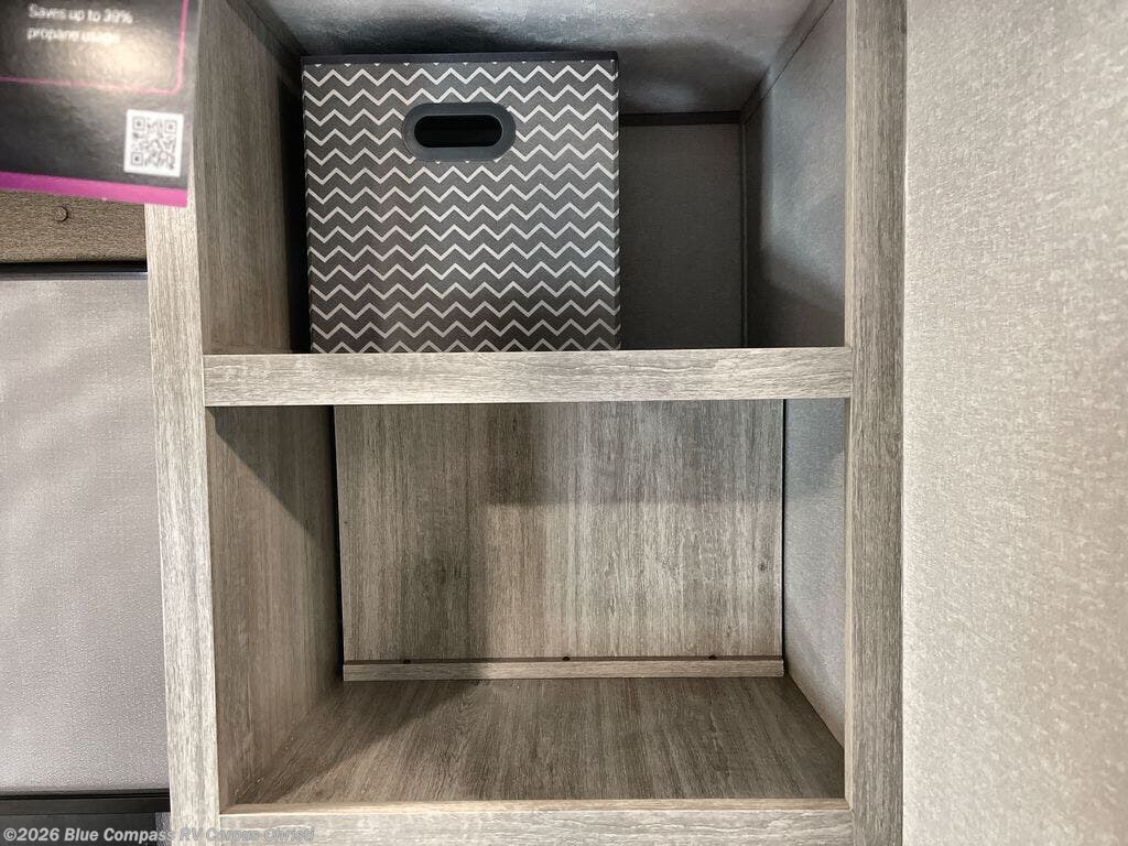This lightweight travel trailer includes everything you need for comfortable camping trips at the lake. A front queen bed provides a great night's rest, and there is a 60" jack knife sofa for an overnight guest. You'll appreciate the bedroom storage and overhead shelf, along with an overhead shelf with bins over the sofa to keep your space tidy. The rear corner kitchen includes a two burner gas range and microwave oven, and the private bath is conveniently located in the other rear corner!