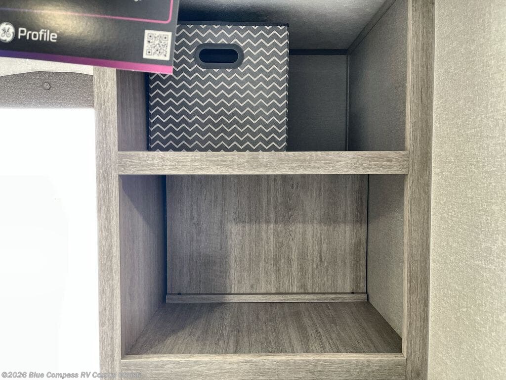 This lightweight travel trailer includes everything you need for comfortable camping trips at the lake. A front queen bed provides a great night's rest, and there is a 60" jack knife sofa for an overnight guest. You'll appreciate the bedroom storage and overhead shelf, along with an overhead shelf with bins over the sofa to keep your space tidy. The rear corner kitchen includes a two burner gas range and microwave oven, and the private bath is conveniently located in the other rear corner!