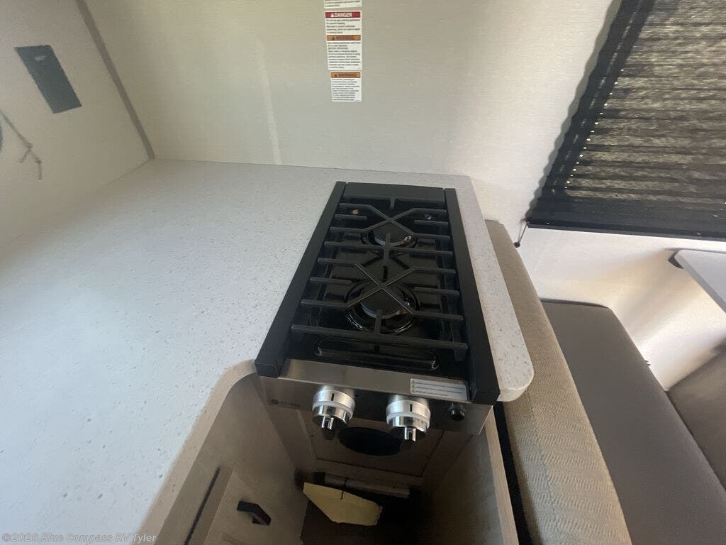 This lightweight travel trailer includes everything you need for comfortable camping trips at the lake. A front queen bed provides a great night's rest, and there is a 60" jack knife sofa for an overnight guest. You'll appreciate the bedroom storage and overhead shelf, along with an overhead shelf with bins over the sofa to keep your space tidy. The rear corner kitchen includes a two burner gas range and microwave oven, and the private bath is conveniently located in the other rear corner!