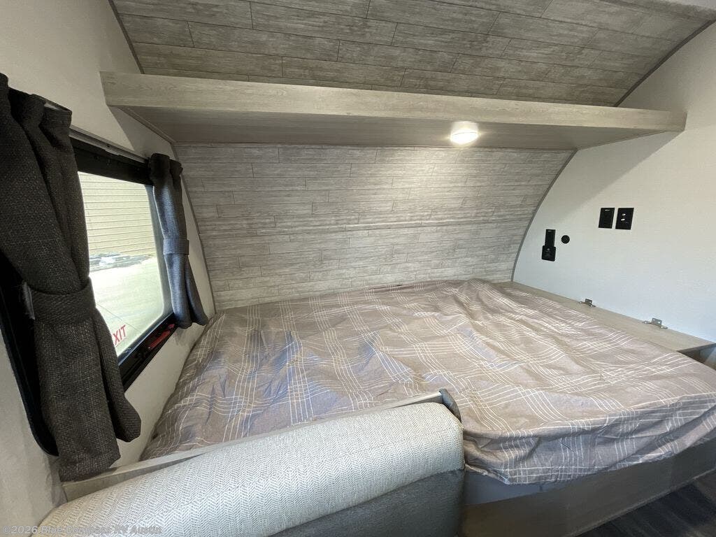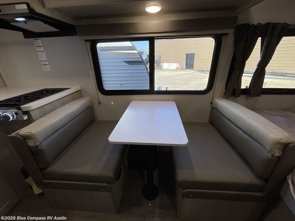 This lightweight travel trailer includes everything you need for comfortable camping trips at the lake. A front queen bed provides a great night's rest, and there is a booth dinette ideal to share meals. You'll appreciate the bedroom storage and overhead shelf, along with an overhead shelf with bins over the sofa to keep your space tidy. The rear corner kitchen includes a two burner gas range and microwave oven, and the private bath is conveniently located in the other rear corner!