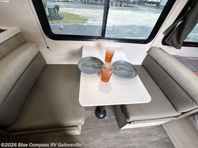 This lightweight travel trailer includes everything you need for comfortable camping trips at the lake. A front queen bed provides a great night's rest, and there is a booth dinette ideal to share meals. You'll appreciate the bedroom storage and overhead shelf, along with an overhead shelf with bins over the sofa to keep your space tidy. The rear corner kitchen includes a two burner gas range and microwave oven, and the private bath is conveniently located in the other rear corner!