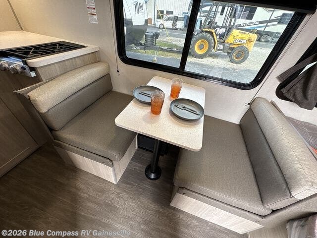 This lightweight travel trailer includes everything you need for comfortable camping trips at the lake. A front queen bed provides a great night's rest, and there is a booth dinette ideal to share meals. You'll appreciate the bedroom storage and overhead shelf, along with an overhead shelf with bins over the sofa to keep your space tidy. The rear corner kitchen includes a two burner gas range and microwave oven, and the private bath is conveniently located in the other rear corner!