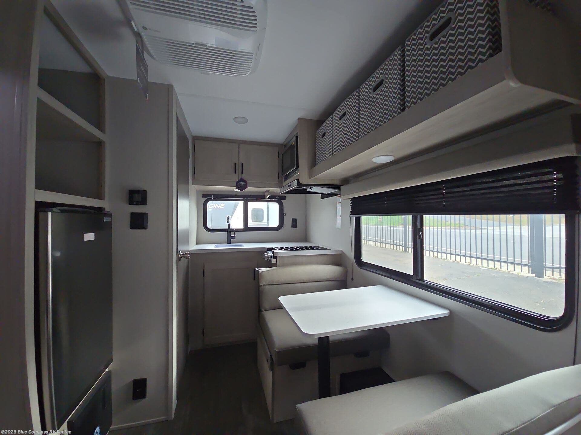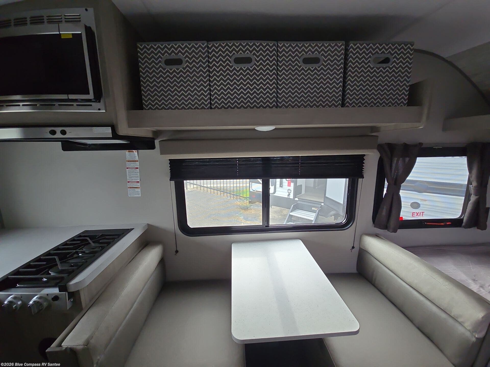 This lightweight travel trailer includes everything you need for comfortable camping trips at the lake. A front queen bed provides a great night's rest, and there is a booth dinette ideal to share meals. You'll appreciate the bedroom storage and overhead shelf, along with an overhead shelf with bins over the sofa to keep your space tidy. The rear corner kitchen includes a two burner gas range and microwave oven, and the private bath is conveniently located in the other rear corner!
