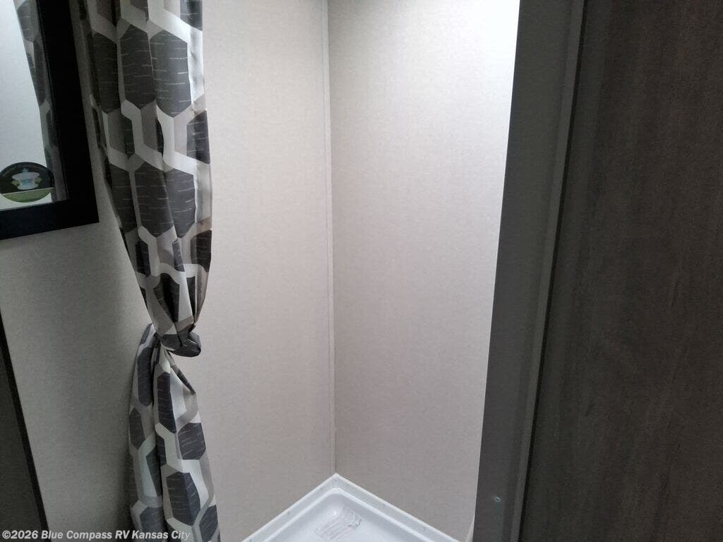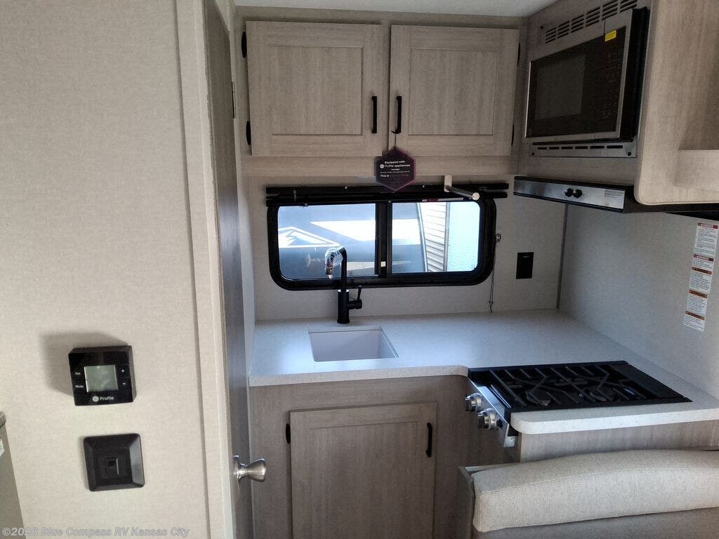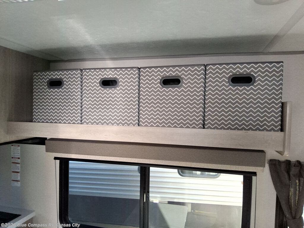 This lightweight travel trailer includes everything you need for comfortable camping trips at the lake. A front queen bed provides a great night's rest, and there is a 60" jack knife sofa for an overnight guest. You'll appreciate the bedroom storage and overhead shelf, along with an overhead shelf with bins over the sofa to keep your space tidy. The rear corner kitchen includes a two burner gas range and microwave oven, and the private bath is conveniently located in the other rear corner!