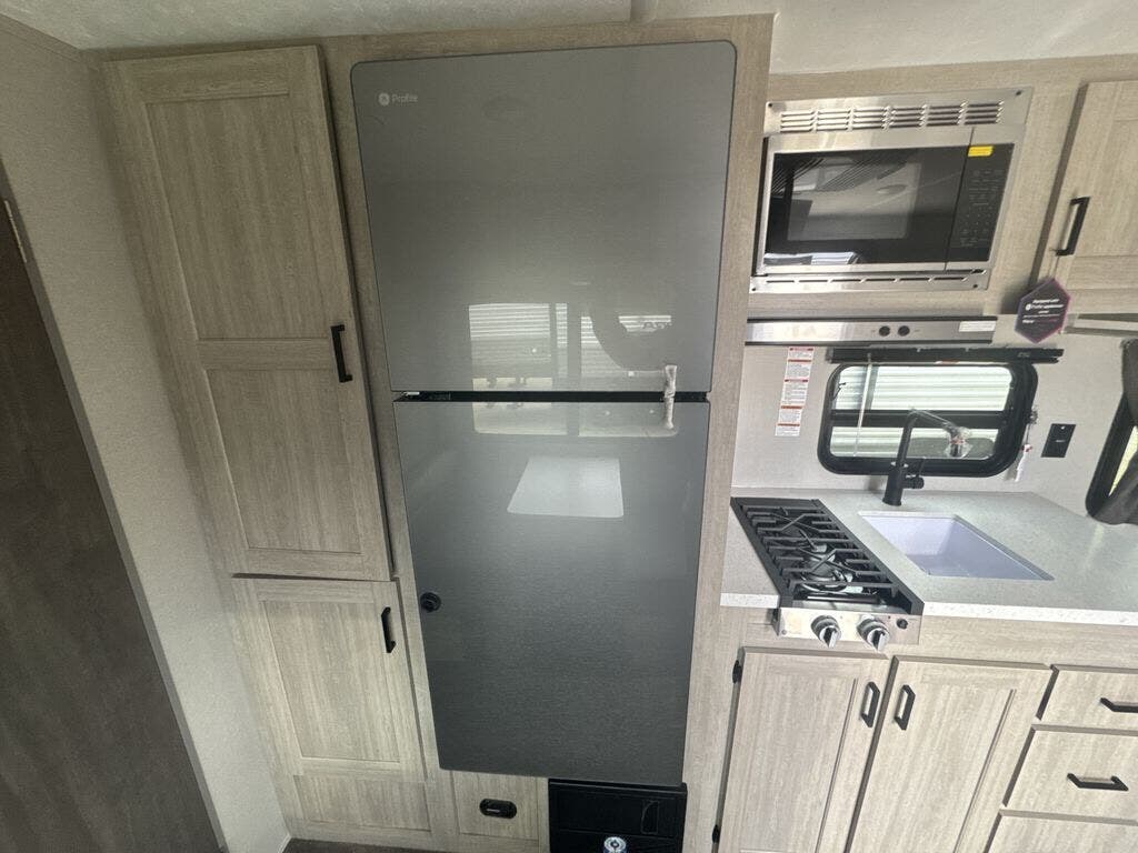 Comfortability, usability, and quality is what you will find in each one of these Forest River Aurora Light travel trailers! They are designed with a superior build and packed full with industry leading, functional, and distinctive standard features. The diamond plate rock guard will protect your unit from road debris and the nitrogen filled radial tires, which keep their pressure longer, offer better fuel economy. You will also find upgraded JBL Elite exterior speaker outside, an electric awning with multicolor lights and remote, plus flush mount baggage doors for easy packing. The interiors are beautifully designed with matte black kitchen and bath faucets, black nightshades in the living room, and GE kitchen appliances!