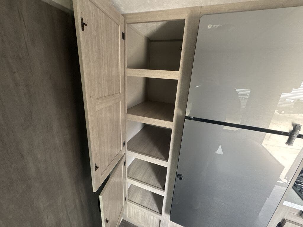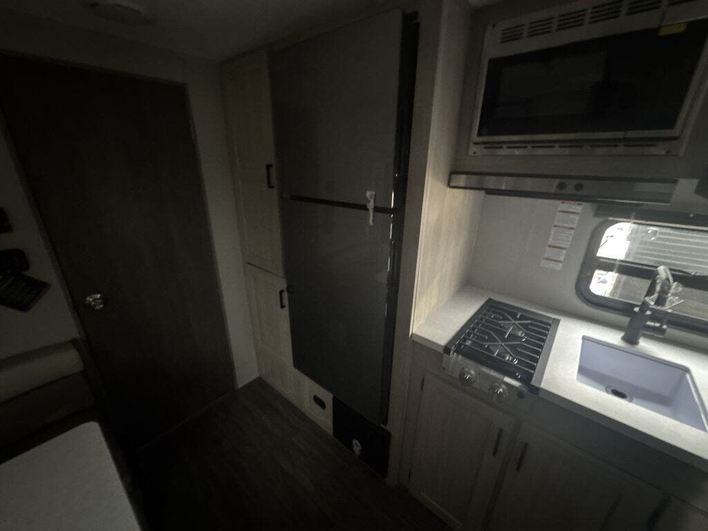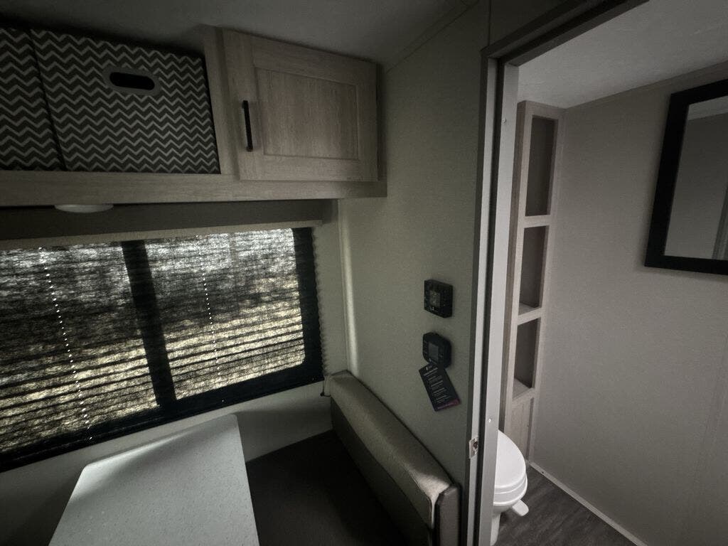 This cozy couples trailer with a queen bed is the perfect travel companion! You will have a queen bed up front to sleep on each night. The booth dinette, just to the left of the entry door, is a great place to enjoy meal and your morning cup of coffee! Use the two burner cooktop and microwave oven to create camp meals inside. This model includes plenty of storage space, including a large overhead in front, nightstands on either side of the sofa, a pantry for dry goods and snacks, and a linen cabinet in the rear bath that also offers a 36" x 30" shower, toilet and shelf for towels and such. There is even storage beneath the bar top as well.