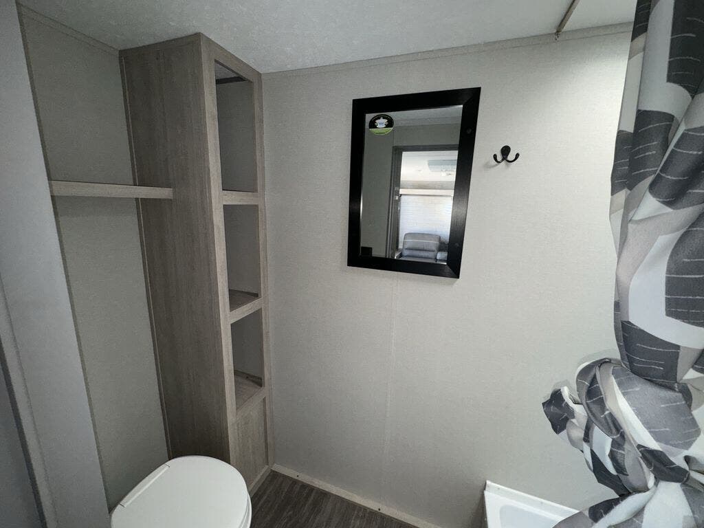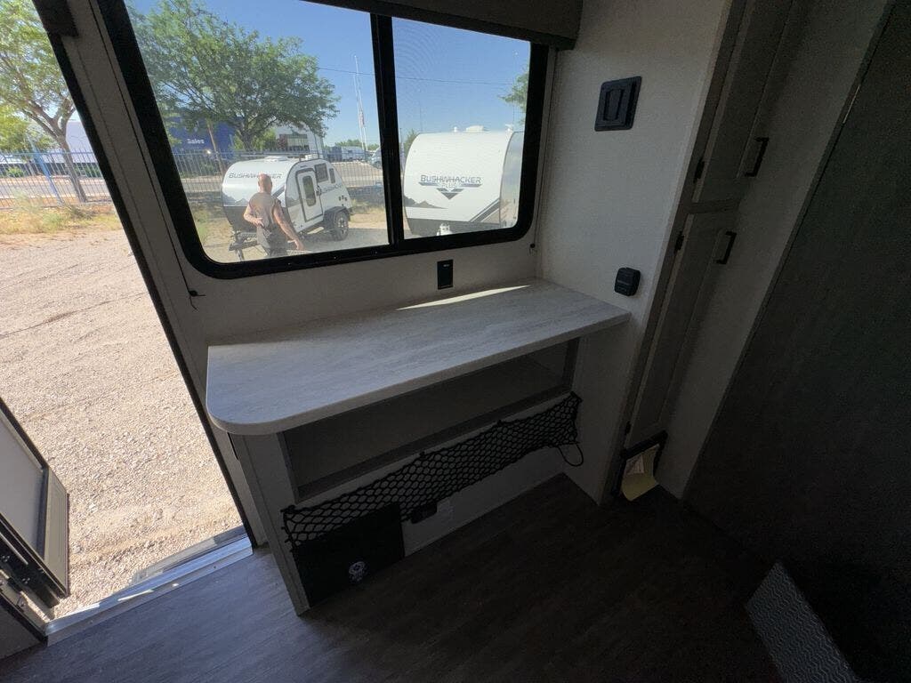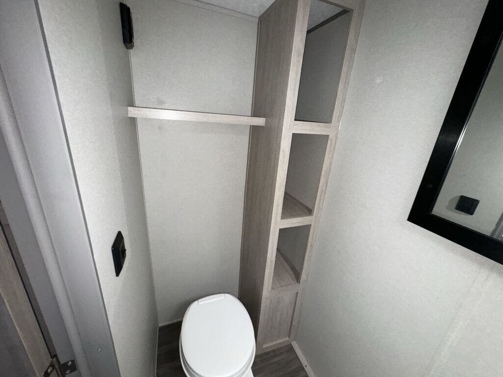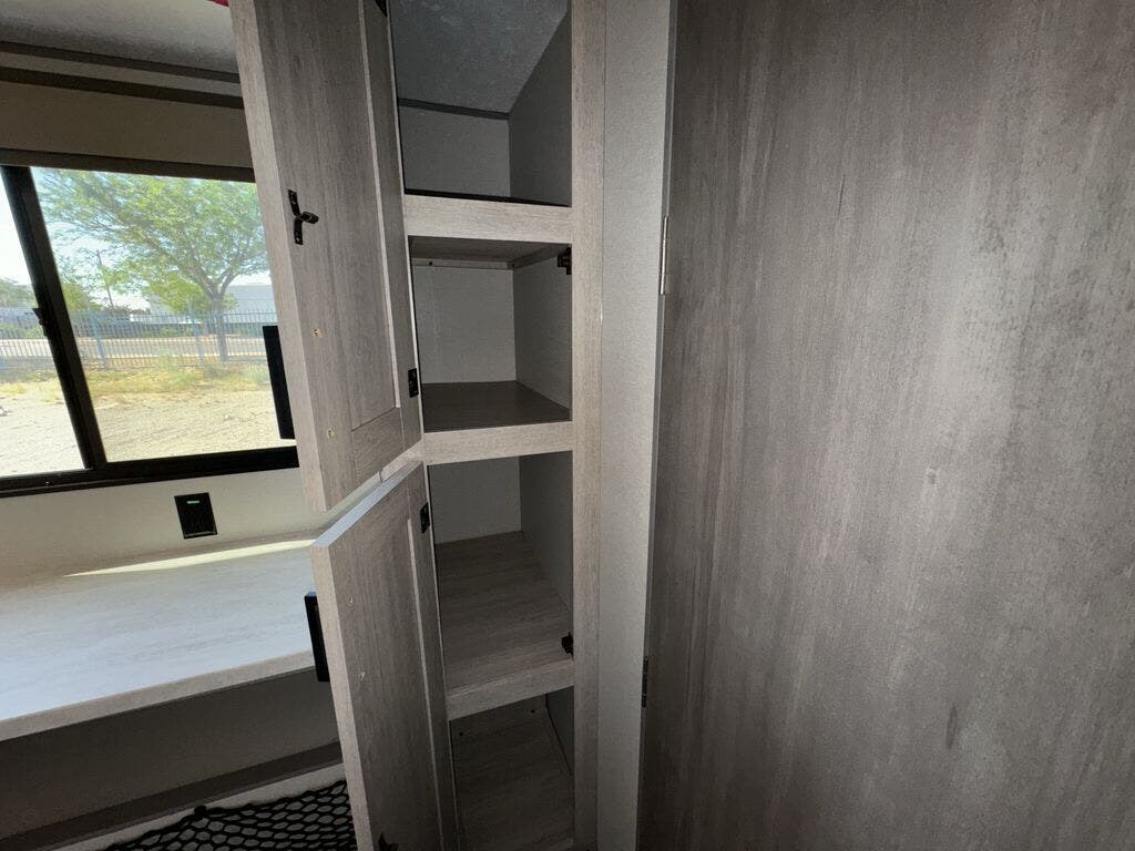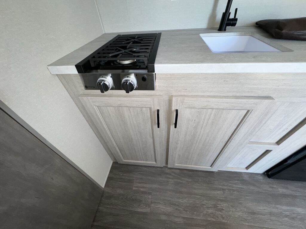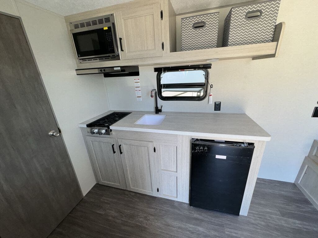 This cozy couples trailer with a queen bed is the perfect travel companion! You will have a queen bed up front to sleep on each night. The booth dinette, just to the left of the entry door, is a great place to enjoy meal and your morning cup of coffee! Use the two burner cooktop and microwave oven to create camp meals inside. This model includes plenty of storage space, including a large overhead in front, nightstands on either side of the sofa, a pantry for dry goods and snacks, and a linen cabinet in the rear bath that also offers a 36" x 30" shower, toilet and shelf for towels and such. There is even storage beneath the bar top as well.