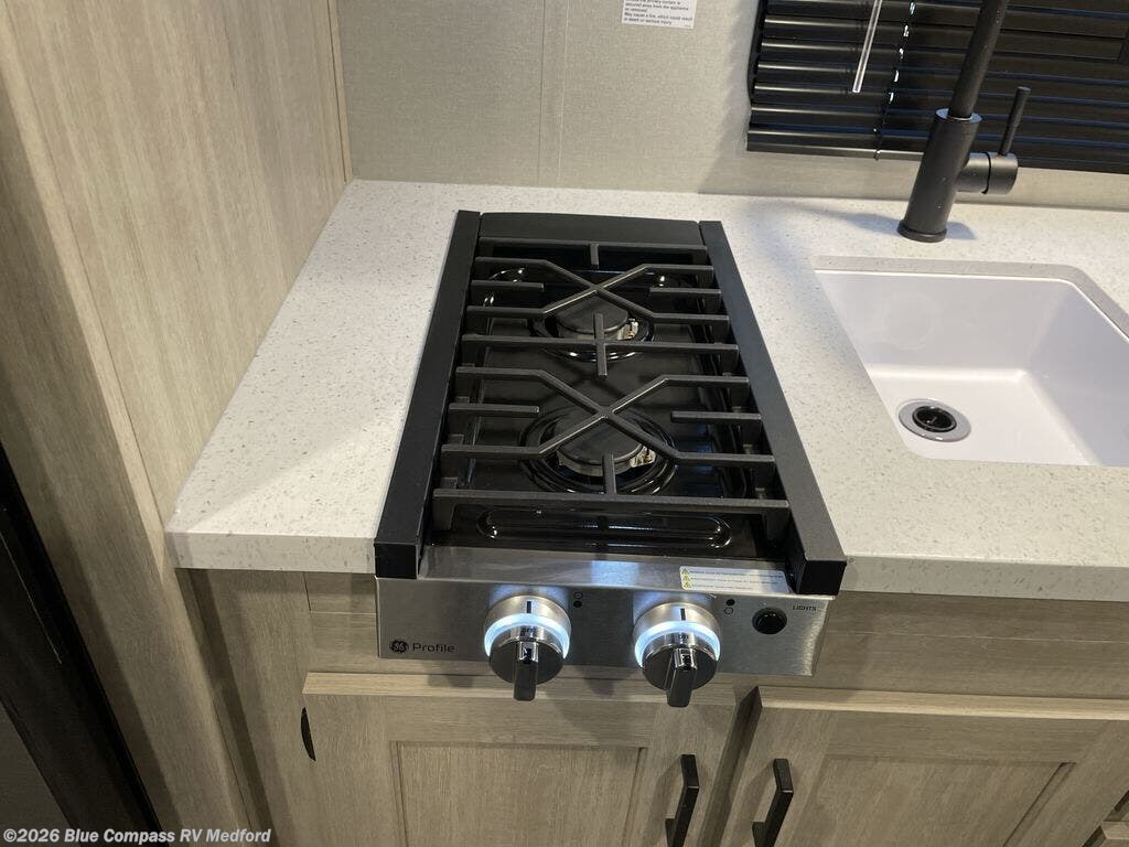 This cozy couples trailer with a queen bed is the perfect travel companion! You will have a queen bed up front to sleep on each night. The booth dinette, just to the left of the entry door, is a great place to enjoy meal and your morning cup of coffee! Use the two burner cooktop and microwave oven to create camp meals inside. This model includes plenty of storage space, including a large overhead in front, nightstands on either side of the sofa, a pantry for dry goods and snacks, and a linen cabinet in the rear bath that also offers a 36" x 30" shower, toilet and shelf for towels and such. There is even storage beneath the bar top as well.